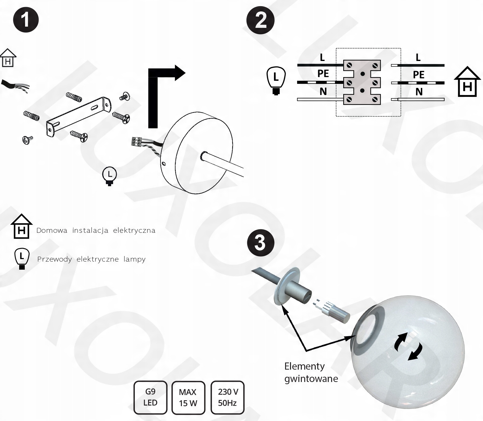Zestaw nie zawiera żarówek, a także kołków rozporowych (należy dobrać odpowiednie do sufitu).
