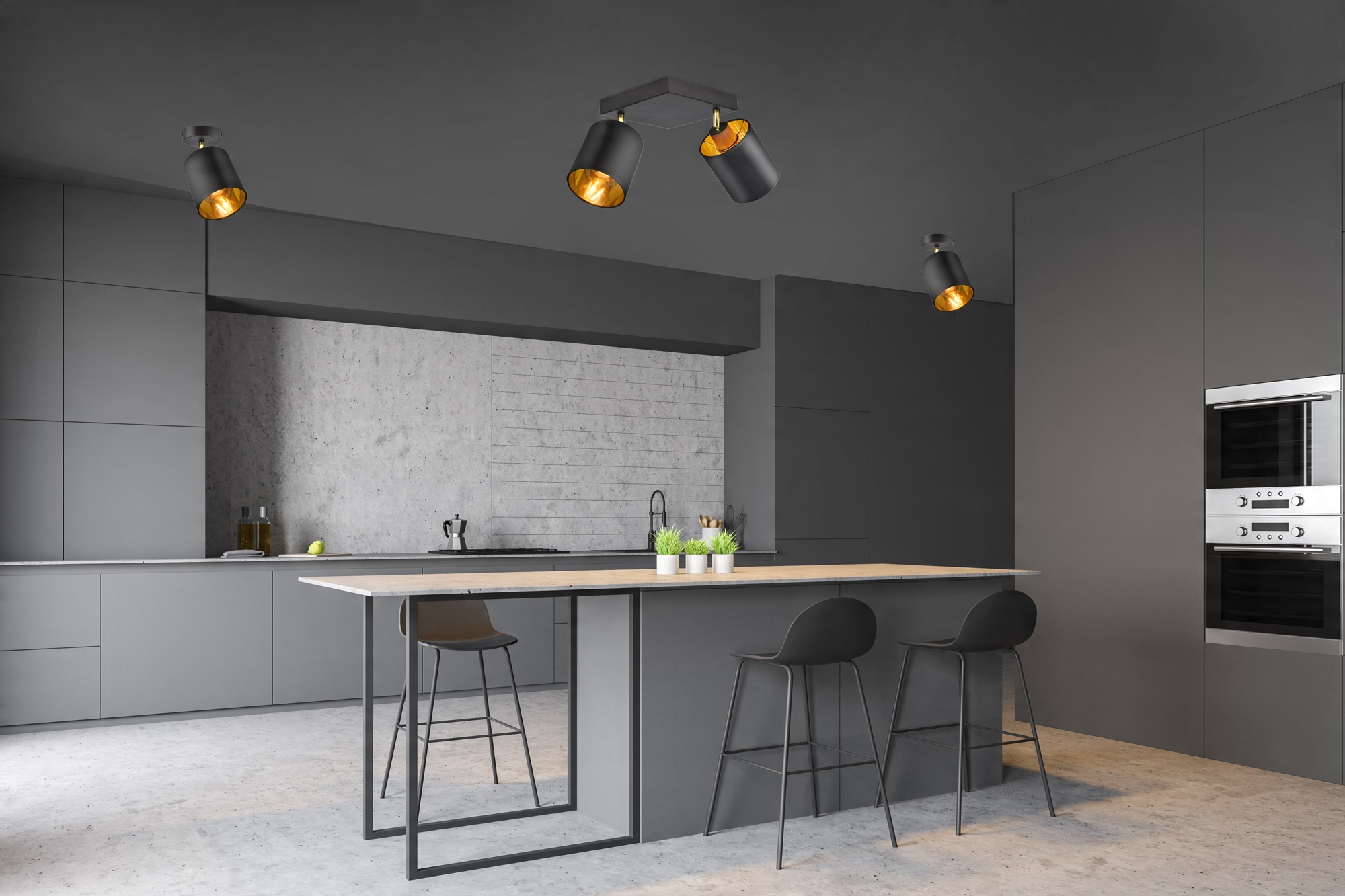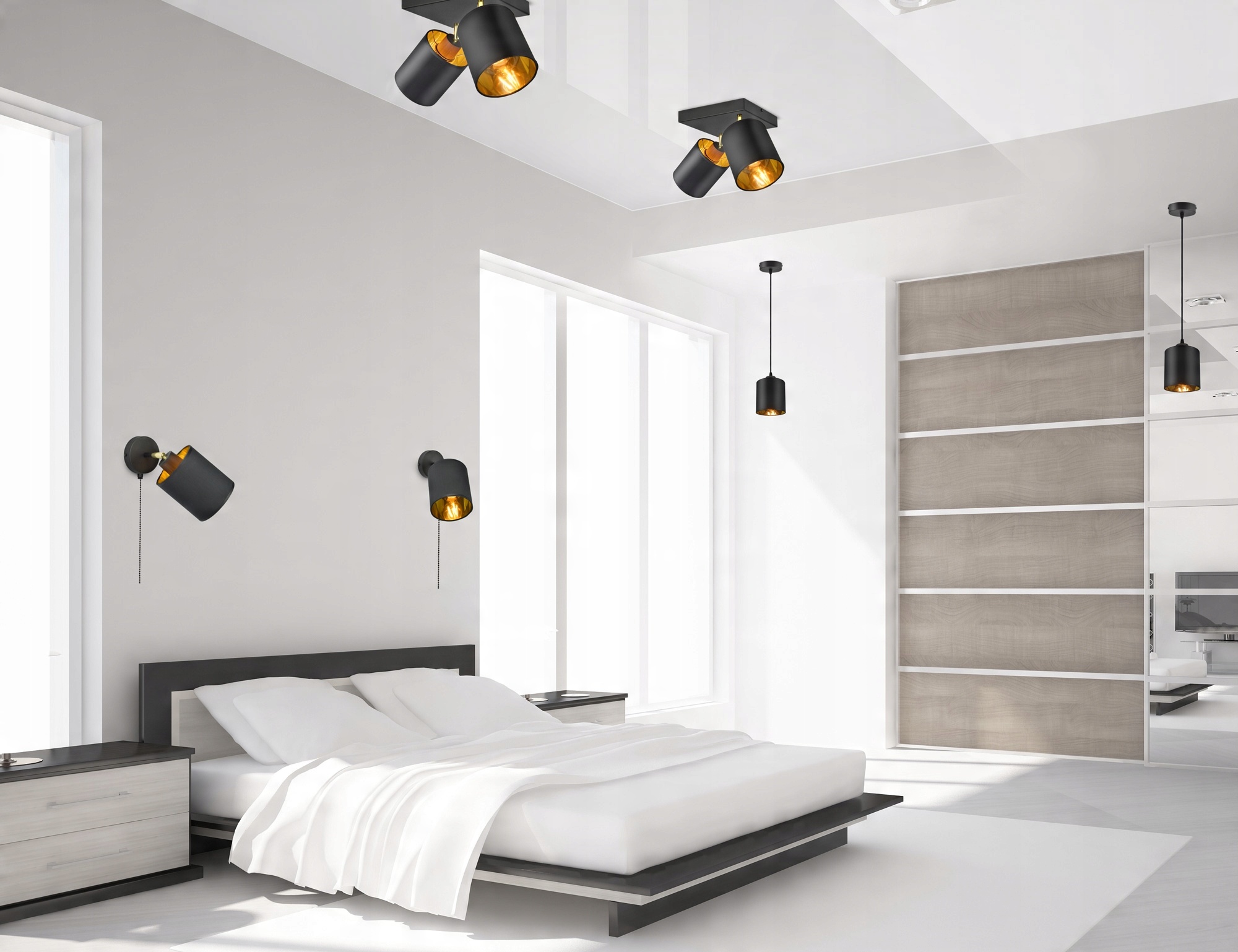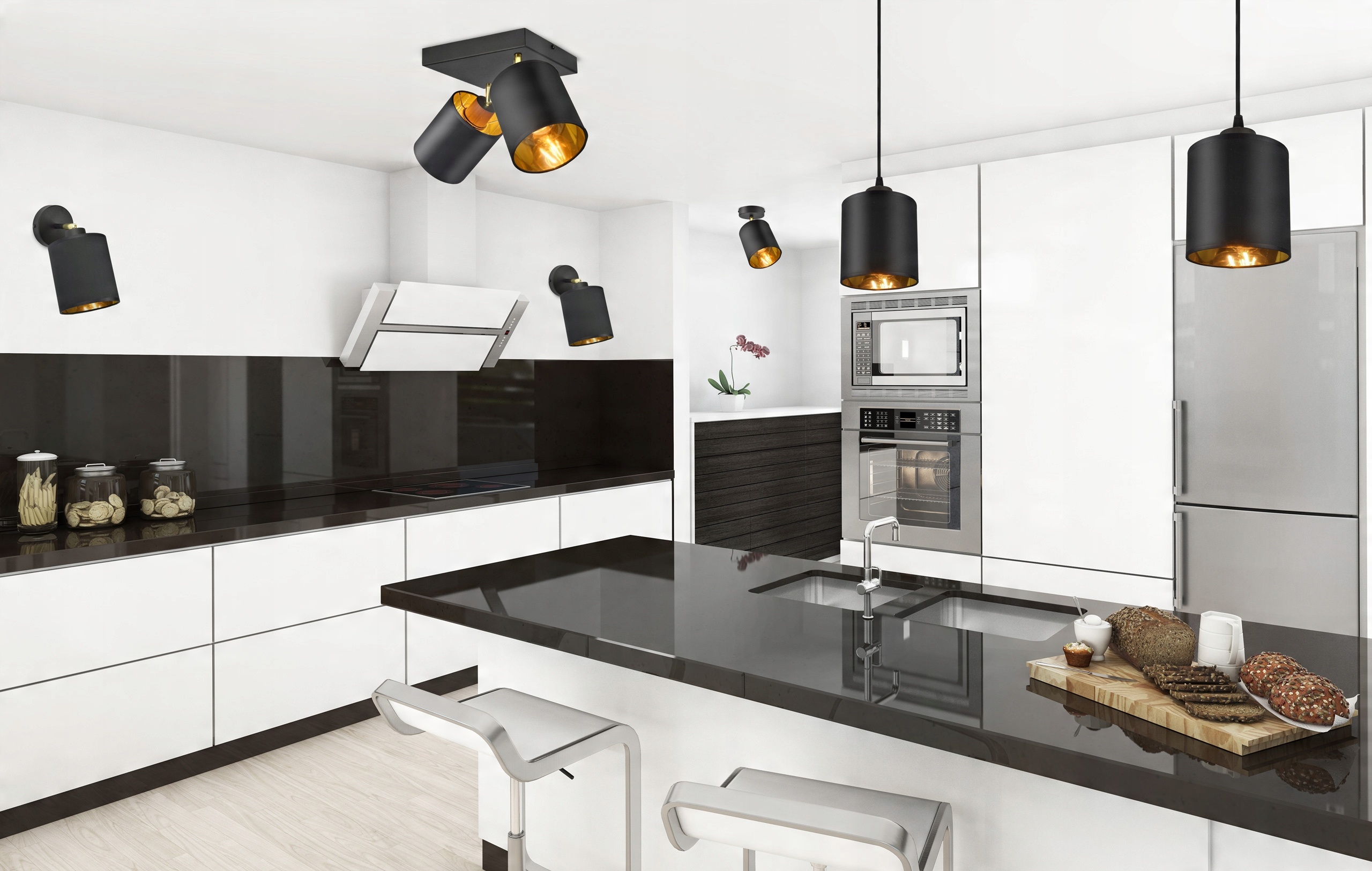 Czarna konstrukcja i abażury ze złotymi elementami to świetne połączenie w nowoczesnych wnętrzach.