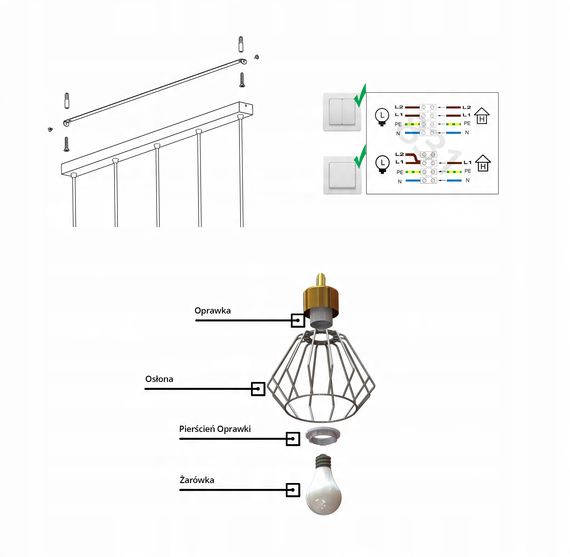 Zestaw nie zawiera żarówek ani kołków rozporowych (należy dobrać odpowiednie do sufitu)