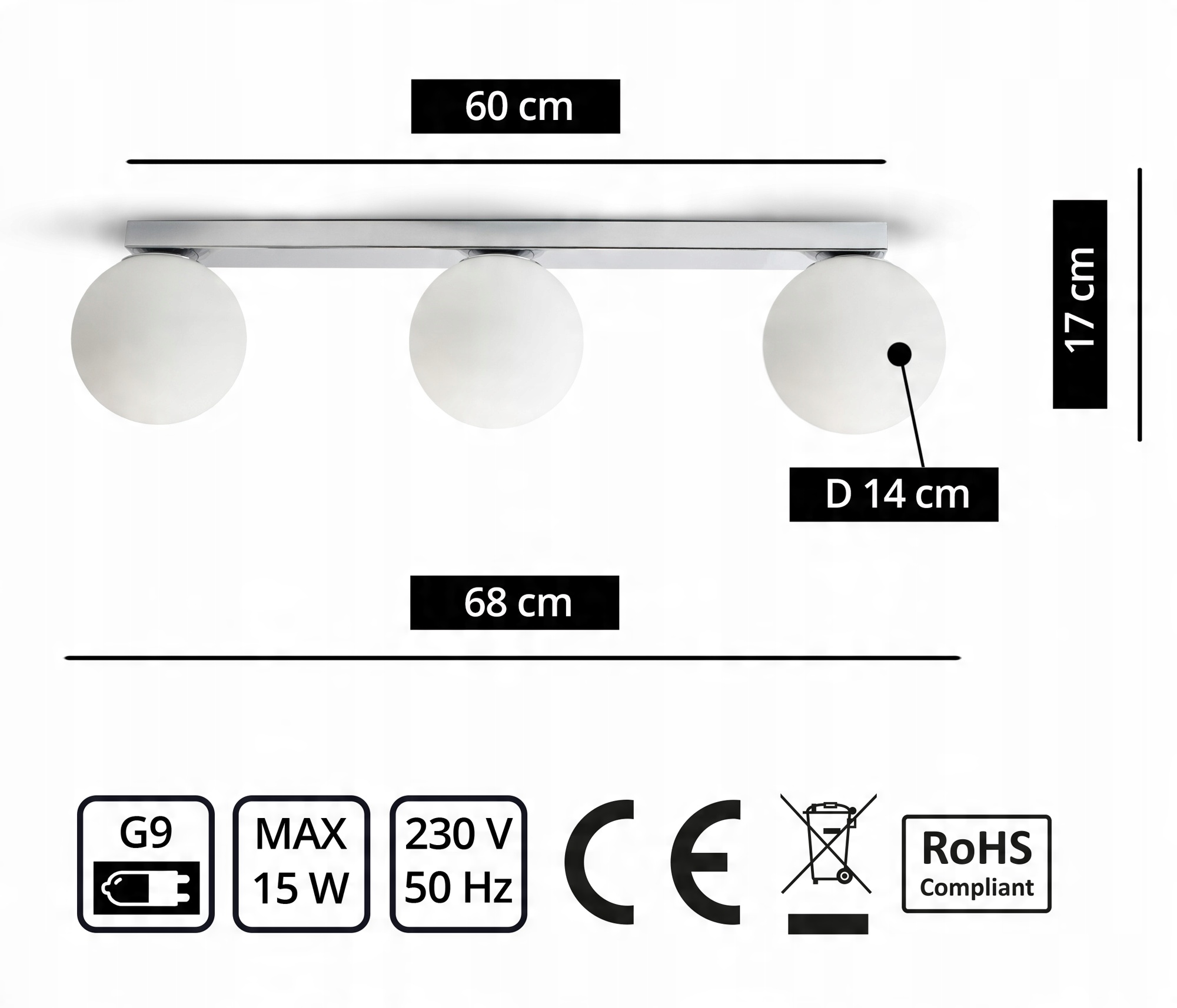 Zestaw nie zawiera żarówek, a także kołków rozporowych (należy dobrać odpowiednie do sufitu).