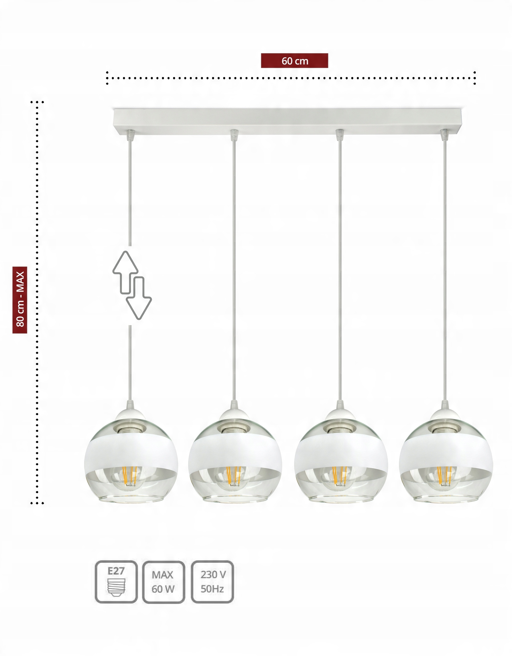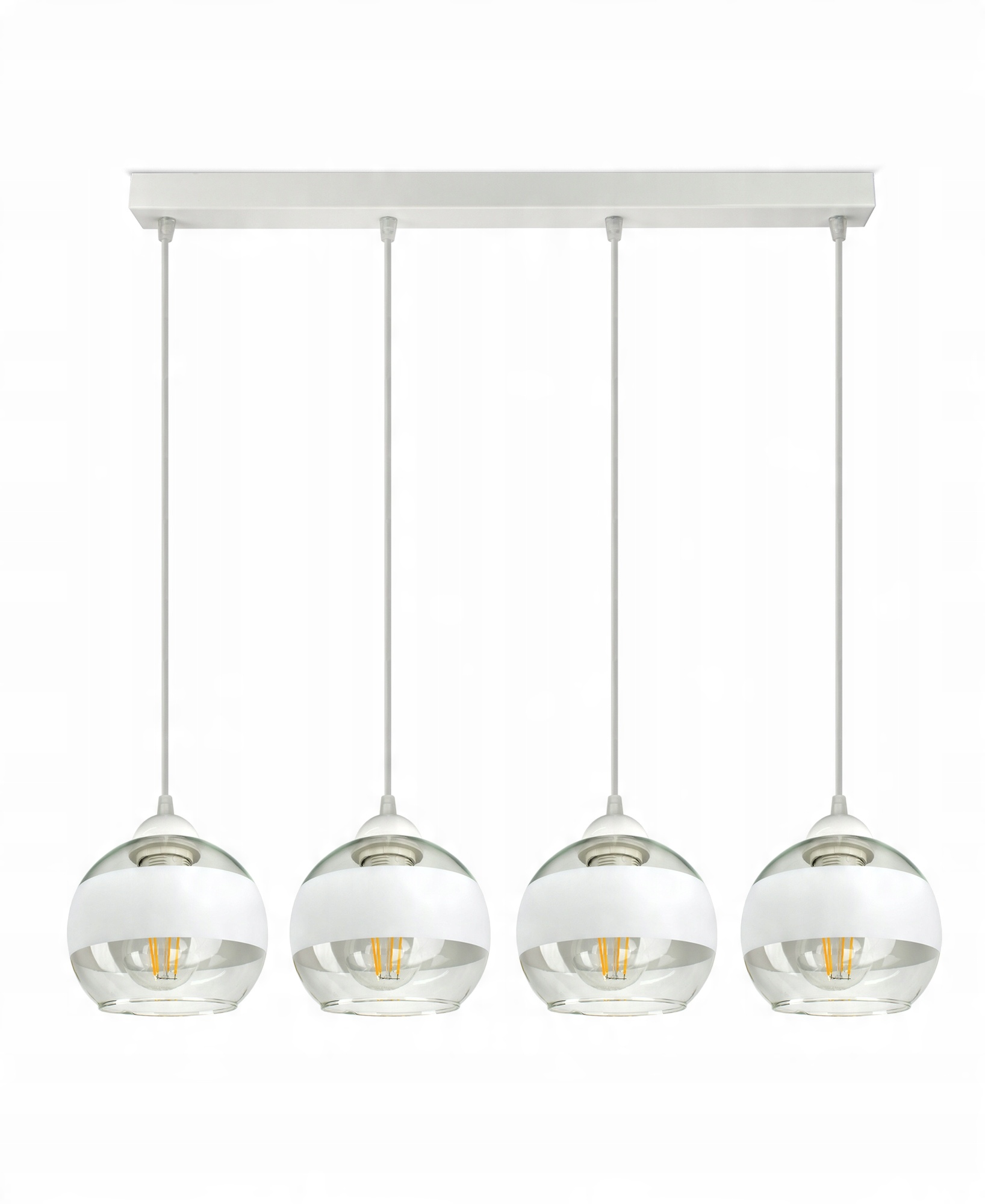 ✅ Lampa wyposażona w szklane klosze w kształcie kuli z białym pasem w części centralnej.