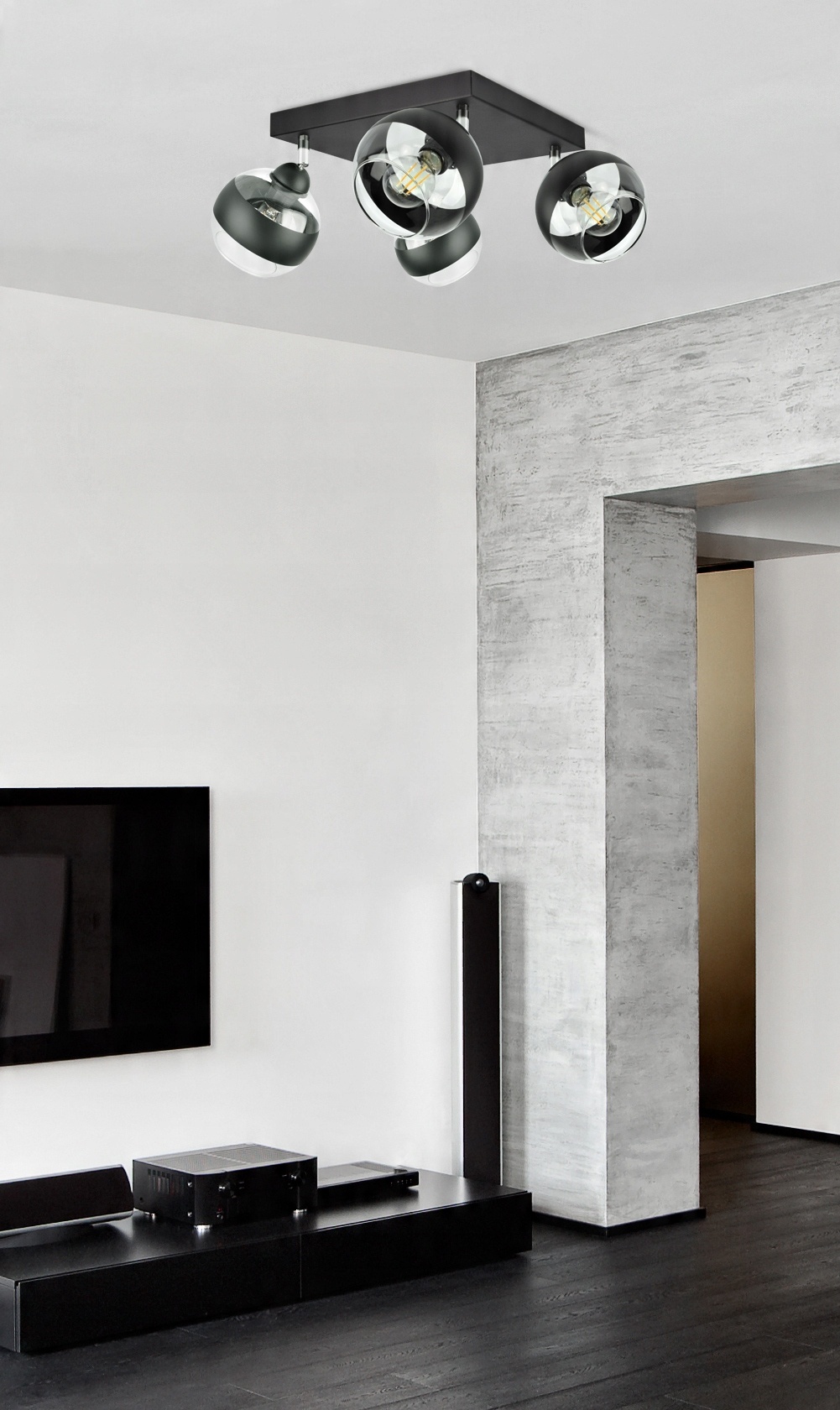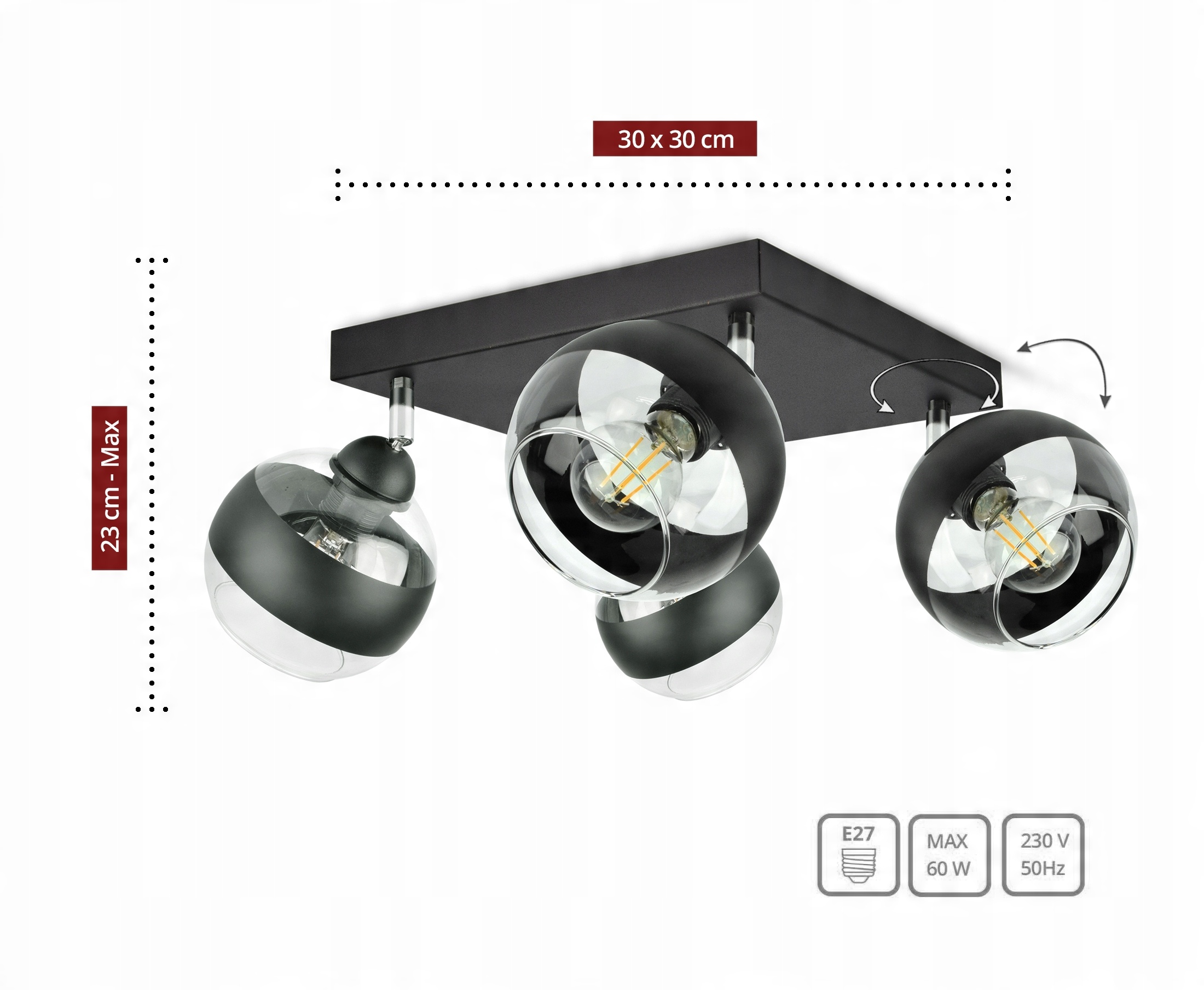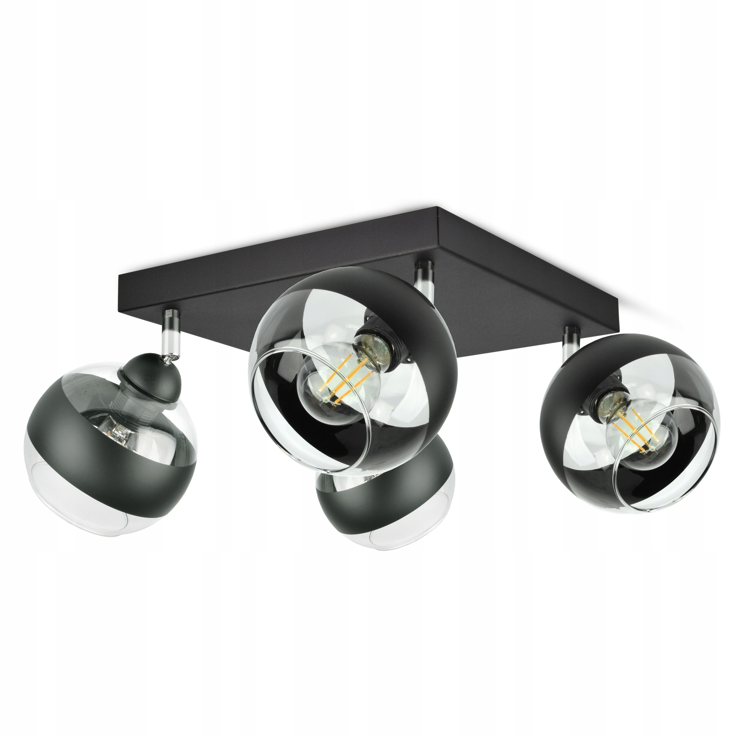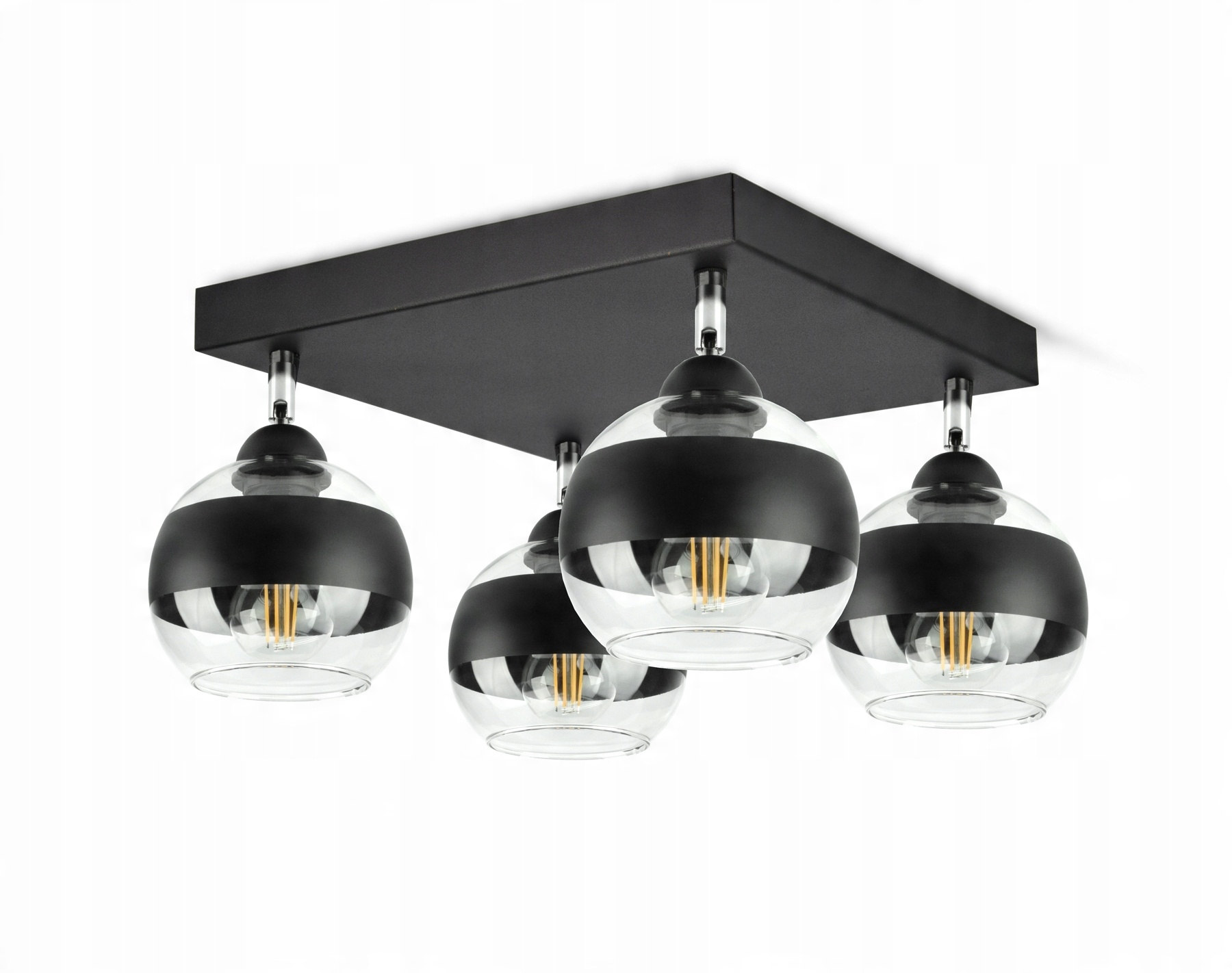 ✅ Lampa wyposażona w szklane klosze w kształcie kuli z czarnym pasem w części centralnej.
