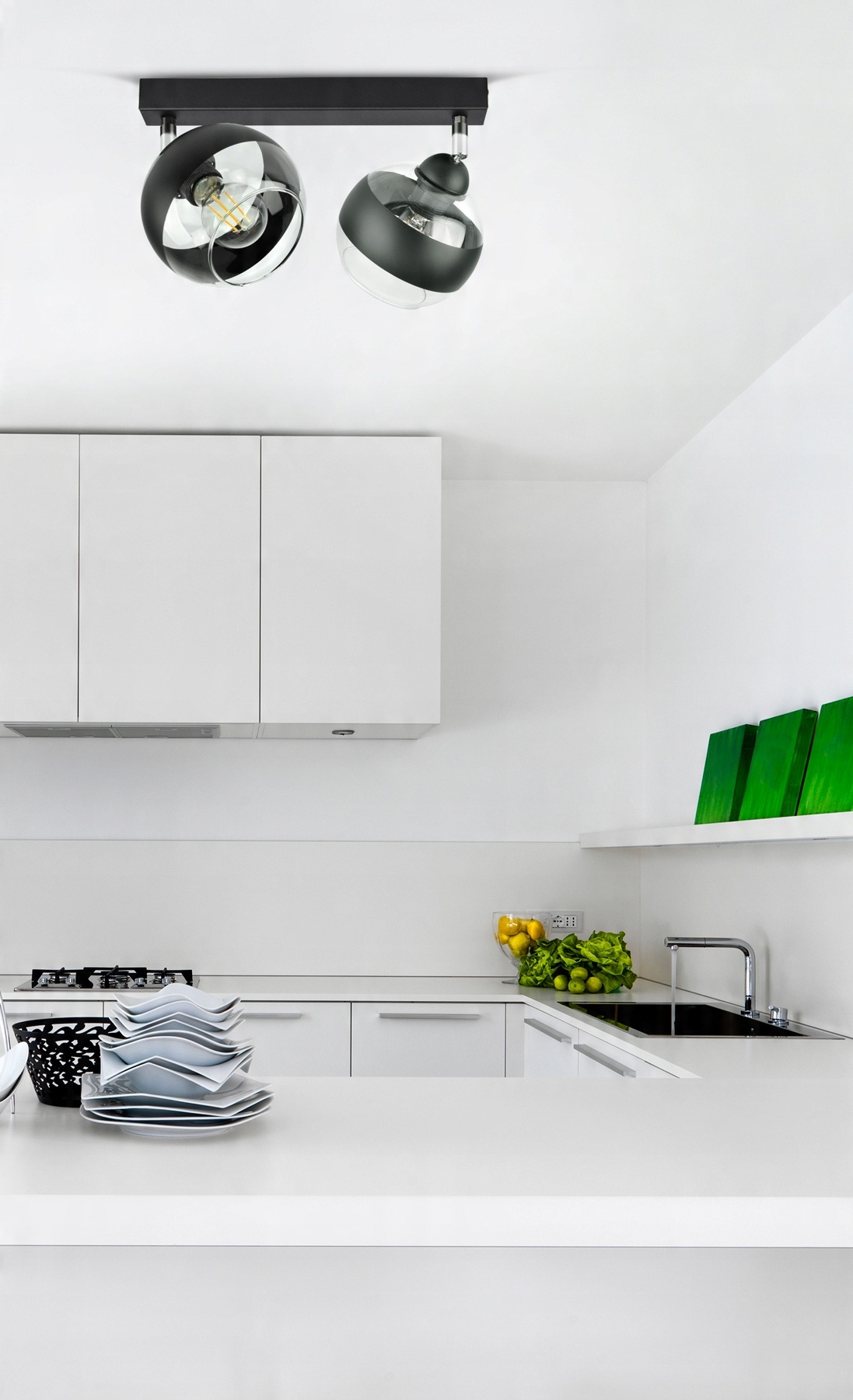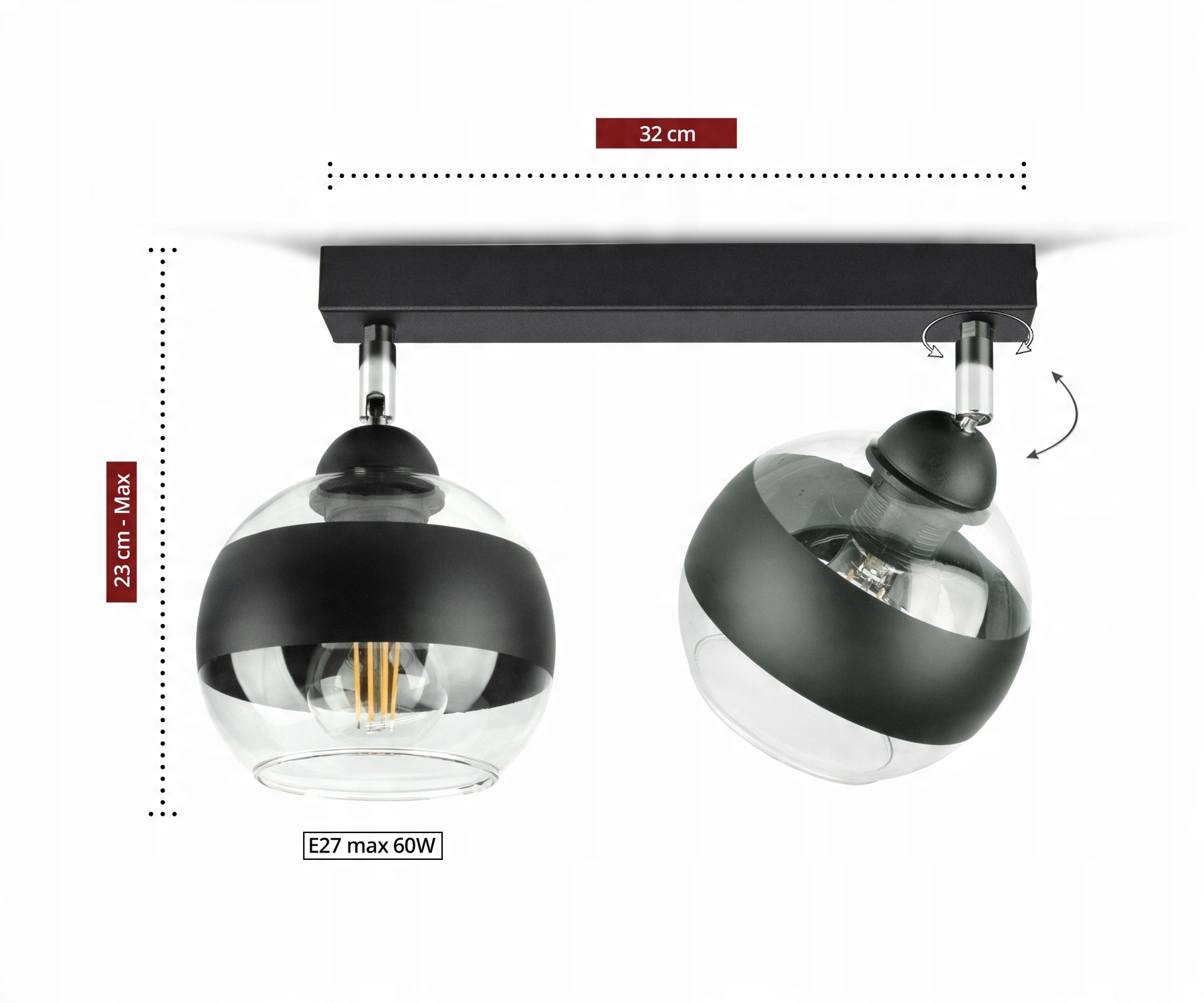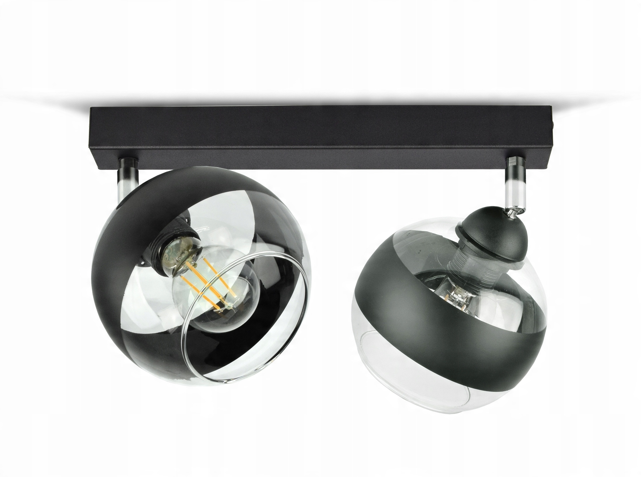 ✅ Lampa wyposażona w szklane klosze w kształcie kuli z czarnym pasem w części centralnej.