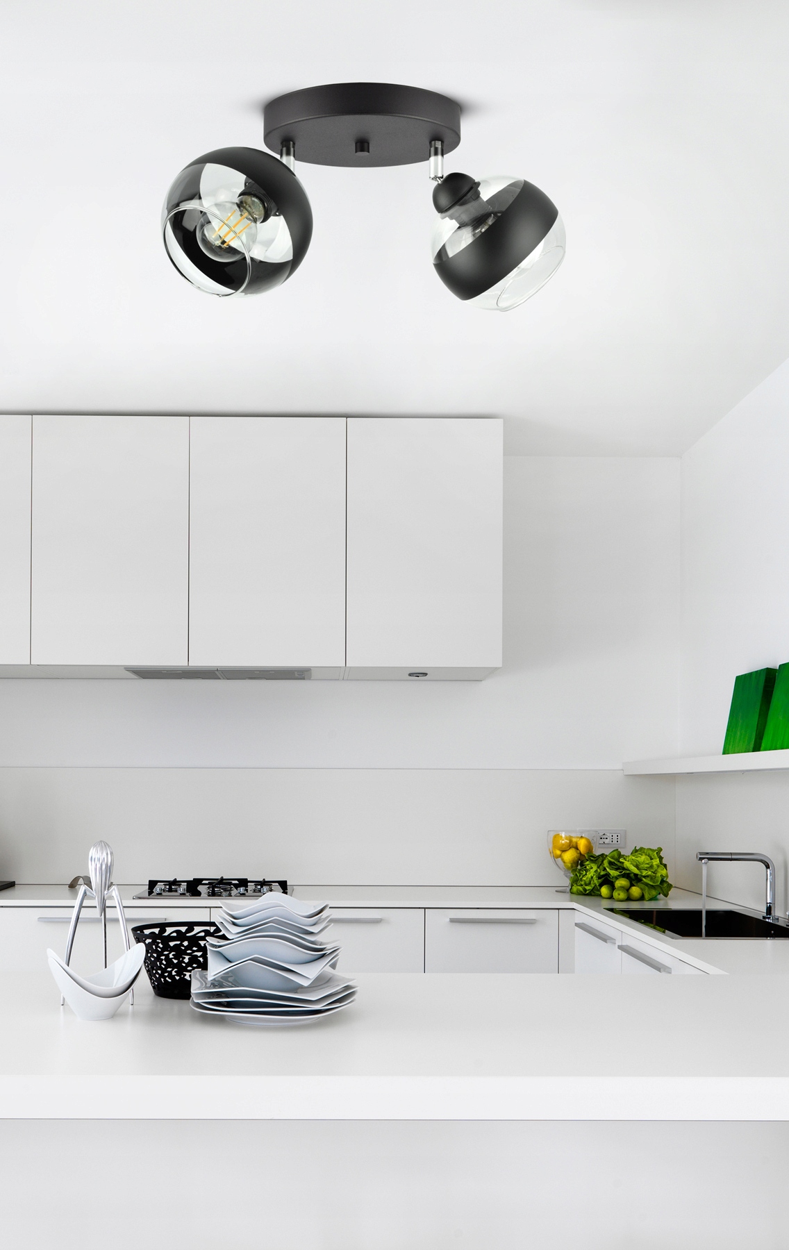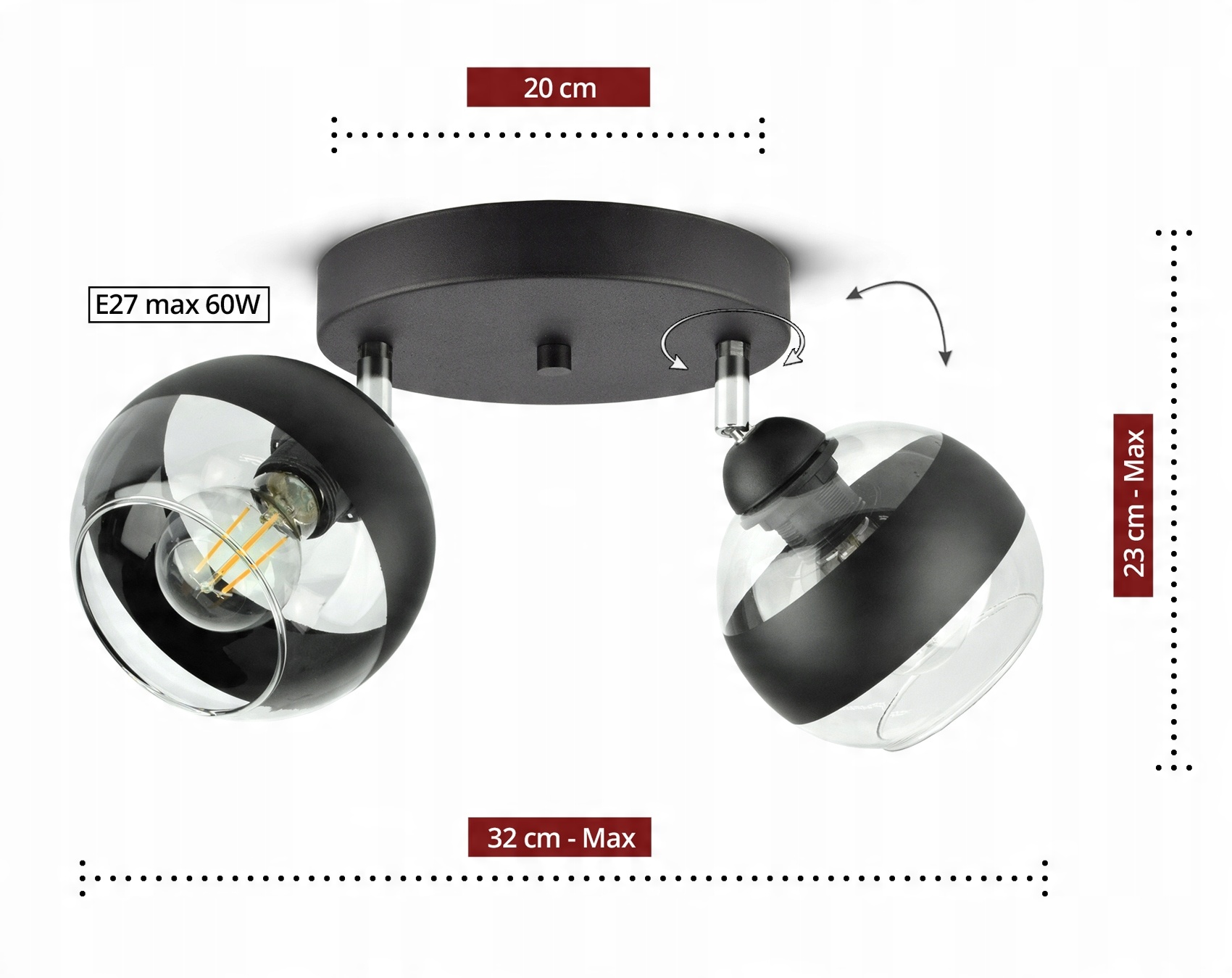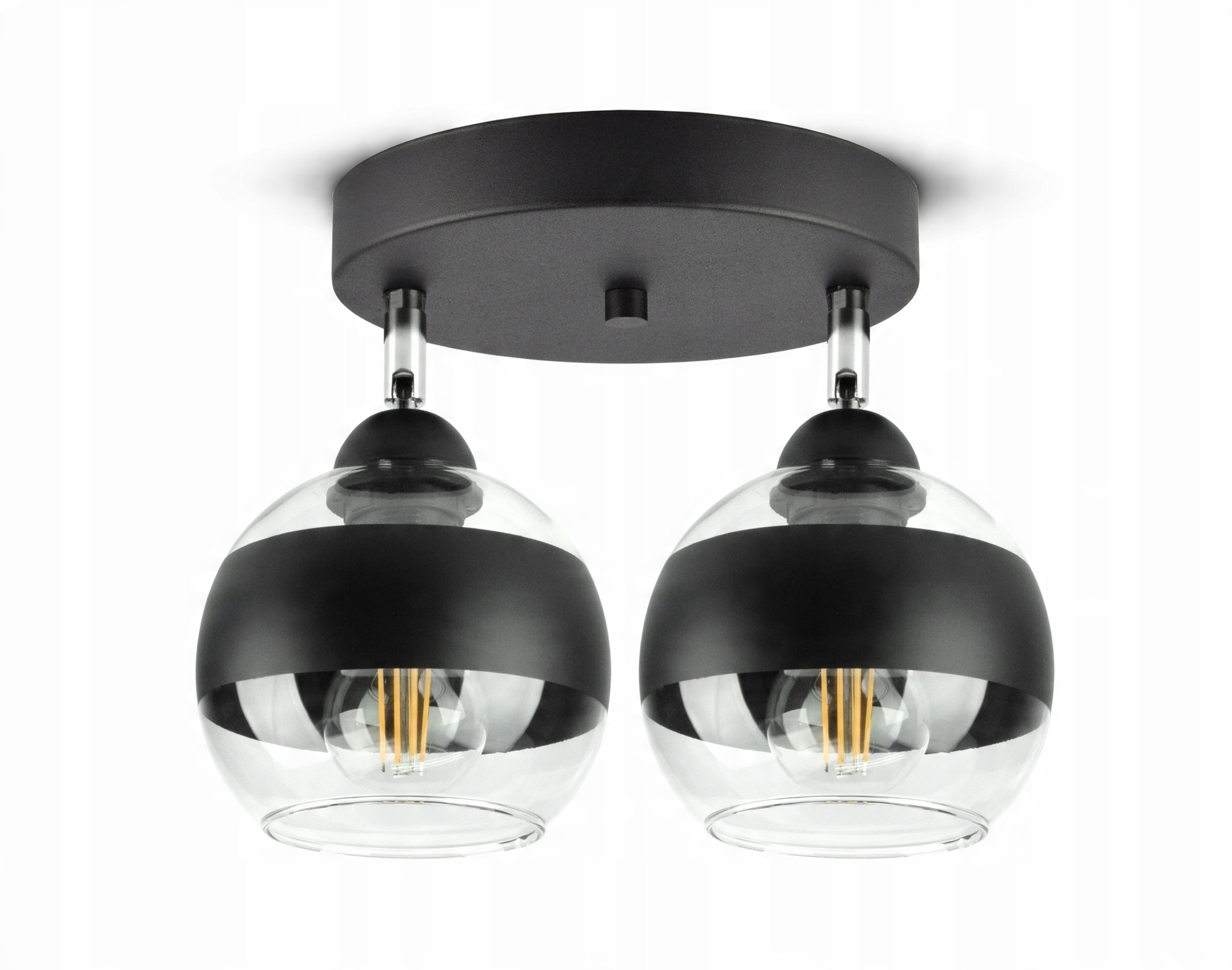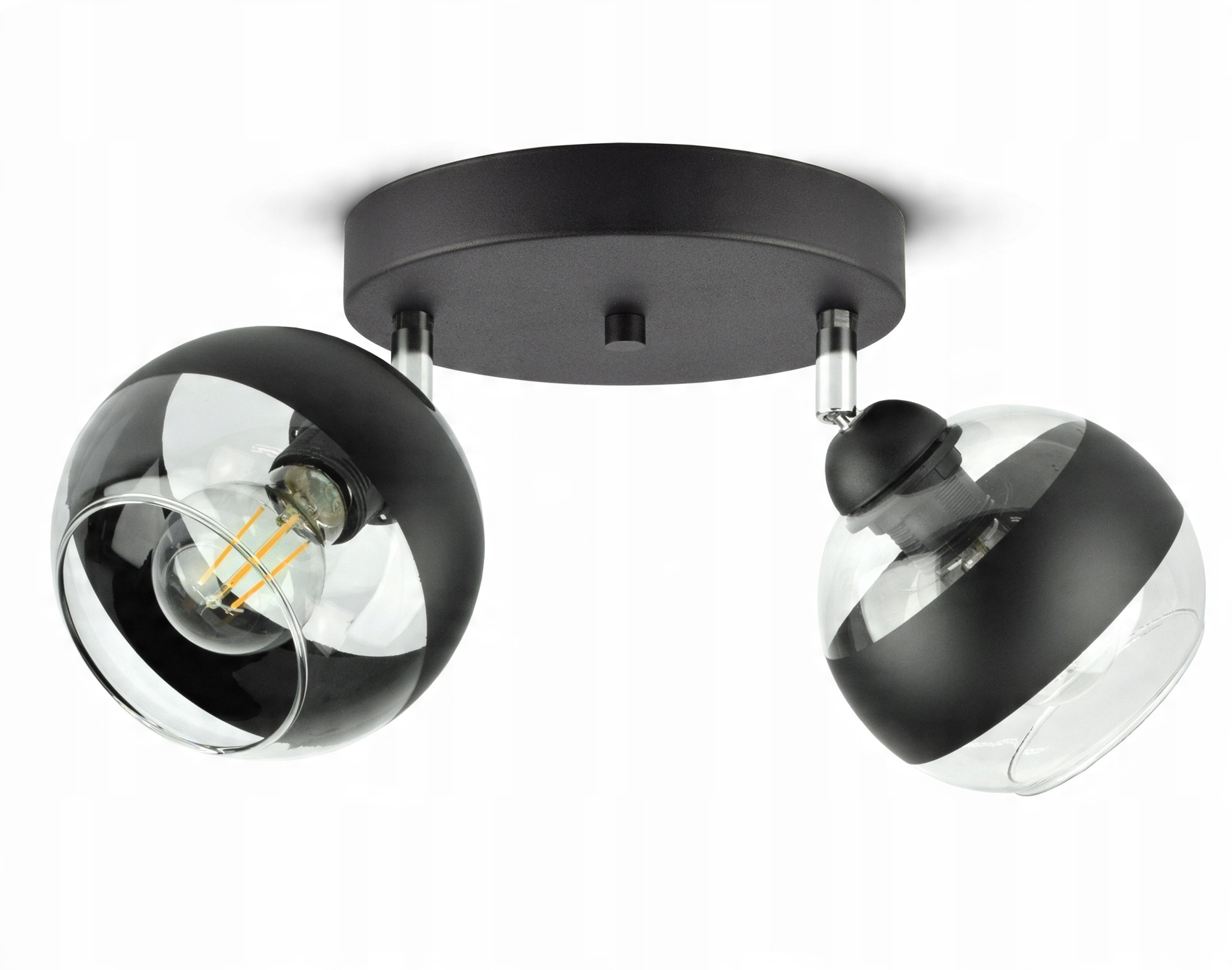 ✅ Lampa wyposażona w szklane klosze w kształcie kuli z czarnym pasem w części centralnej.