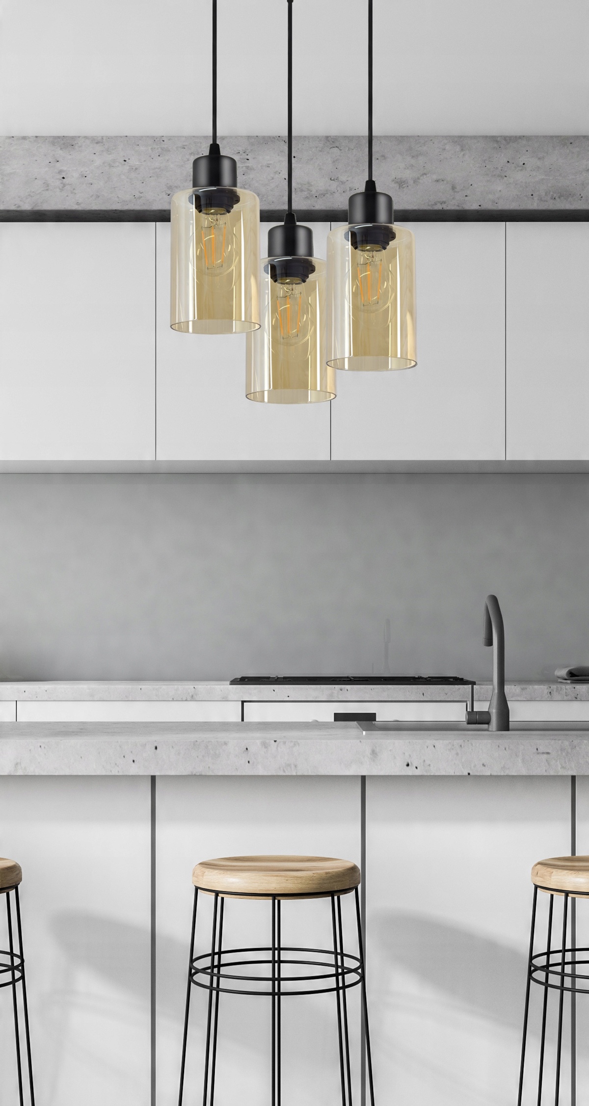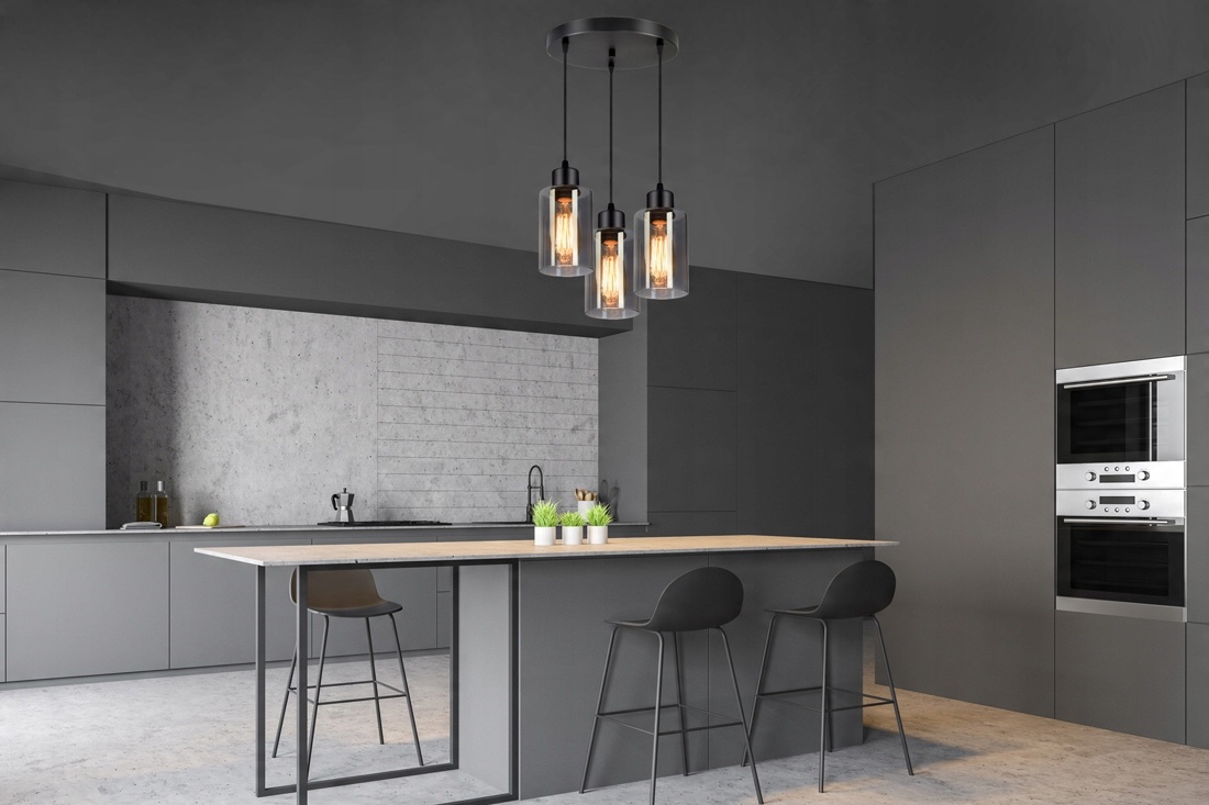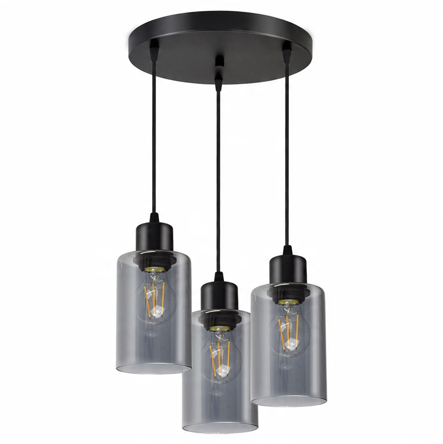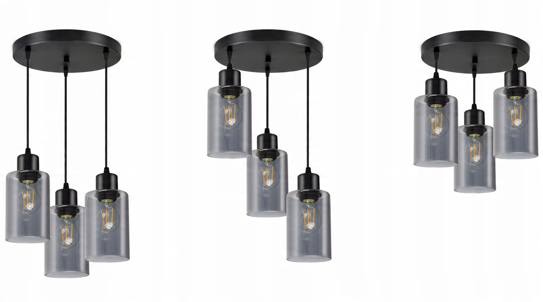 Nowoczesna lampa wisząca wyposażona w trzy szklane klosze w kształcie walca, tub.