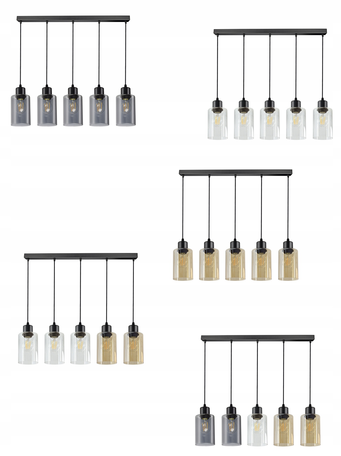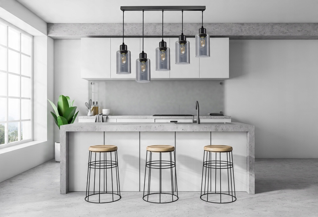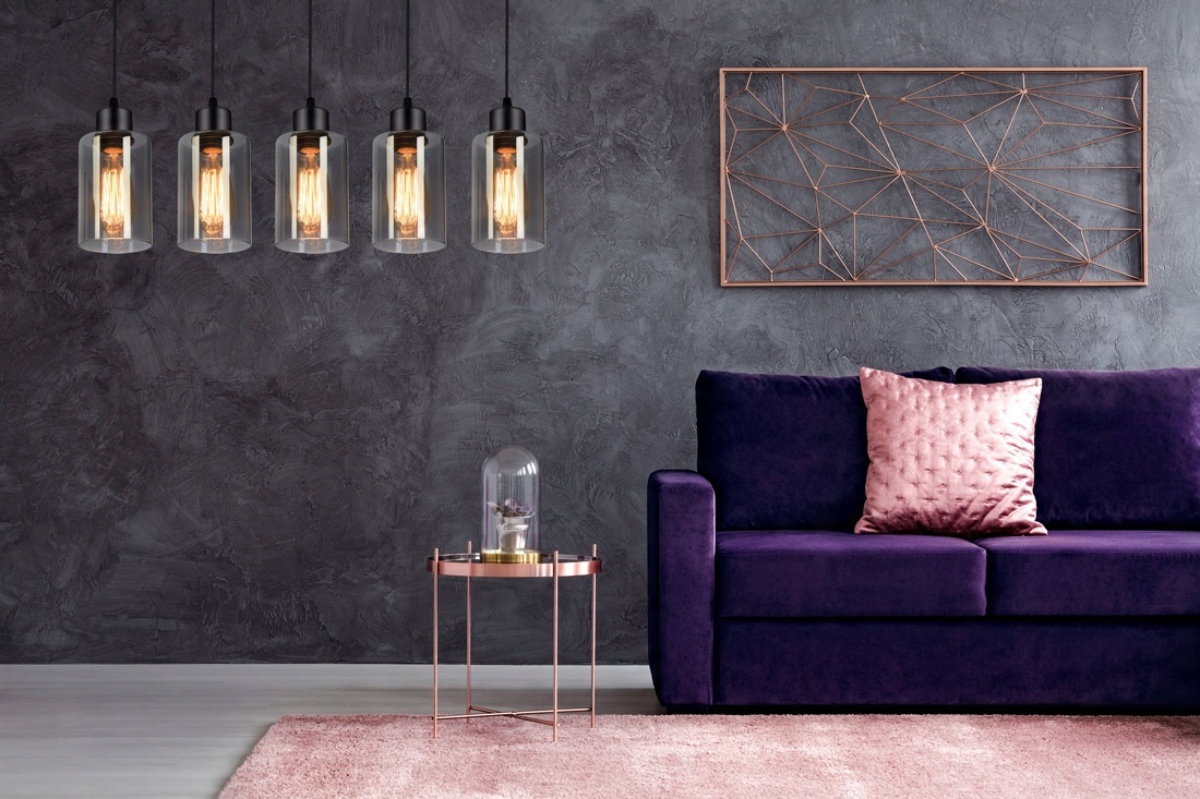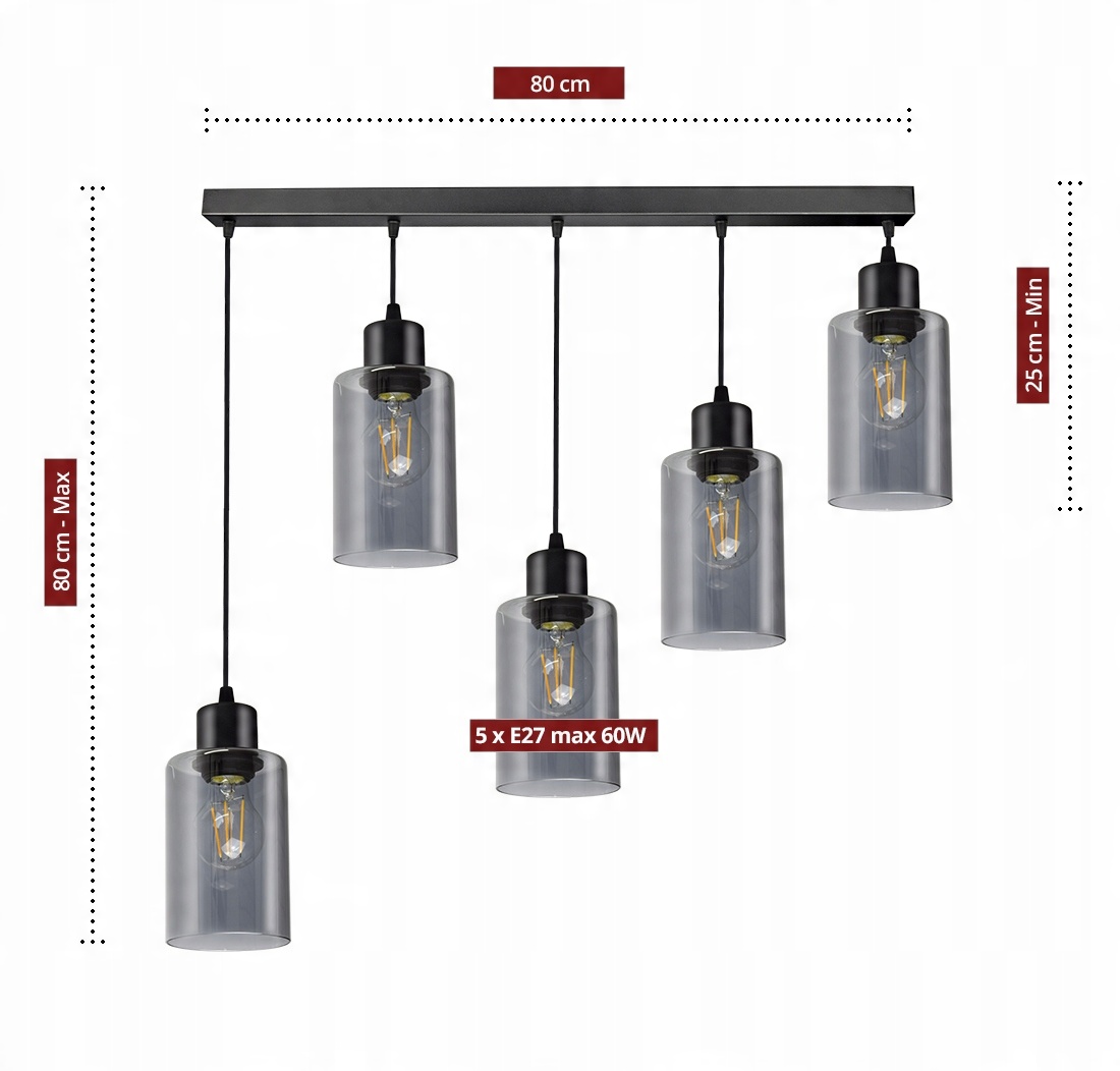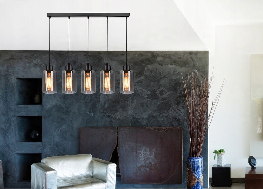Praktyczna i nowoczesna lampa wisząca wyposażona w pięć szklanych kloszy w kształcie walca, tub.