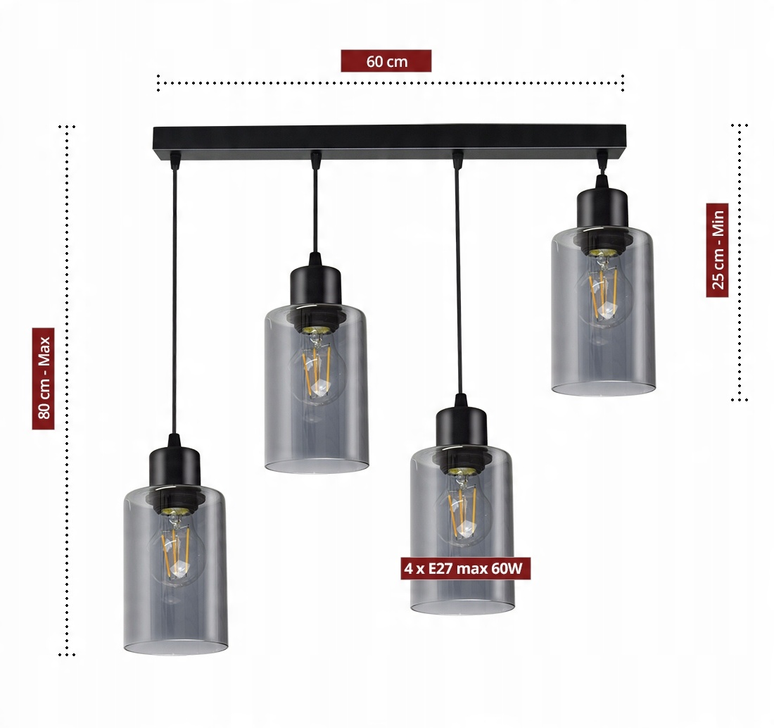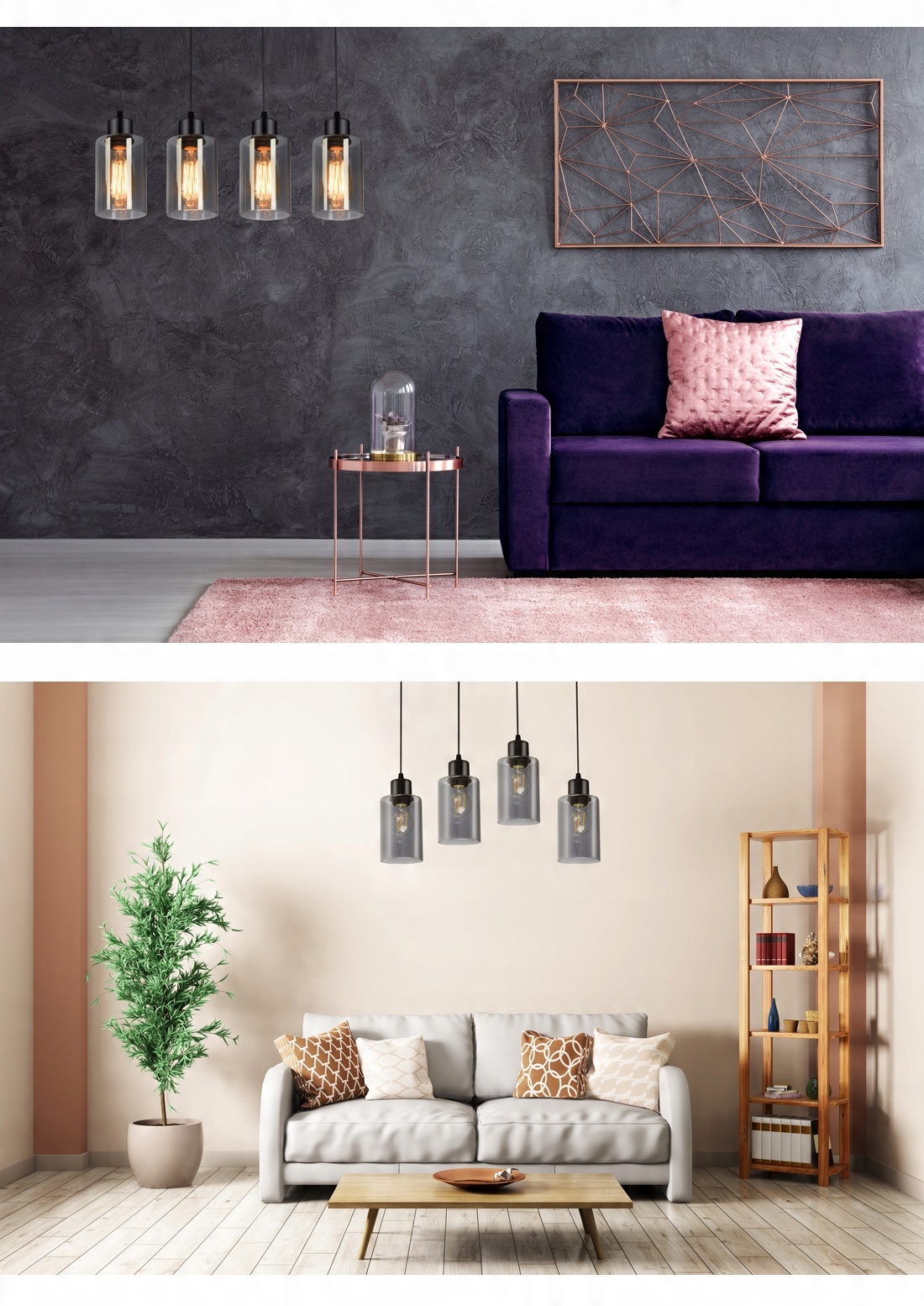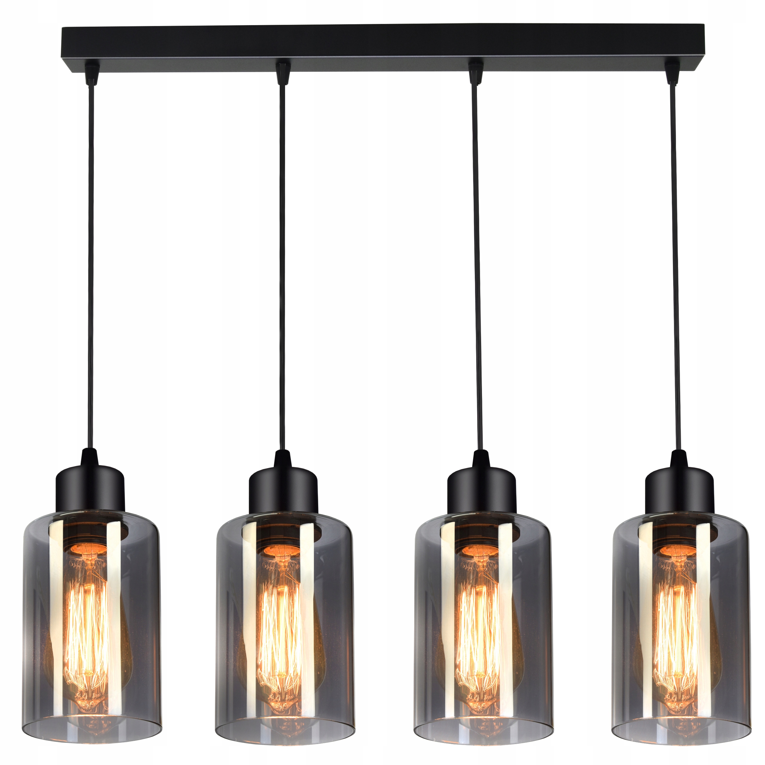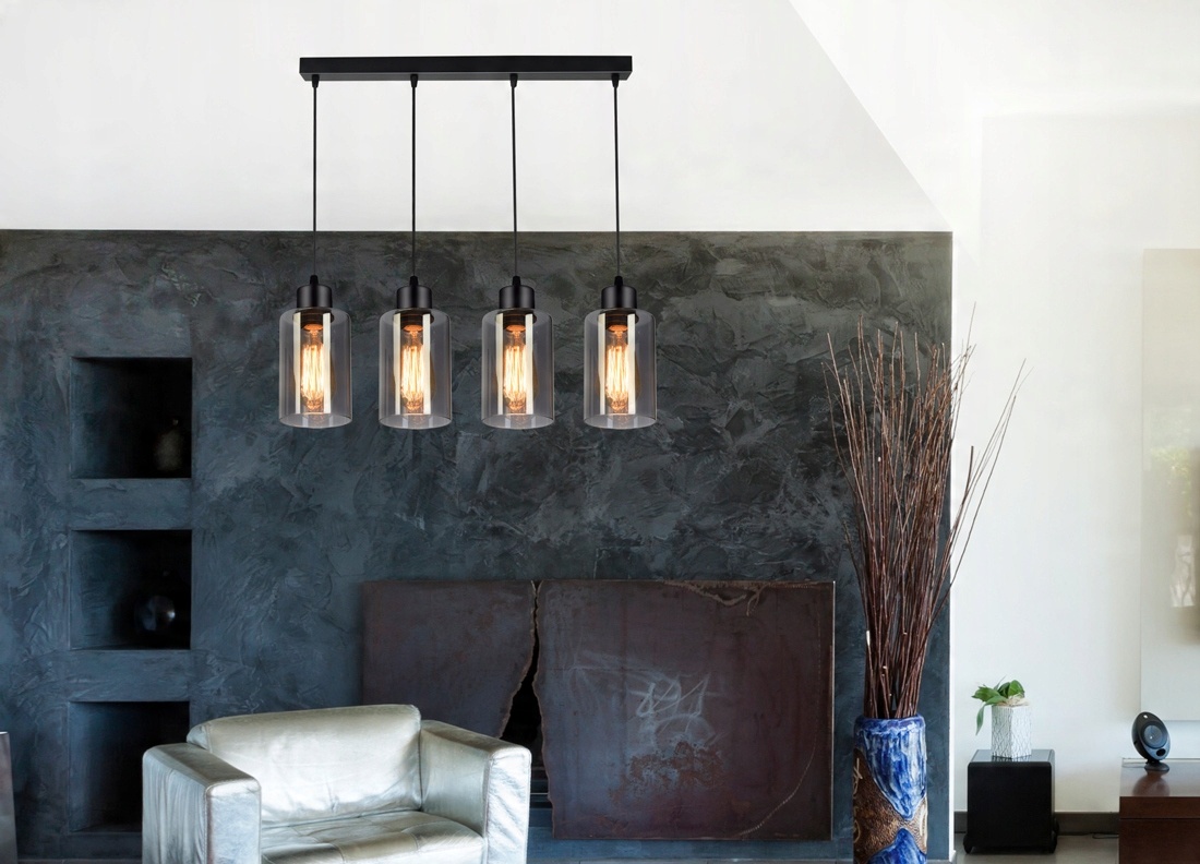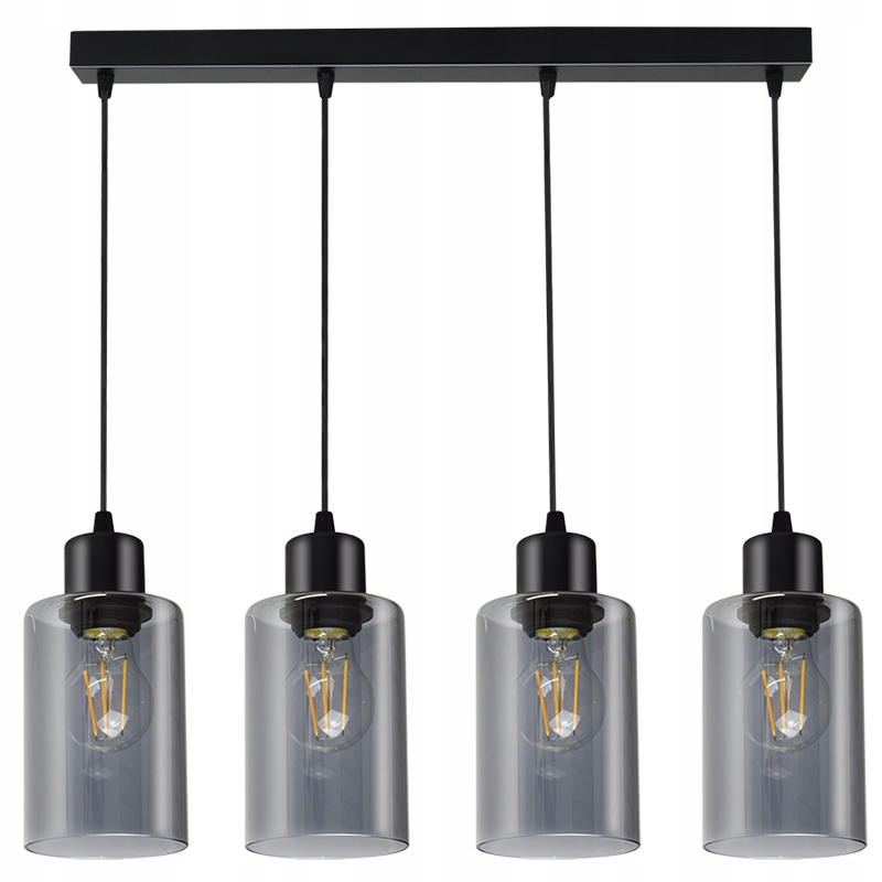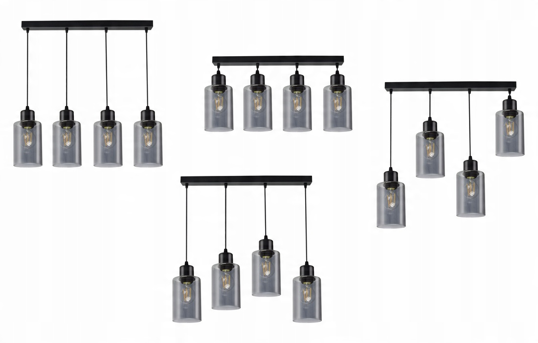 Praktyczna i nowoczesna lampa wisząca wyposażona w cztery szklane klosze w kształcie walca, tub.