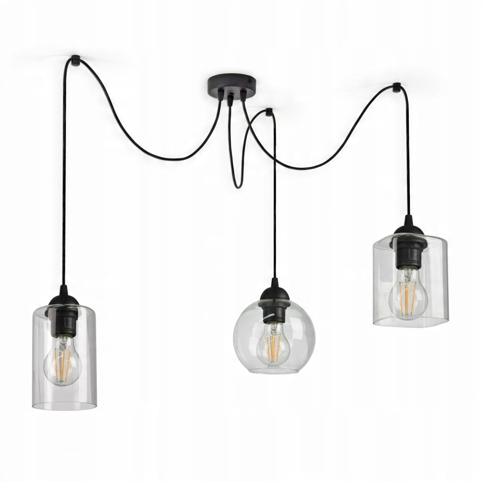 Nowoczesna lampa wisząca - Pająk - wyposażona w trzy szklane klosze o różnym kształcie.