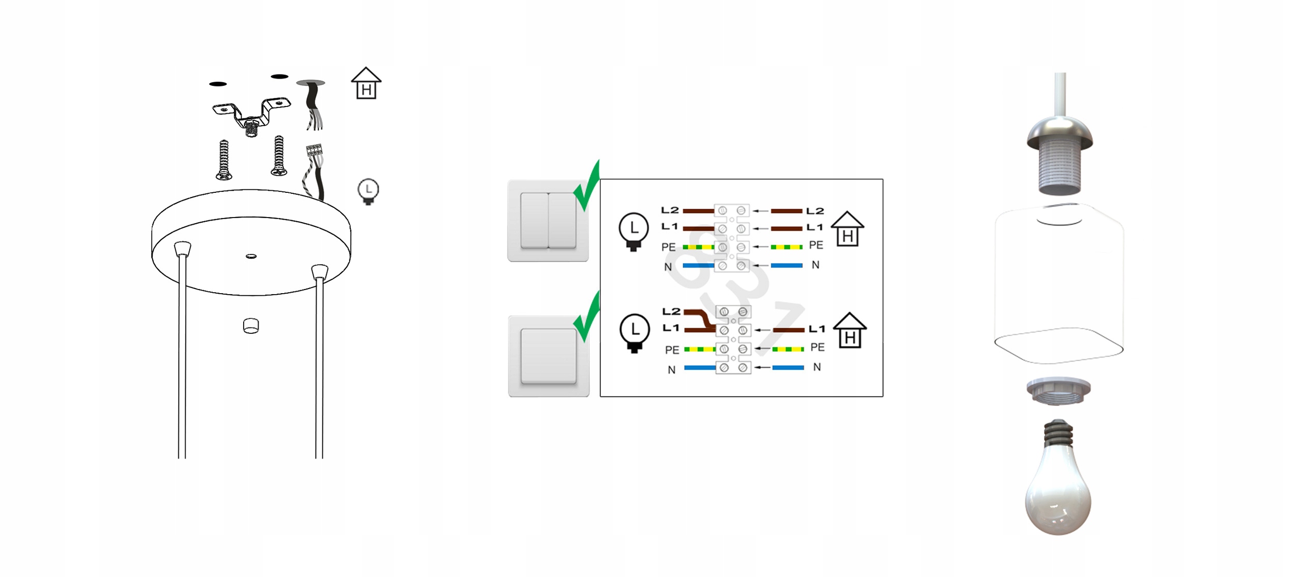 Zestaw nie zawiera żarówek oraz kołków rozporowych (należy dobrać odpowiednie do sufitu)