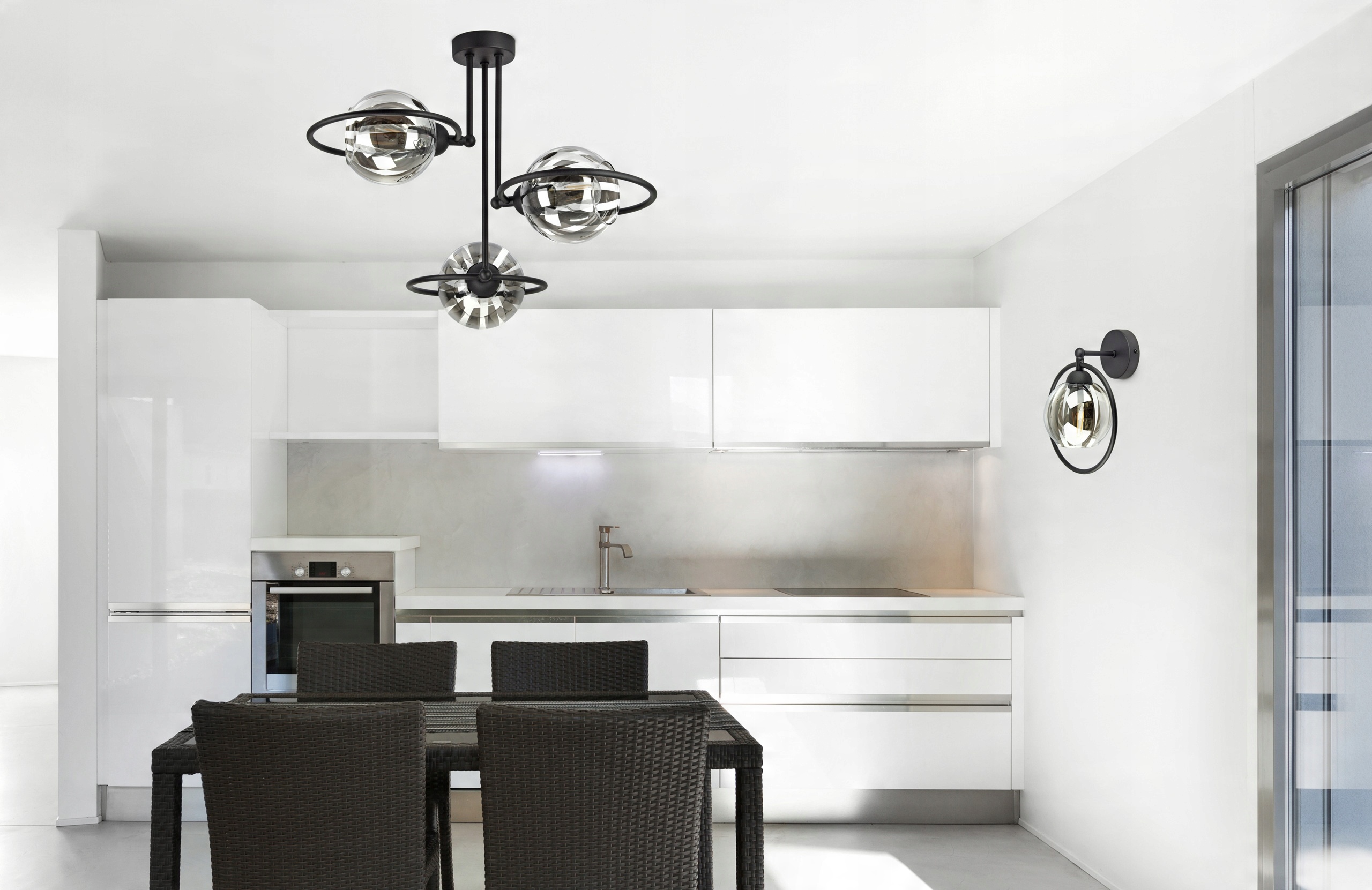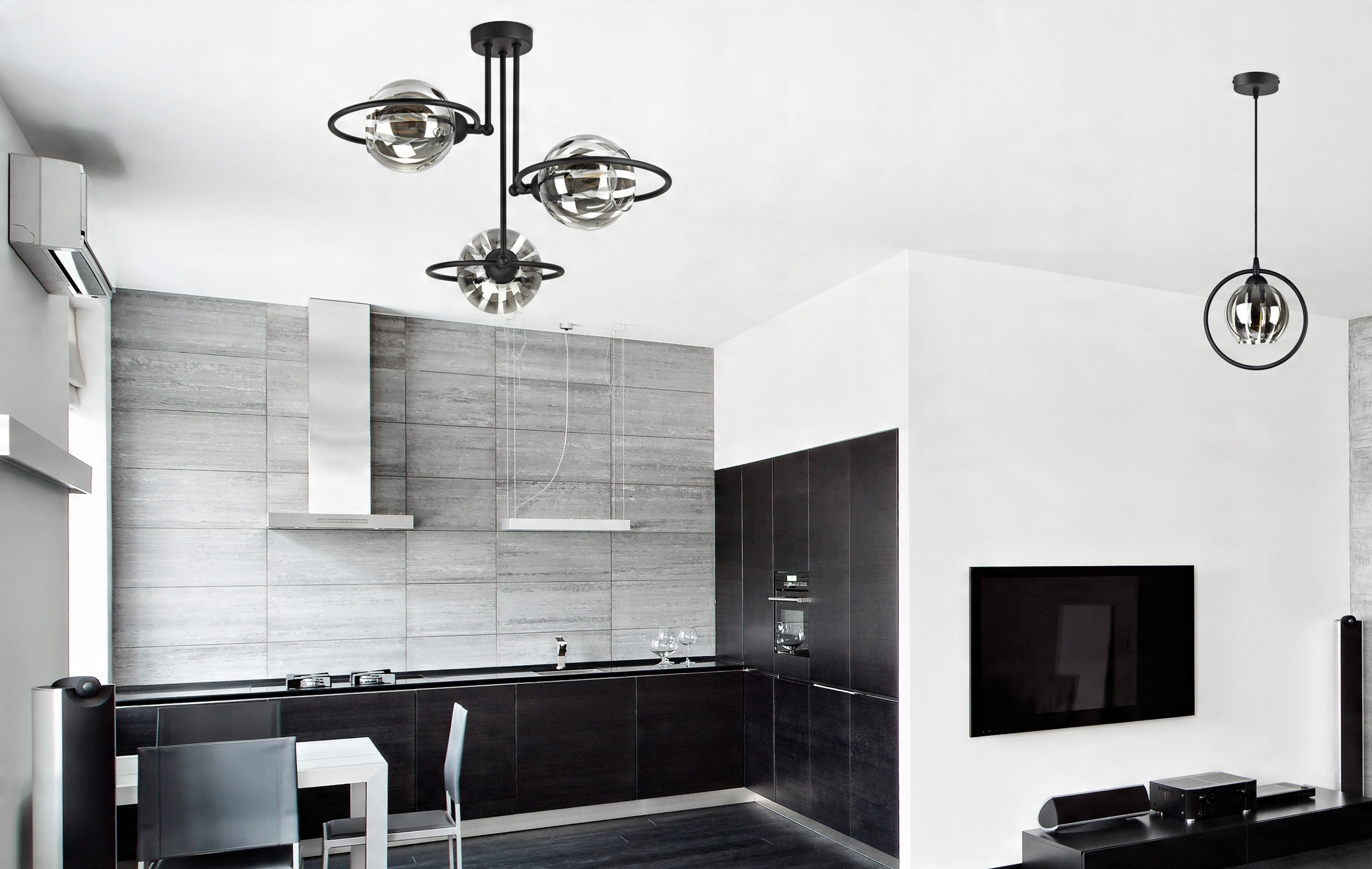 Czarna konstrukcja lampy połączona ze szklanymi kloszami w bardzo modnym kolorze to świetne połączenie w nowoczesnych wnętrzach.