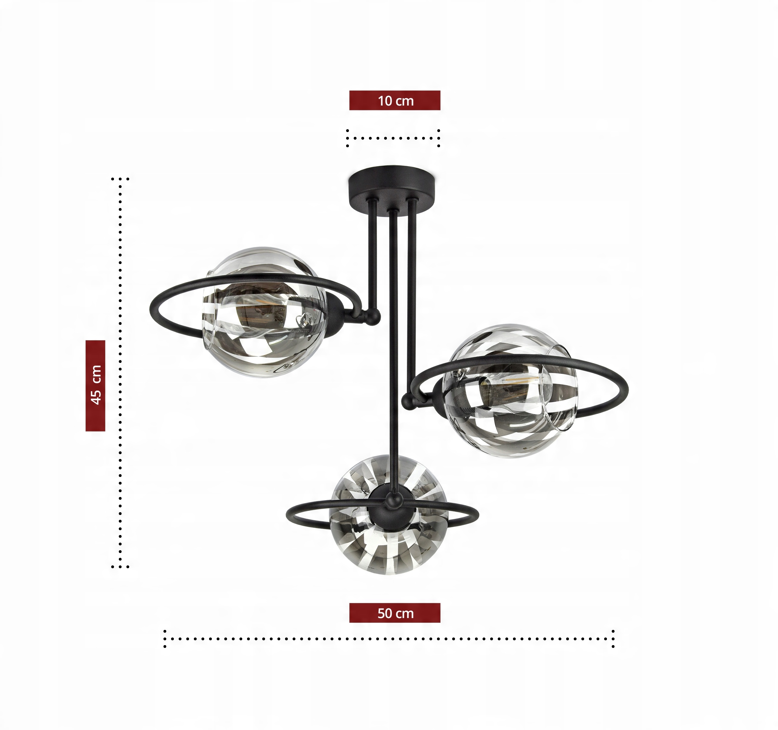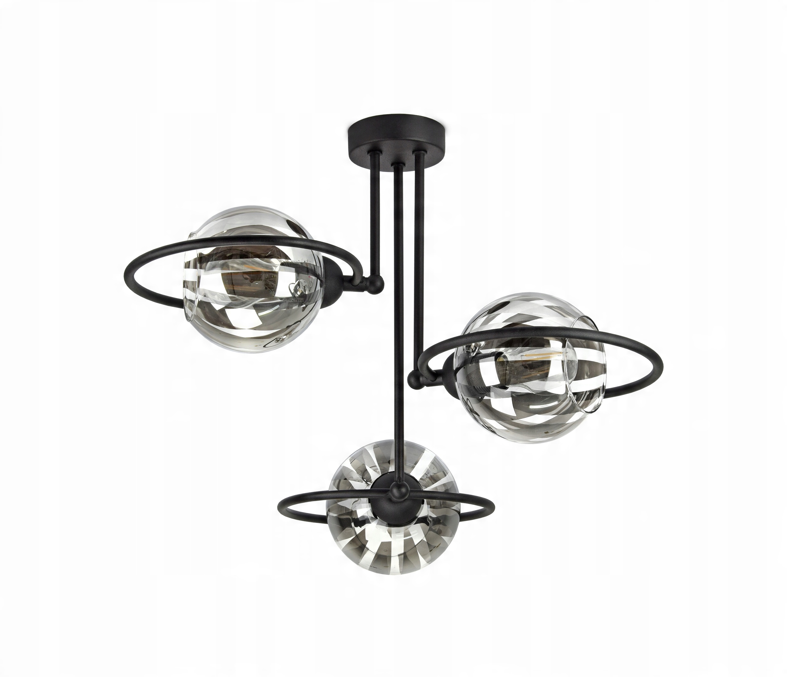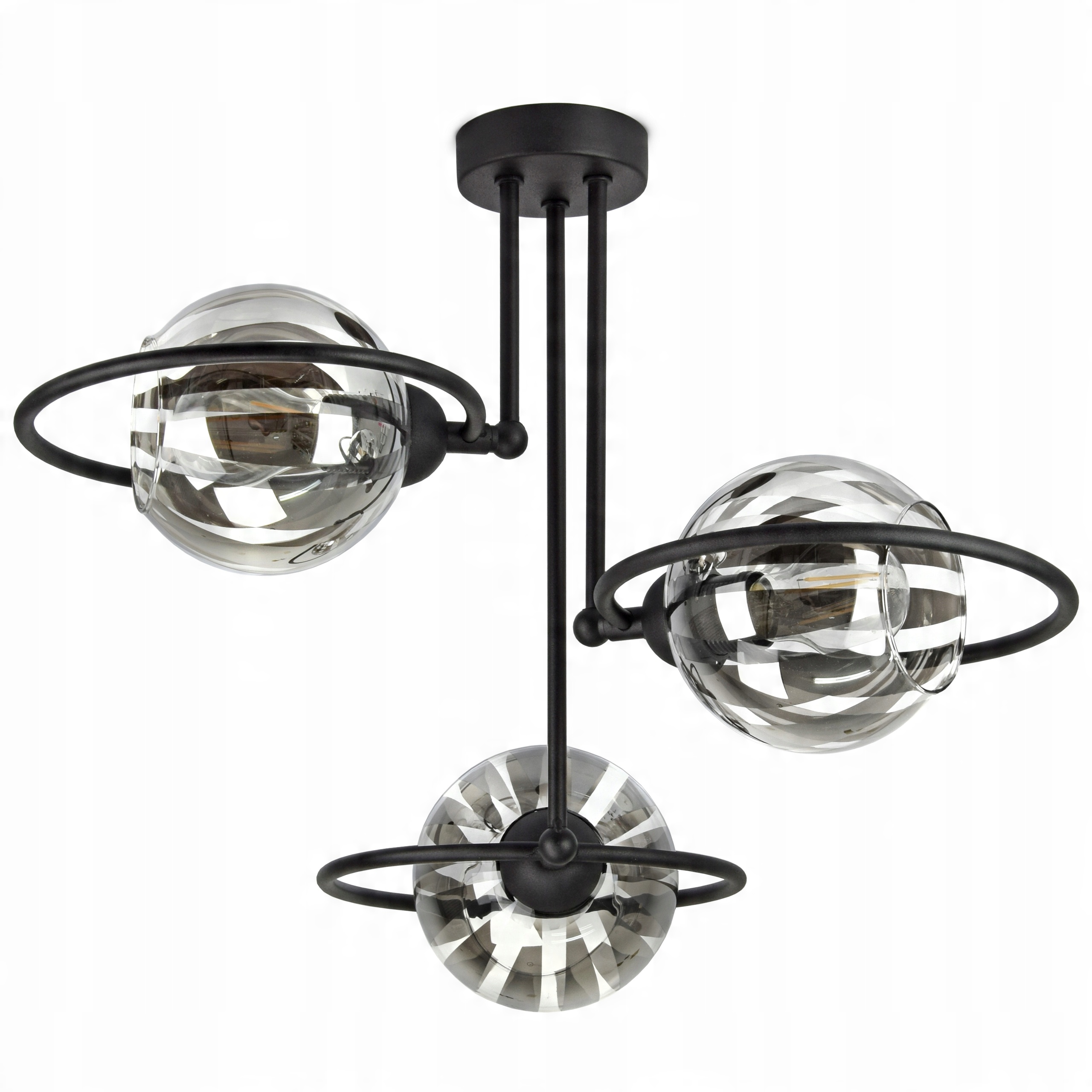 Elegancka lampa wisząca, plafon RING wyposażona w trzy szklane klosze w kształcie kuli.