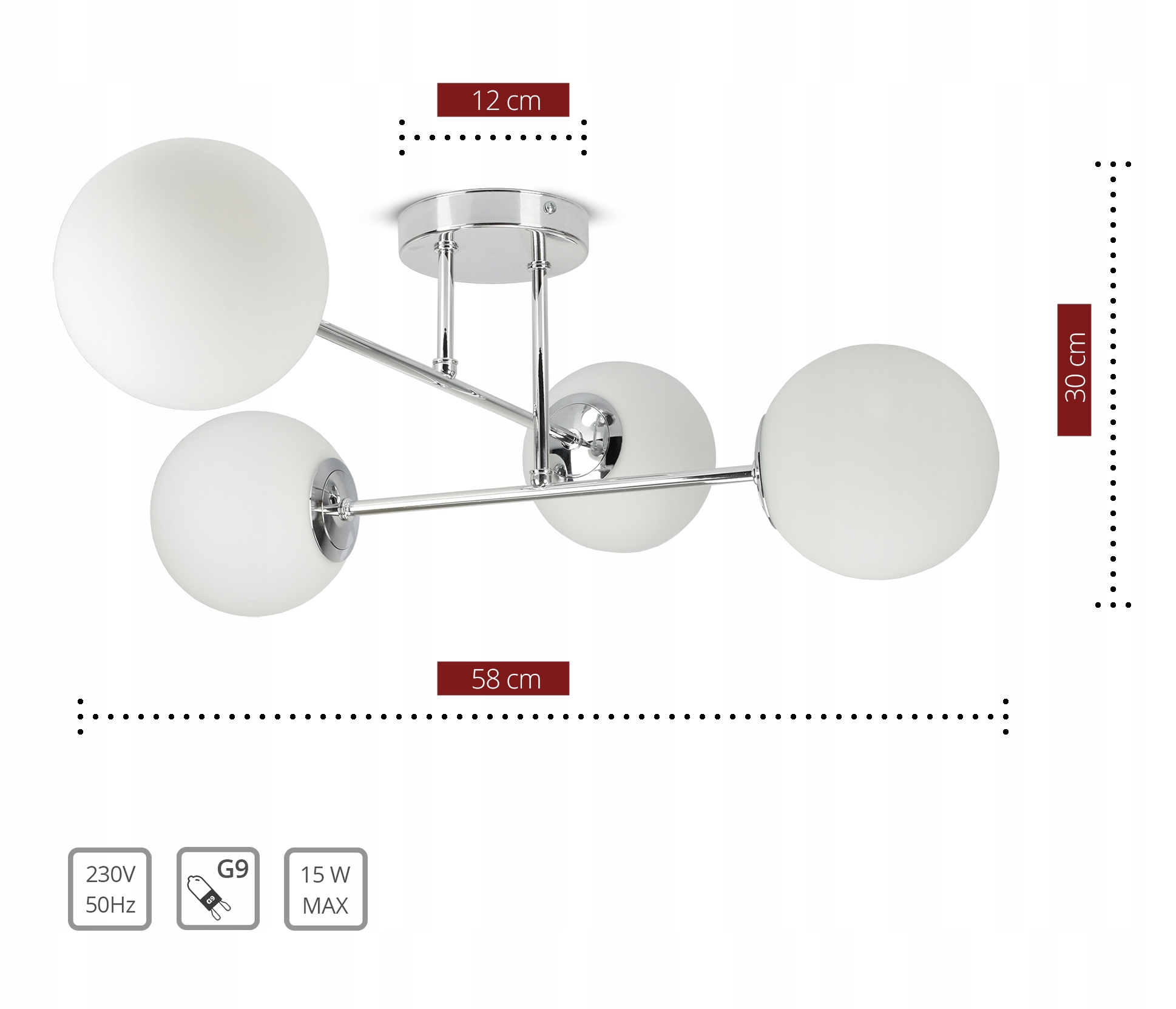 Zestaw nie zawiera żarówek, a także kołków rozporowych (należy dobrać odpowiednie do sufitu).