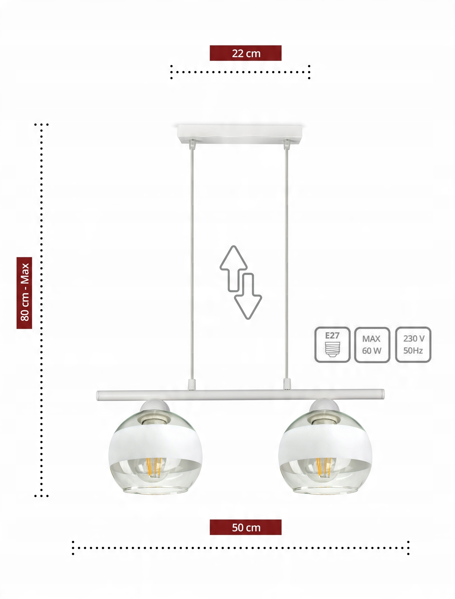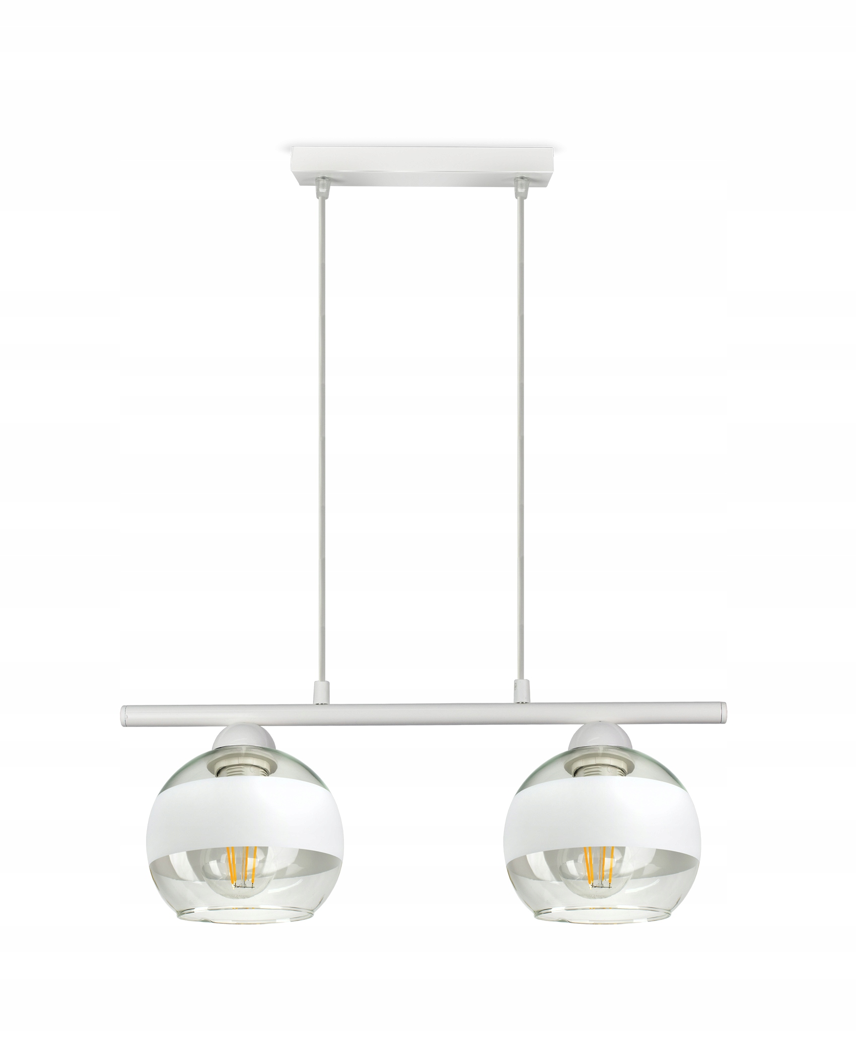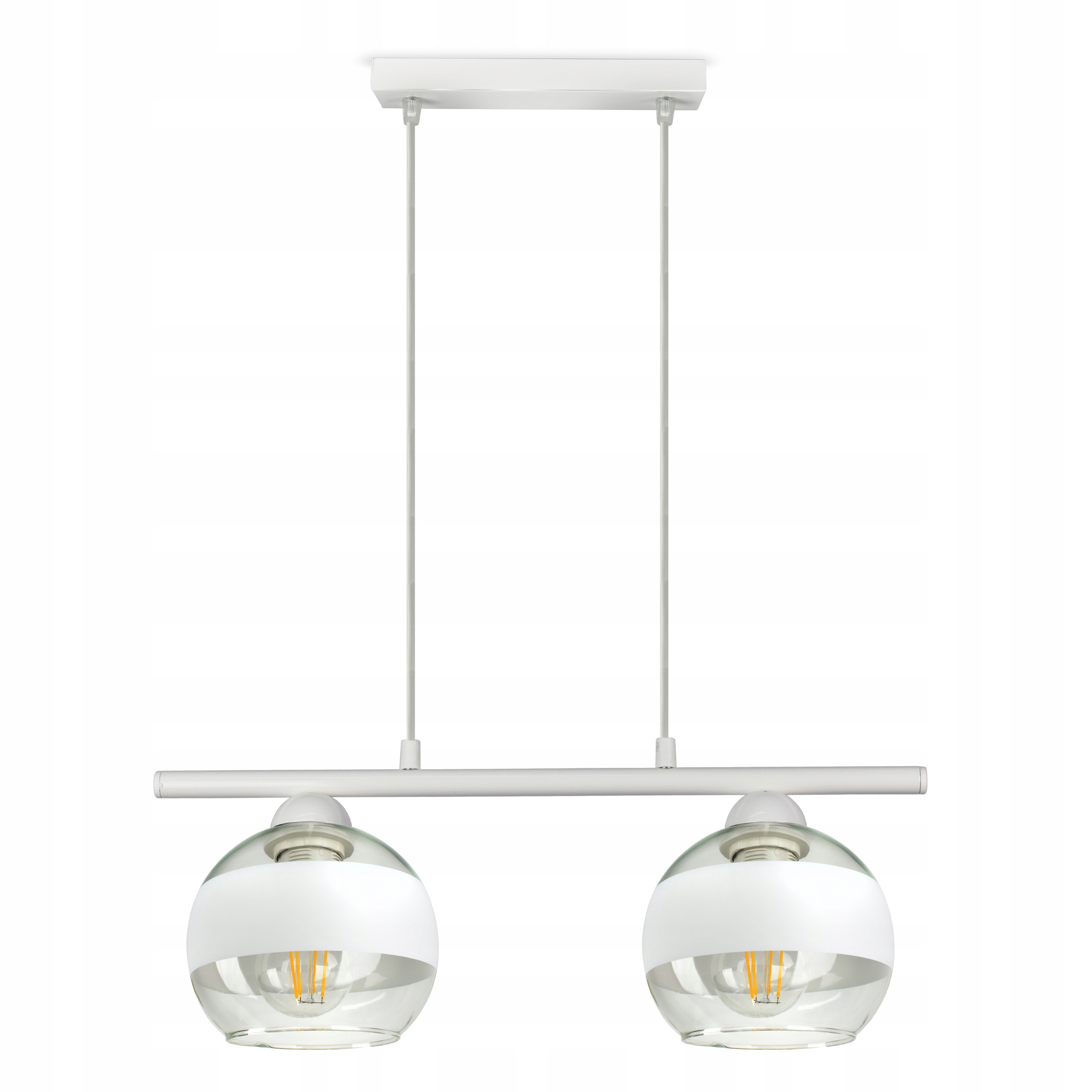 ✅ Lampa wyposażona w szklane klosze w kształcie kuli z białym pasem w części centralnej.