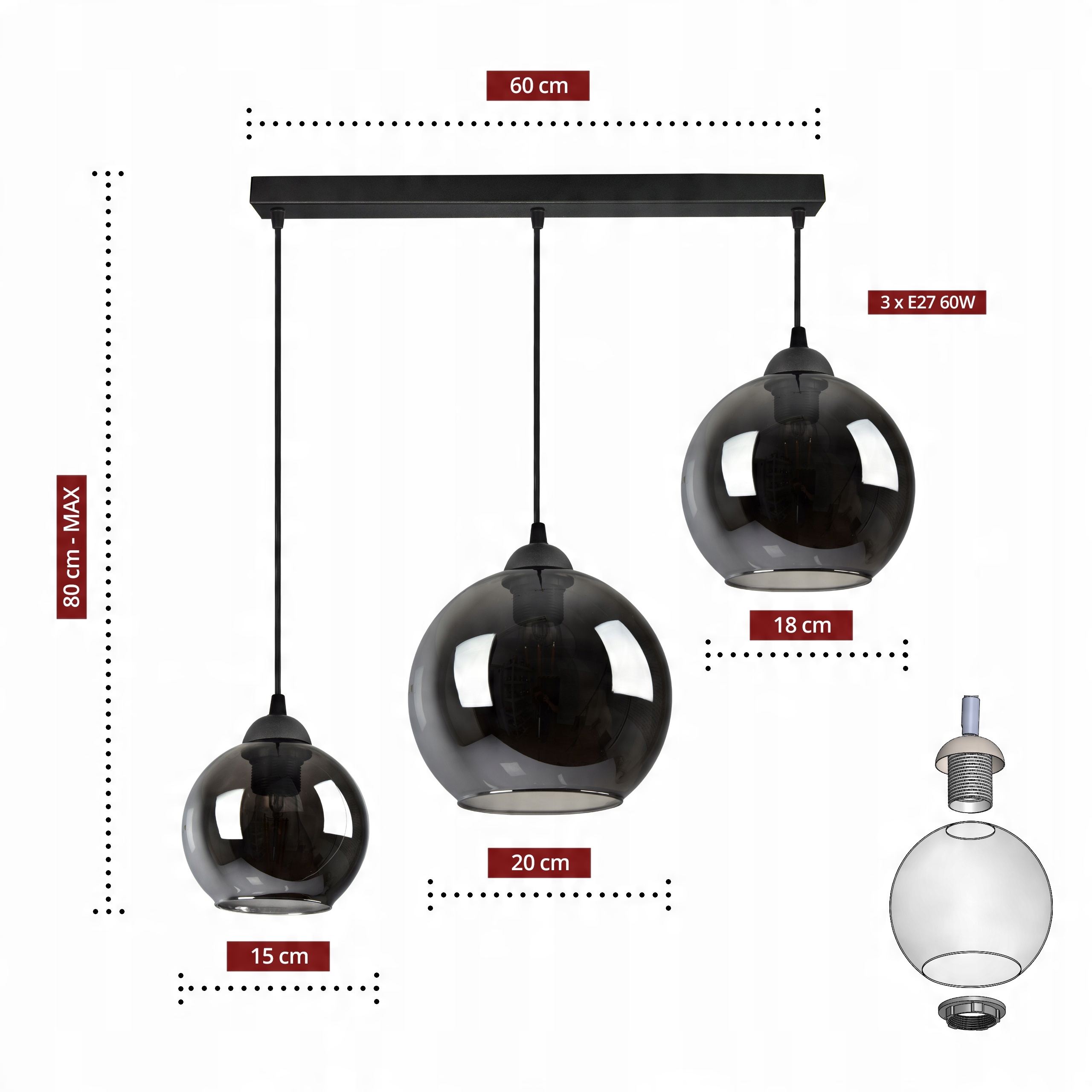 Lampa Żyrandol Trzy Różne Szklane Kule Grafit E27