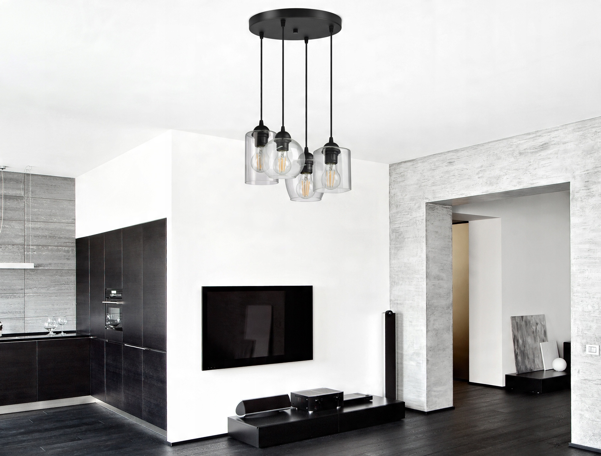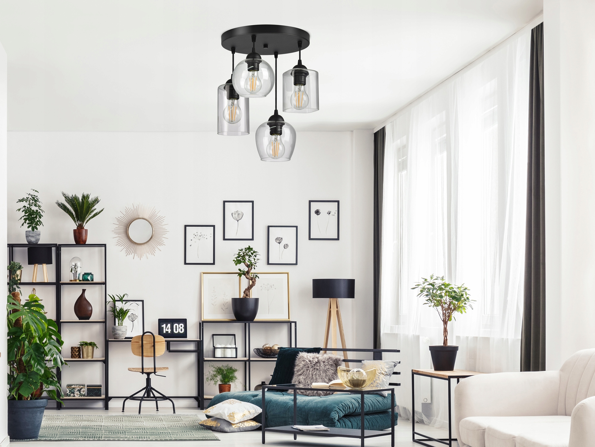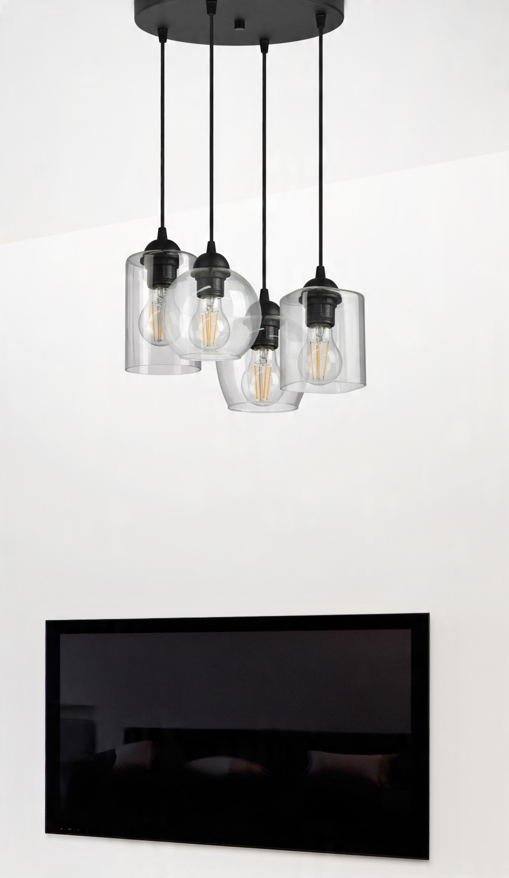 Niestandardowa lampa wisząca wyposażona w cztery szklane klosze w różnym kształcie.