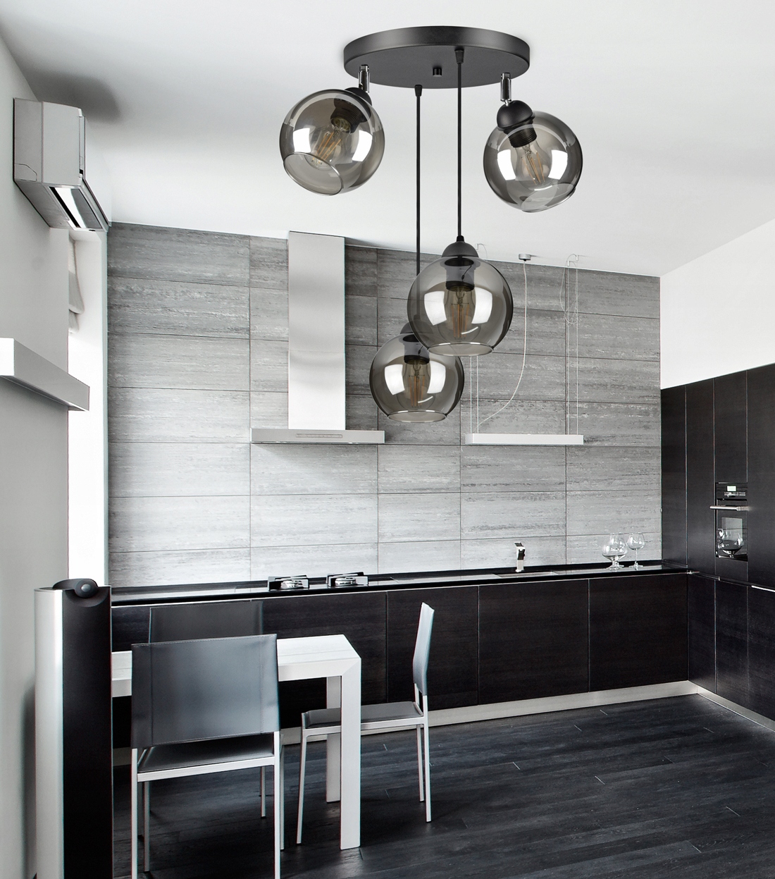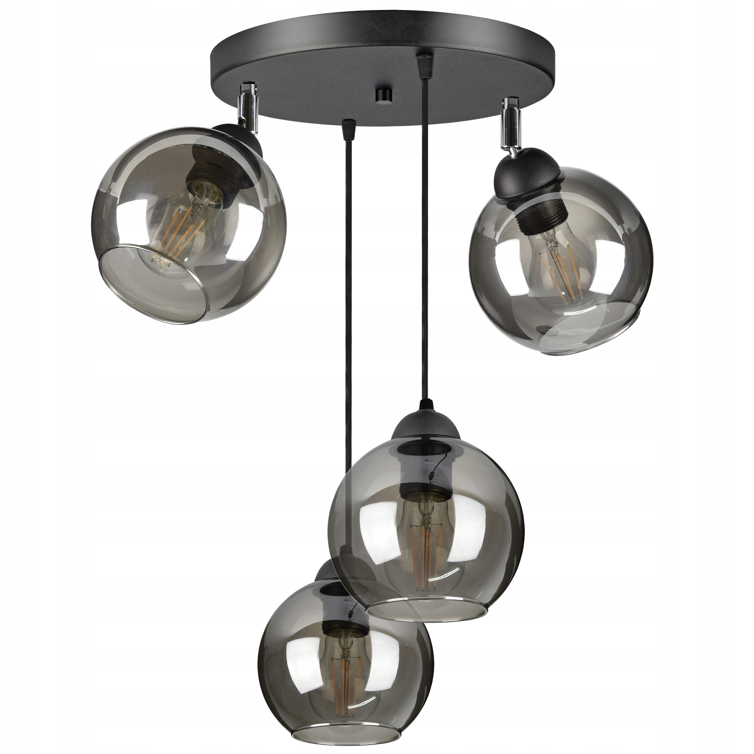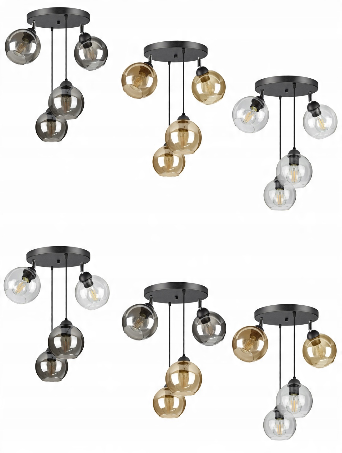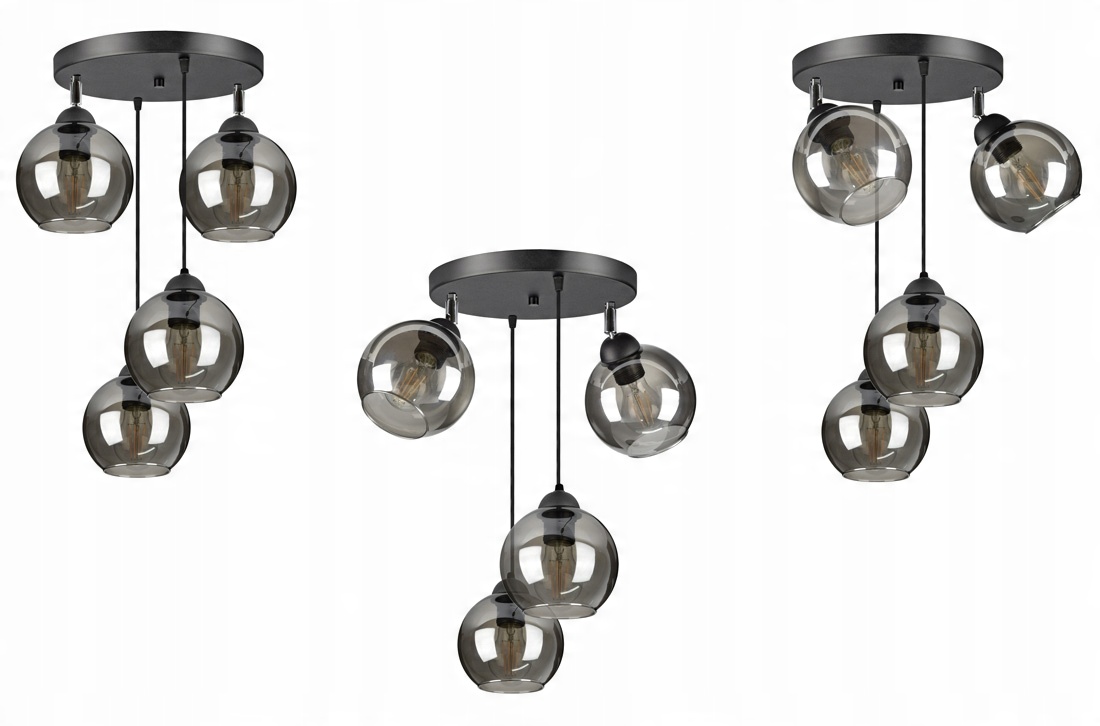 Praktyczna i nowoczesna lampa wisząca wyposażona w cztery szklane klosze dostępne do wyboru w różnych kolorach.