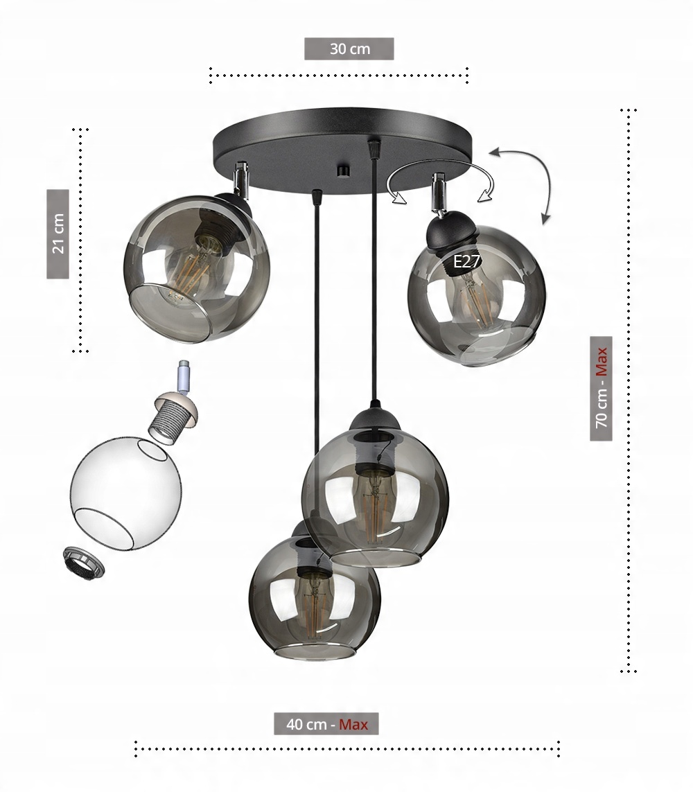 - Źródło światła: E-27 - zalecane LED lub świetlówki kompaktowe