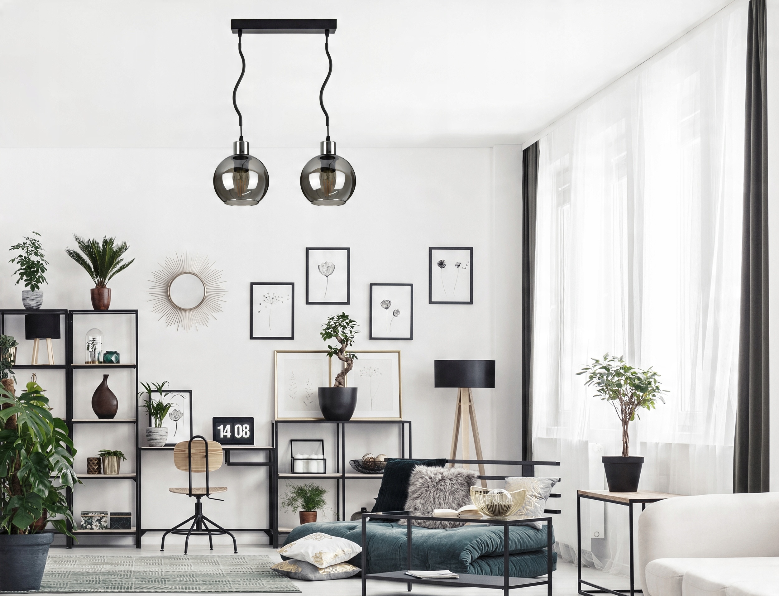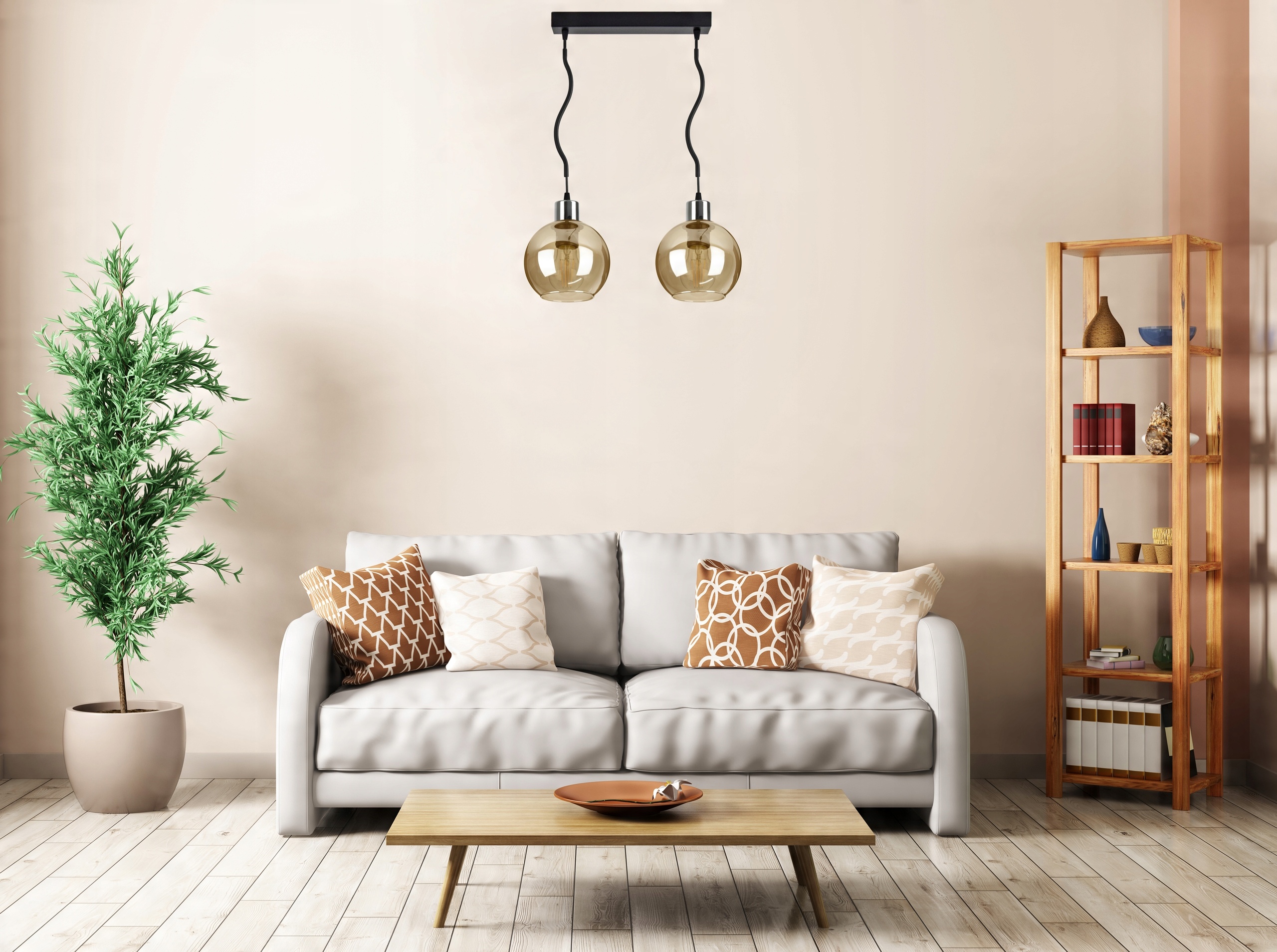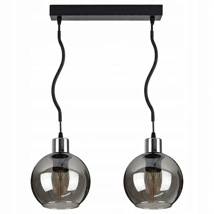Nowoczesna lampa wisząca wyposażona w dwa szklane klosze w kształcie kuli.