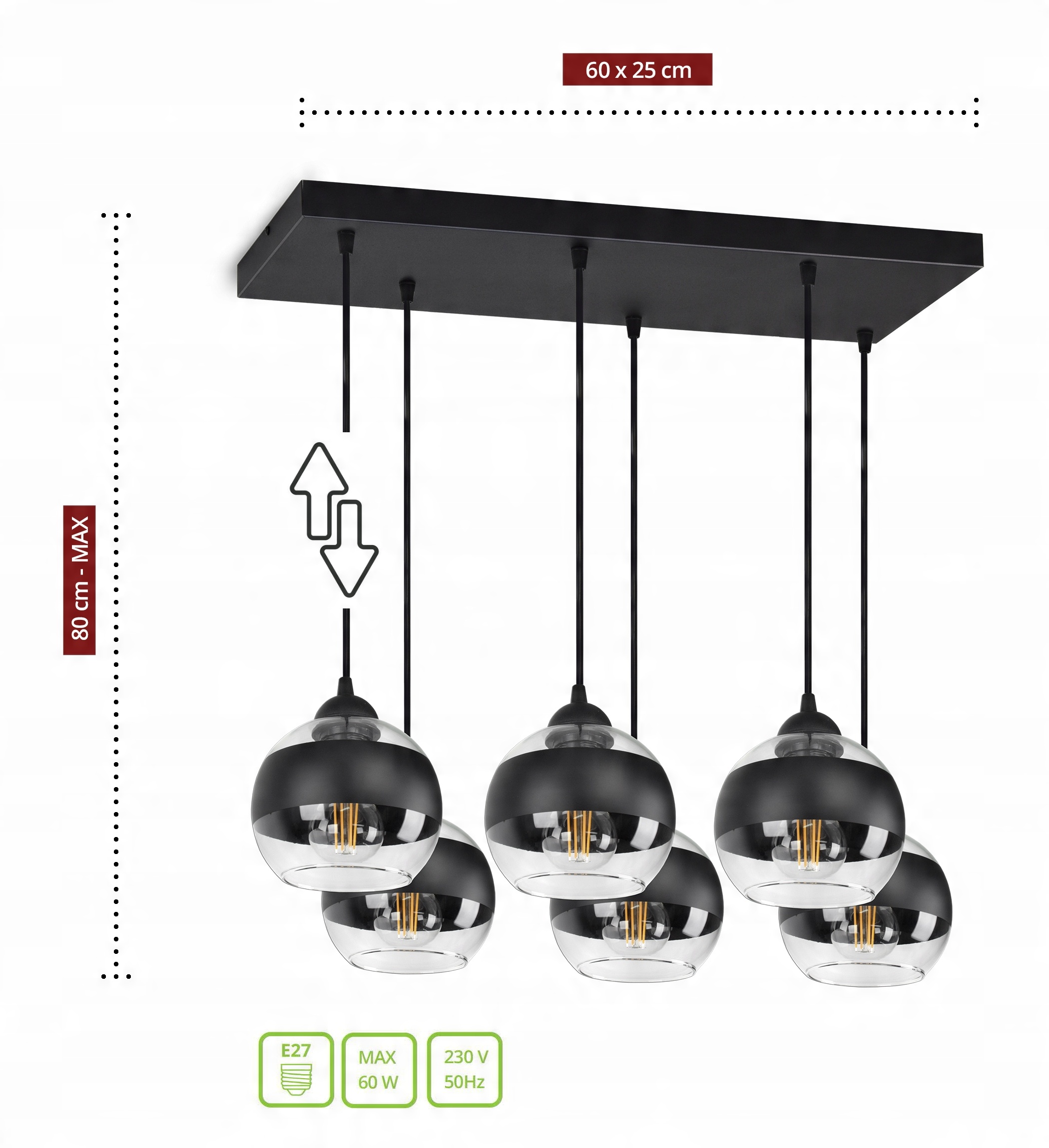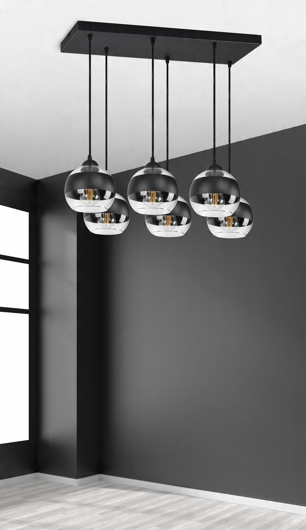 ✅ Lampa wyposażona w szklane klosze w kształcie kuli z Czarnym pasem w części centralnej.