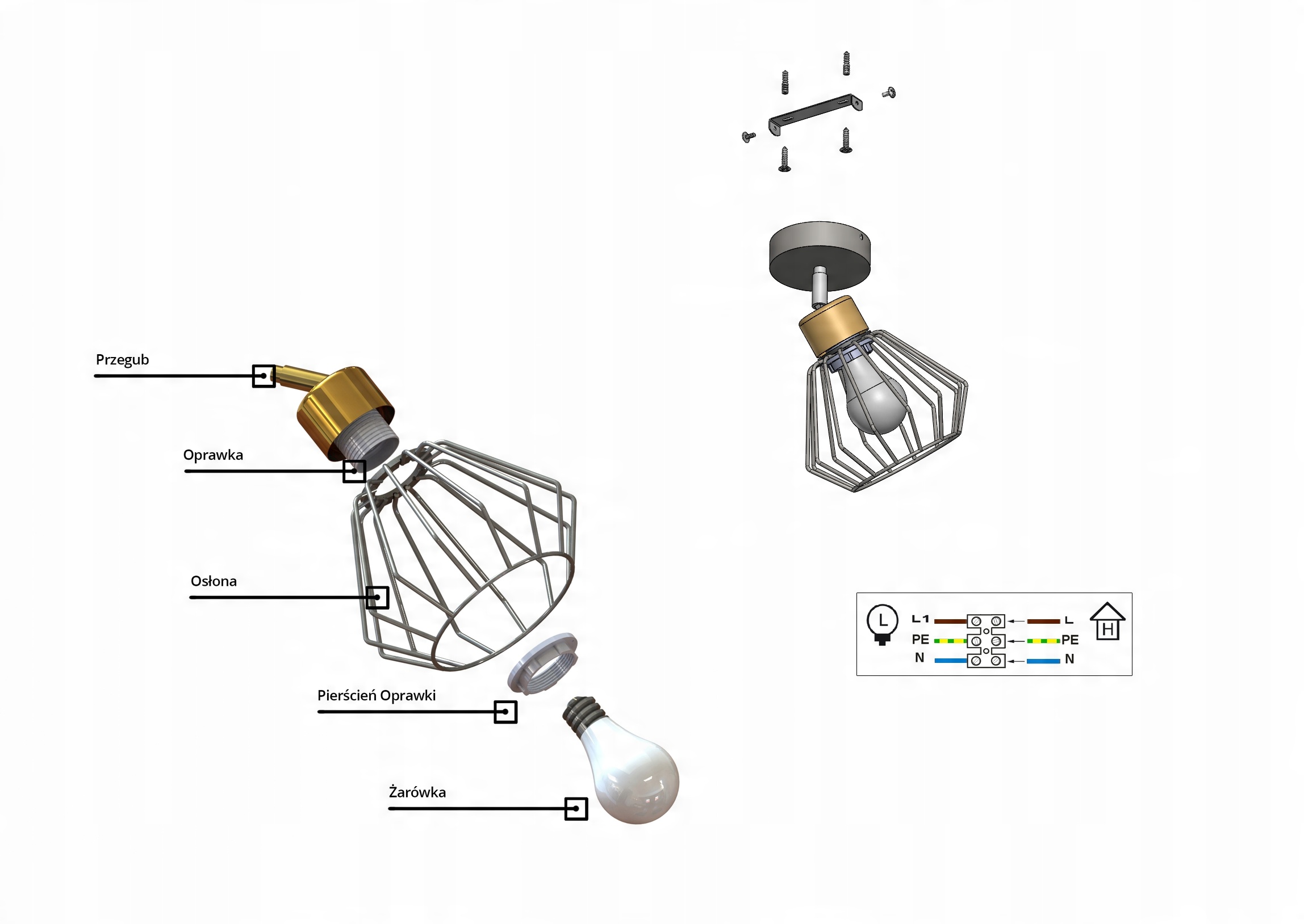 Zestaw nie zawiera żarówki ani kołków rozporowych (należy dobrać odpowiednie do sufitu)