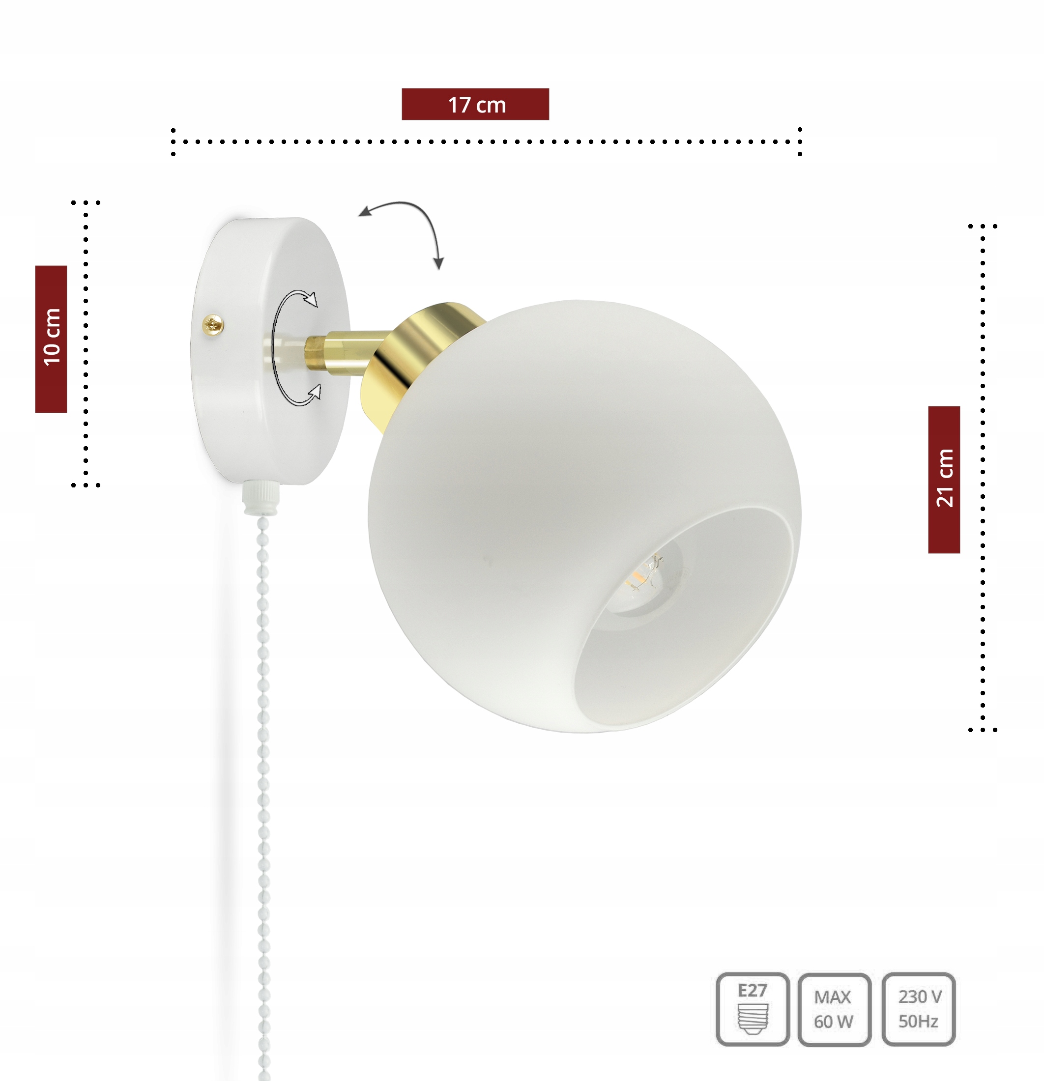 Zestaw nie zawiera żarówki, a także kołków rozporowych (należy dobrać odpowiednie do ściany).