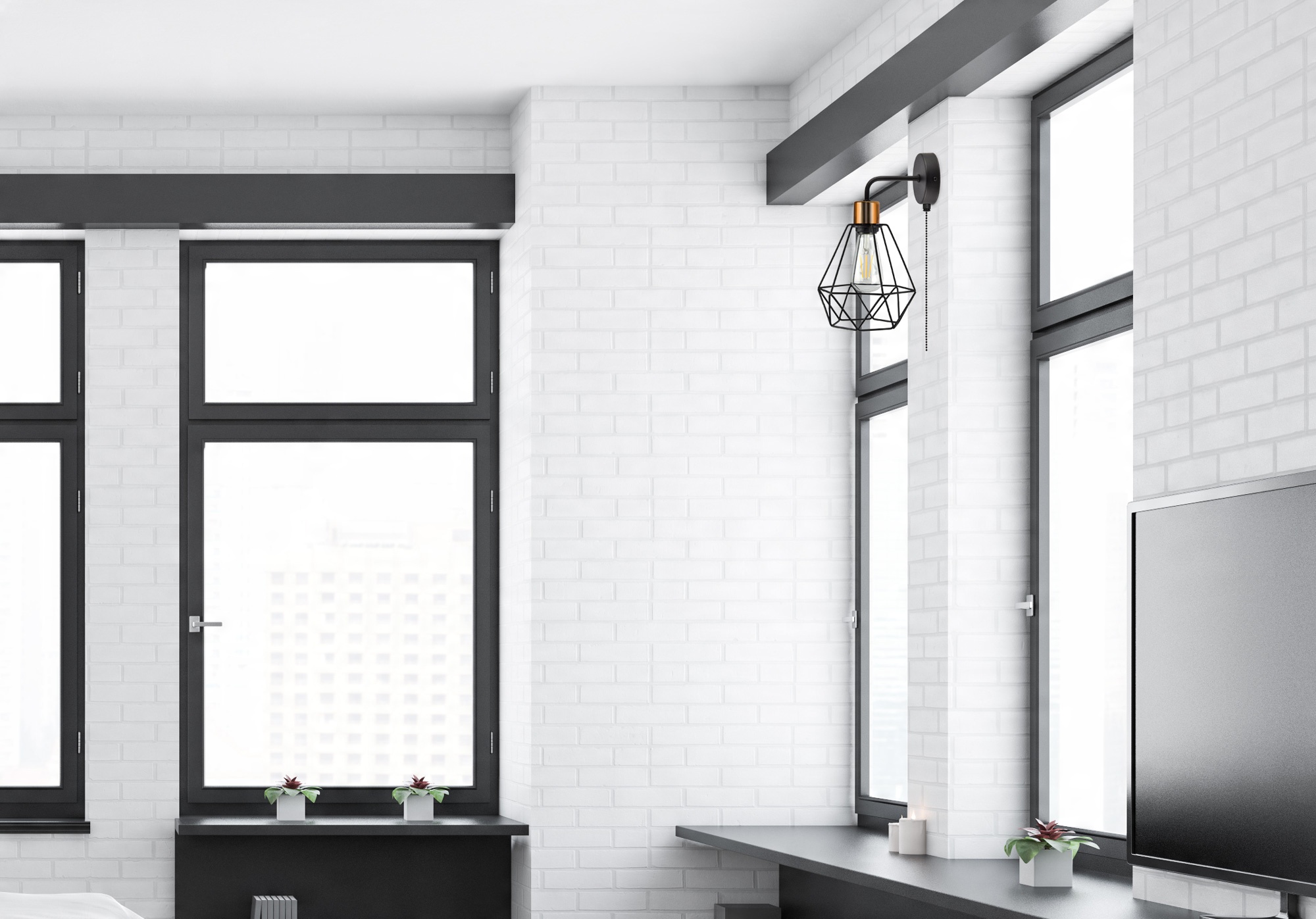 Czarna konstrukcja z elementem w kolorze miedzianym oraz modna i praktyczna osłona z drutu to świetne połączenie w nowoczesnych wnętrzach.