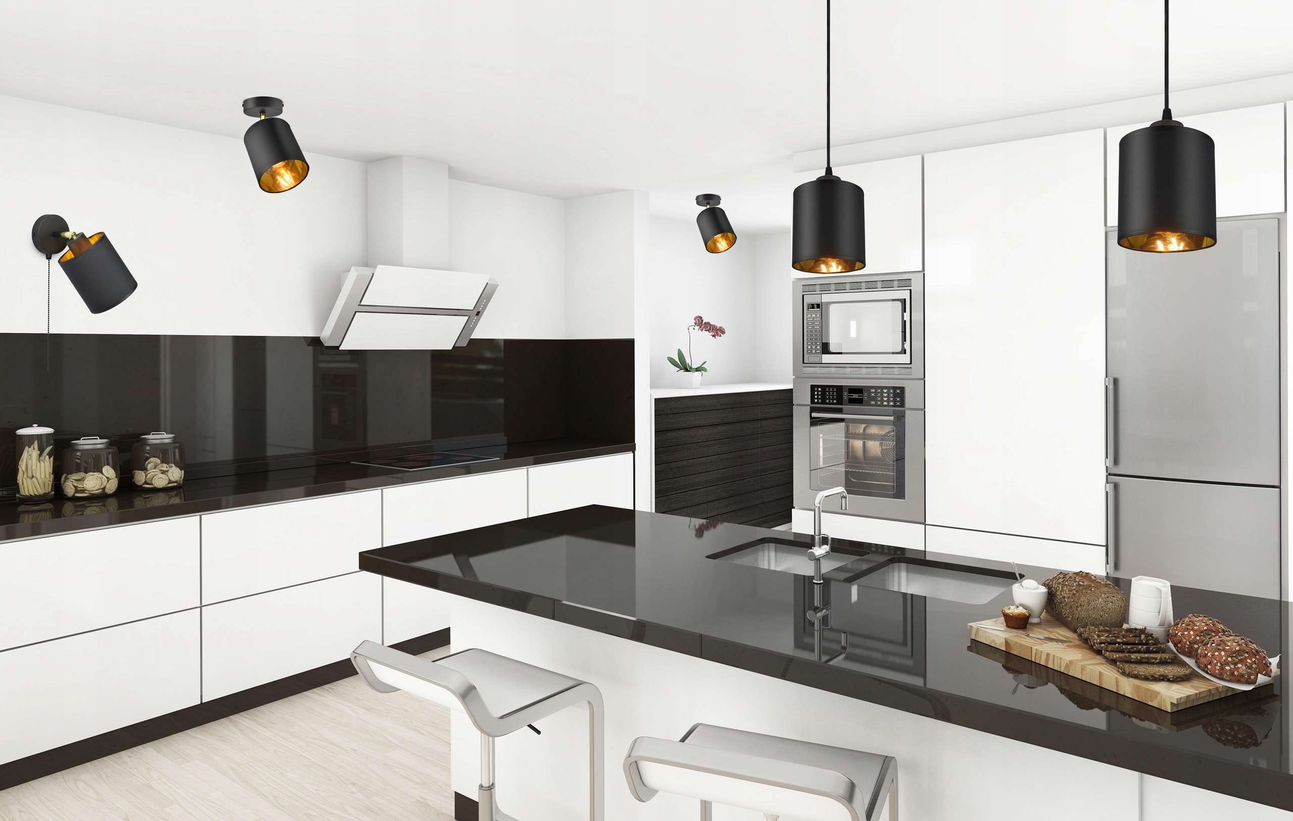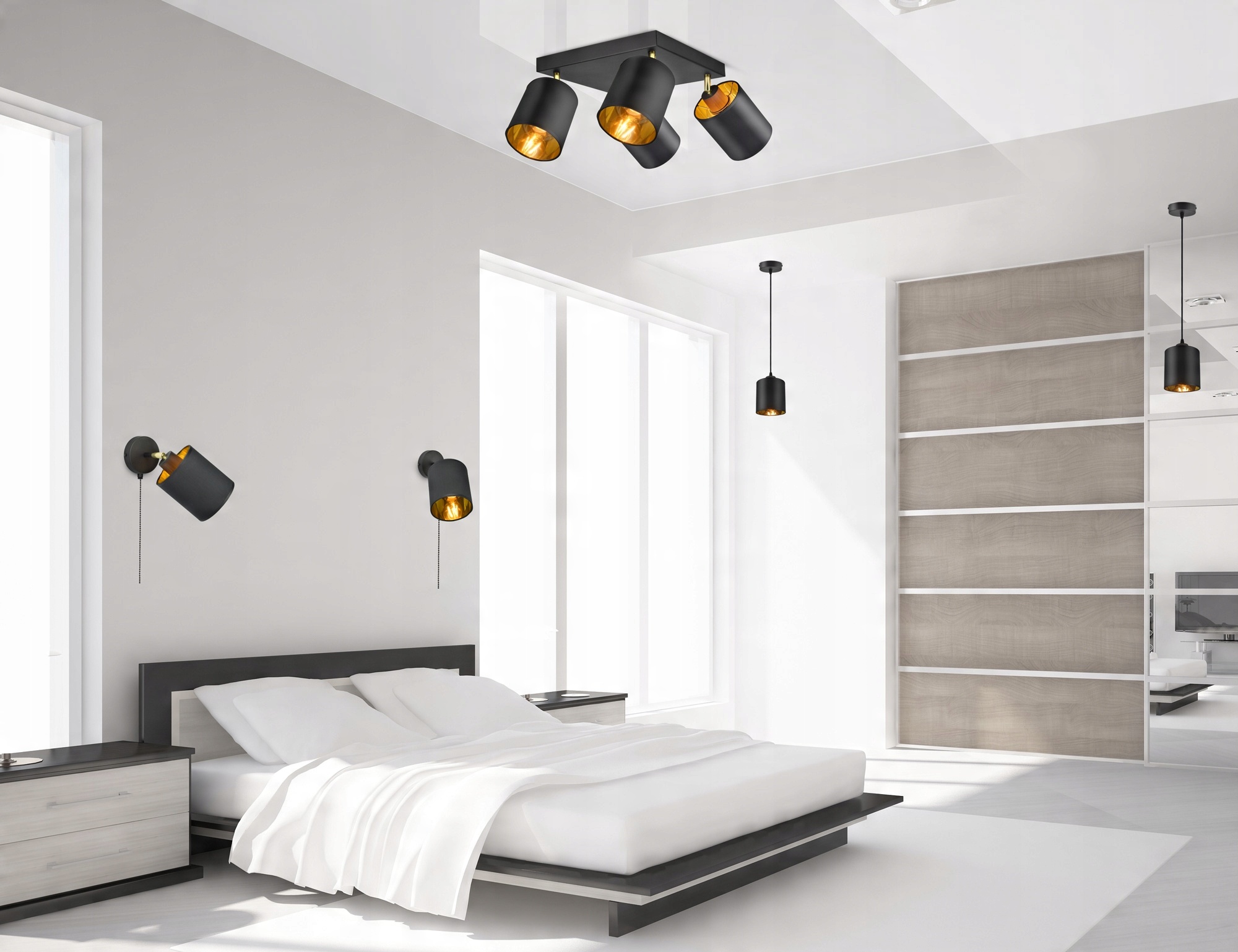 Czarna konstrukcja i abażur ze złotymi elementami to świetne połączenie w nowoczesnych wnętrzach.