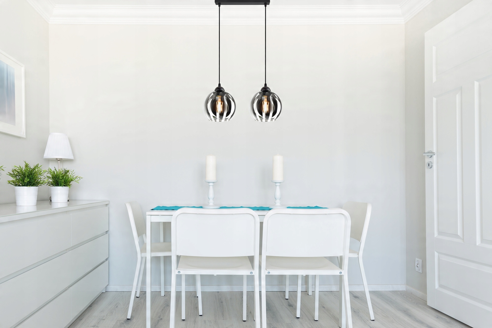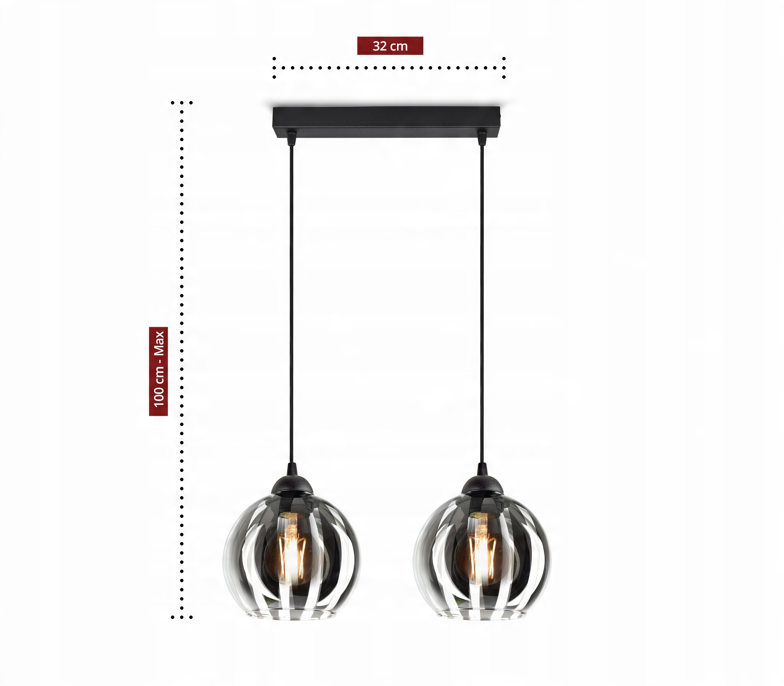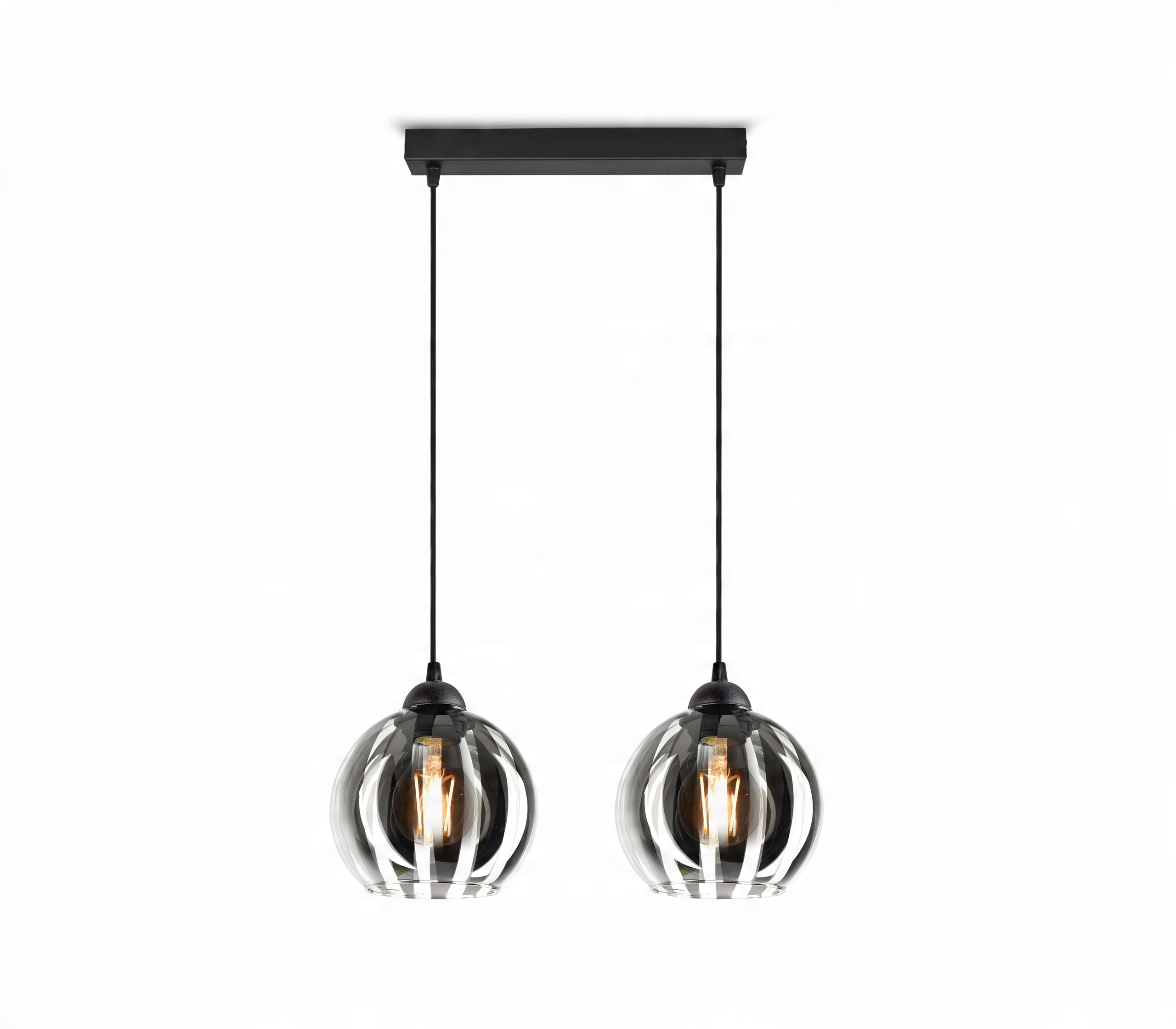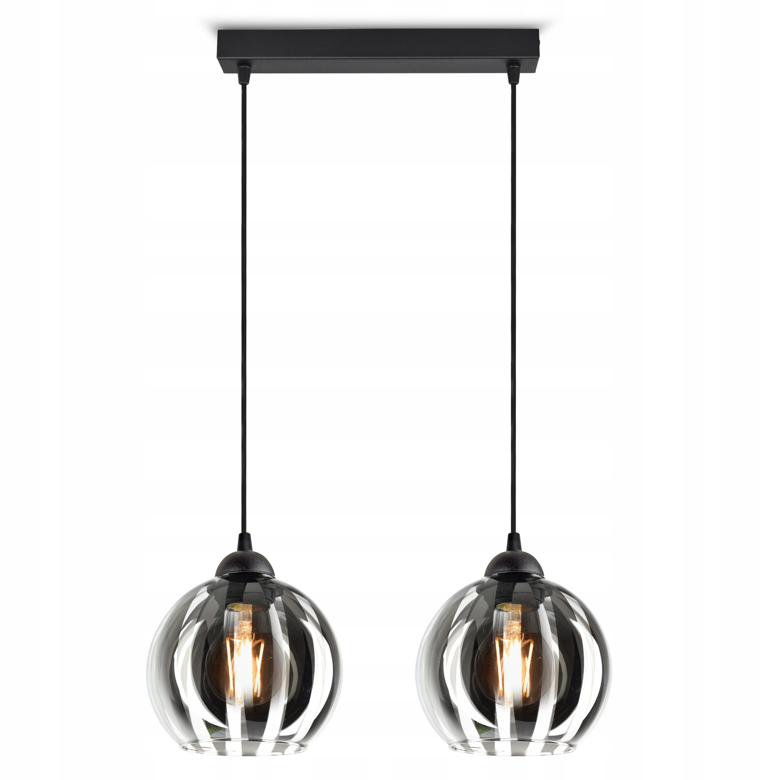 Elegancka lampa wisząca wyposażona w Dwa szklane klosze w kształcie kuli.