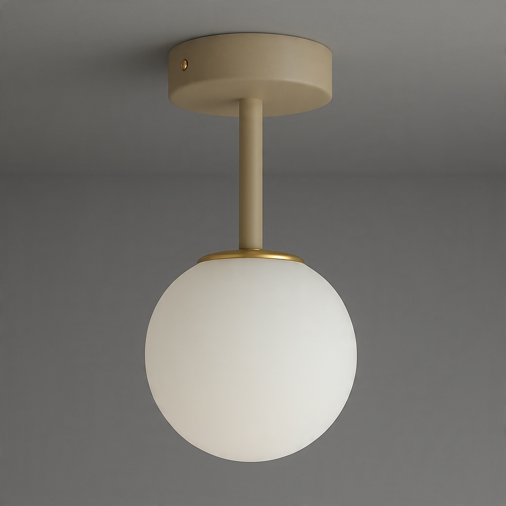 Wprowadź do swojego wnętrza wyjątkowy styl dzięki tej nowoczesnej lampie sufitowej. Klosz w formie mlecznobiałej kuli z matowego szkła delikatnie rozprasza światło, tworząc przytulną atmosferę w salonie, kuchni, sypialni lub przedpokoju. Całość dopełnia subtelny detal w kolorze złotym oraz minimalistyczna konstrukcja w odcieniu beżu.