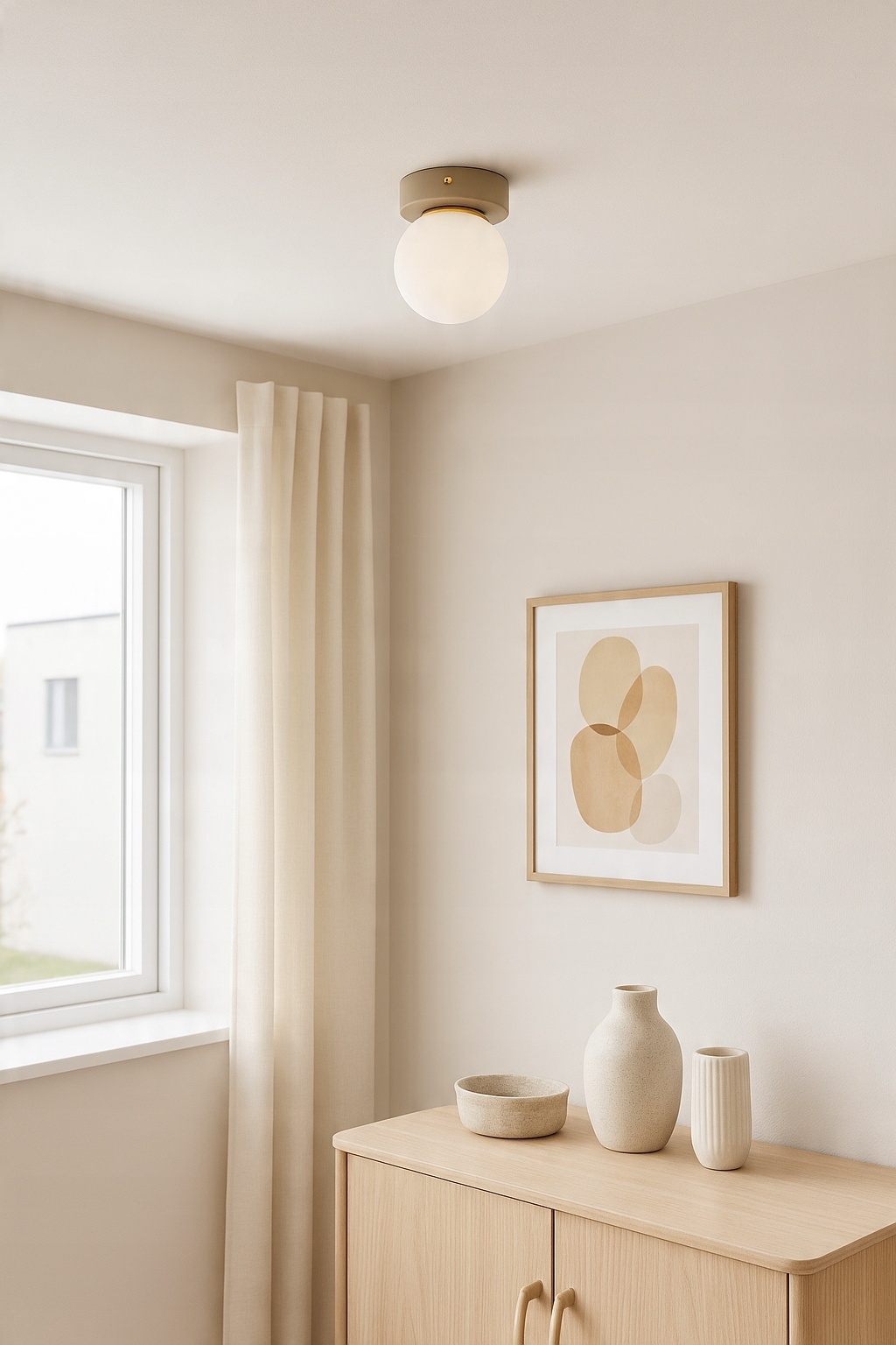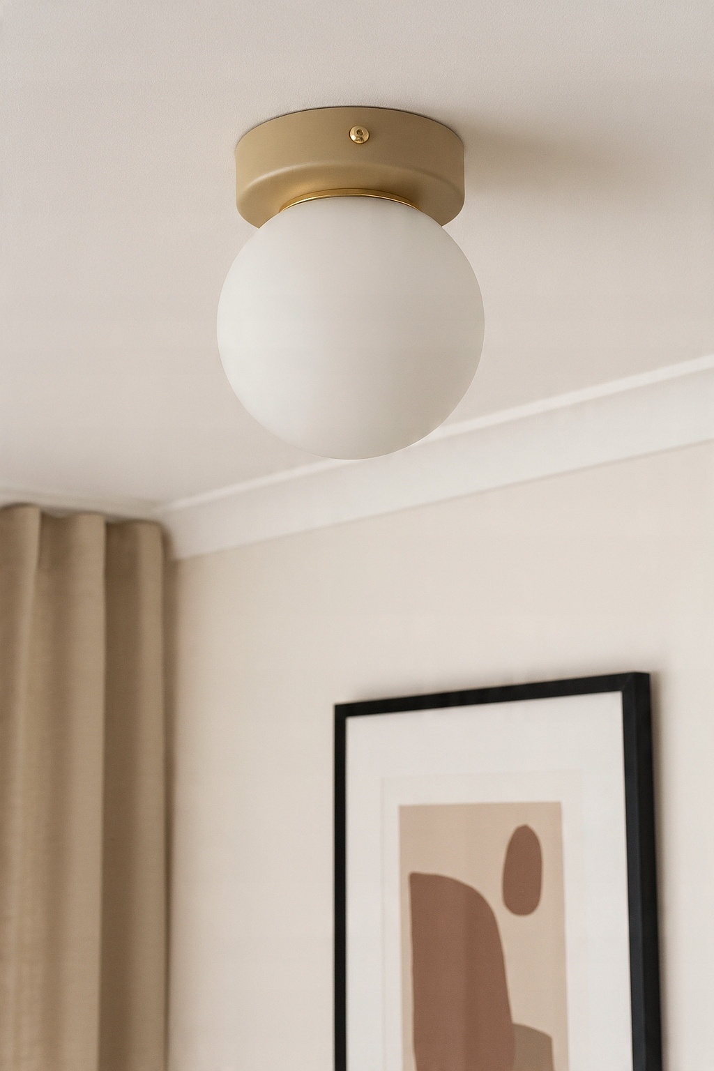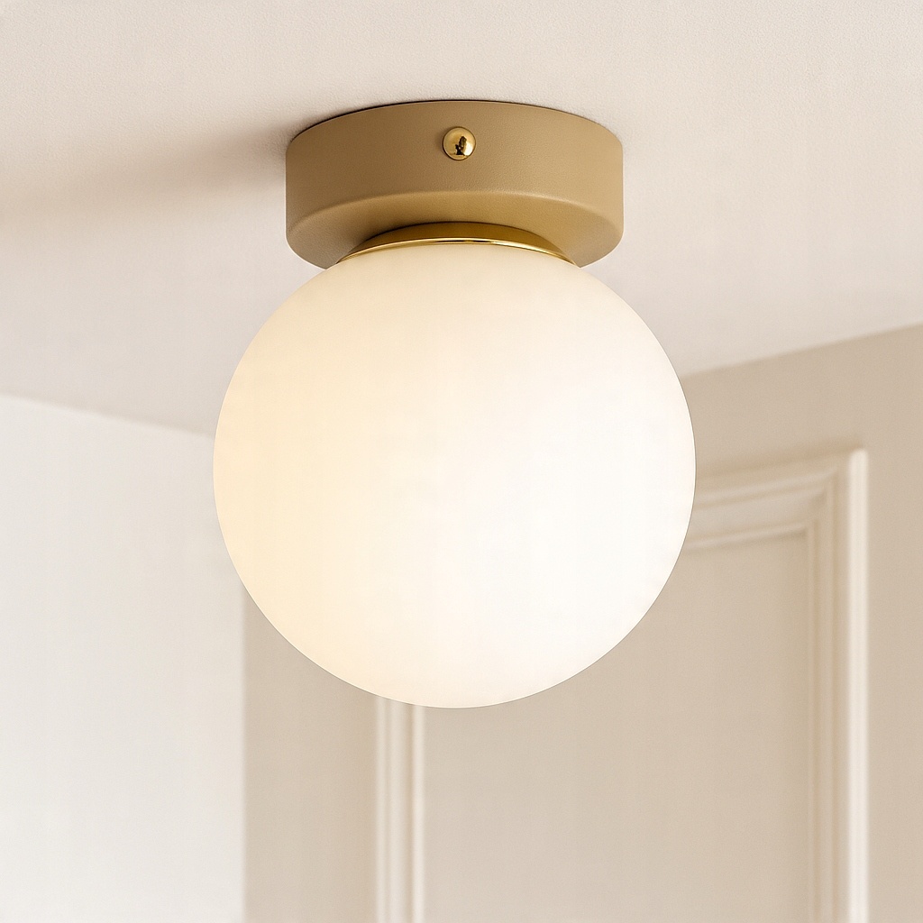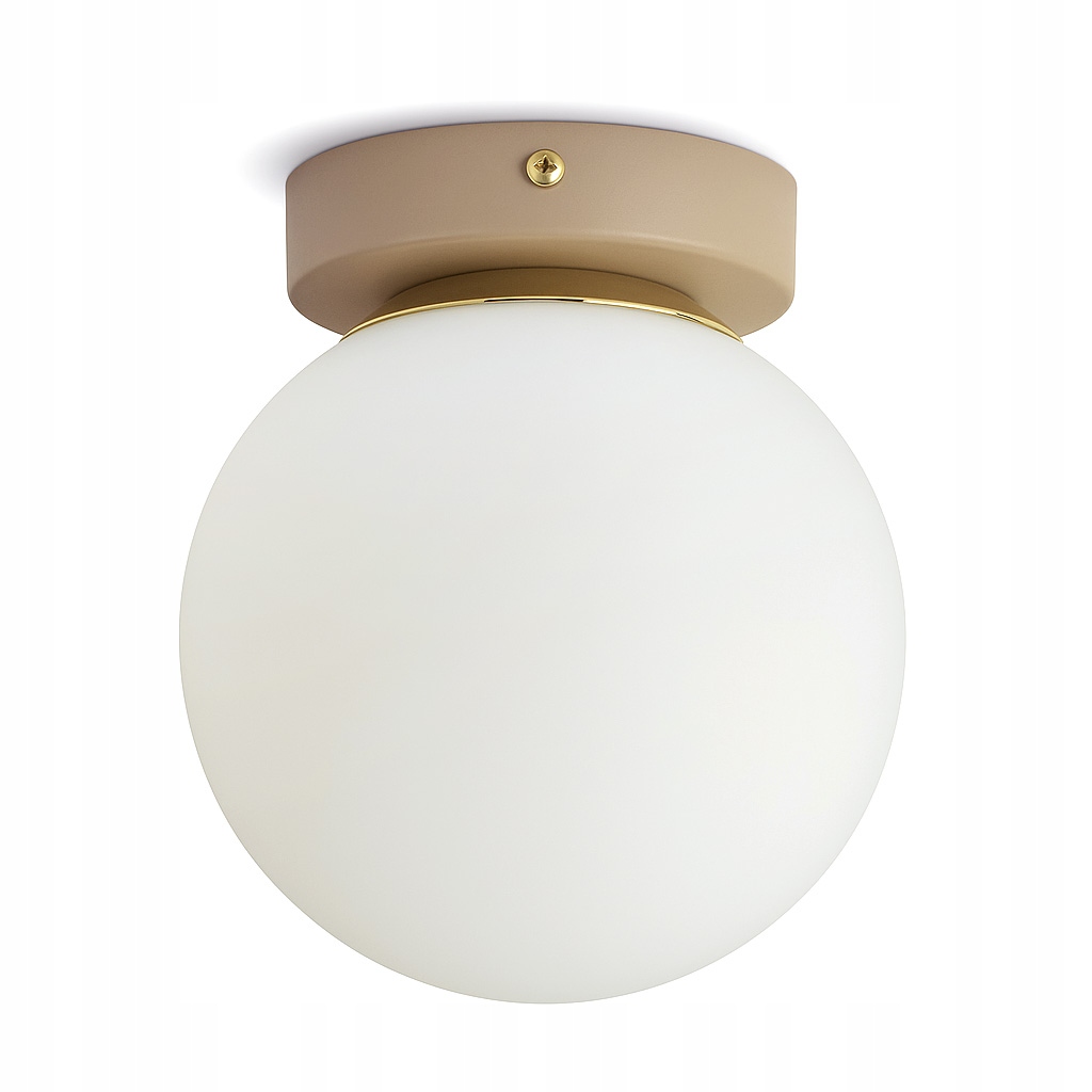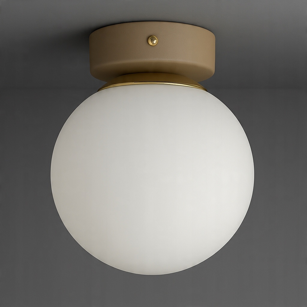 Stylowa oprawa sufitowa, która idealnie łączy ponadczasową formę z nowoczesną estetyką. Dzięki kulistemu, mlecznemu kloszowi lampa emituje miękkie, rozproszone światło, wprowadzając do wnętrza ciepłą i przytulną atmosferę. Beżowy korpus w odcieniu RAL 1019 w połączeniu ze złotym pierścieniem dodaje całości subtelnej elegancji i sprawia, że plafon doskonale prezentuje się w klasycznych, minimalistycznych i skandynawskich aranżacjach.