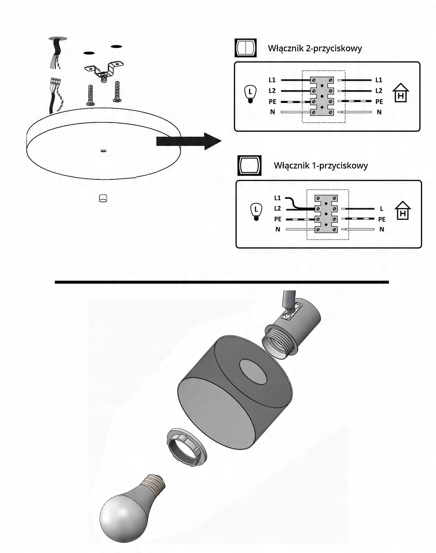 Zestaw nie zawiera żarówek, a także kołków rozporowych (należy dobrać odpowiednie do sufitu).
