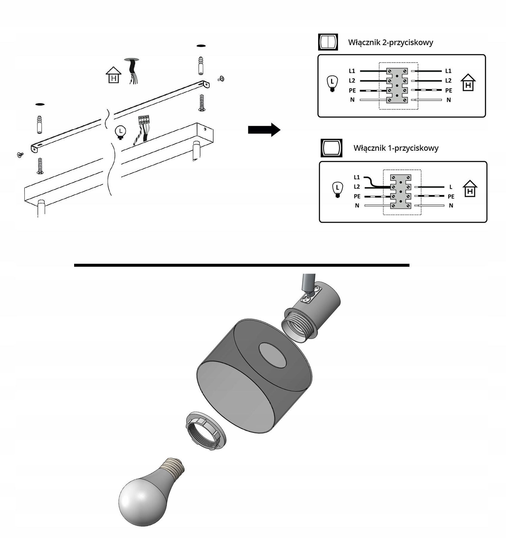 Zestaw nie zawiera żarówek, a także kołków rozporowych (należy dobrać odpowiednie do sufitu).
