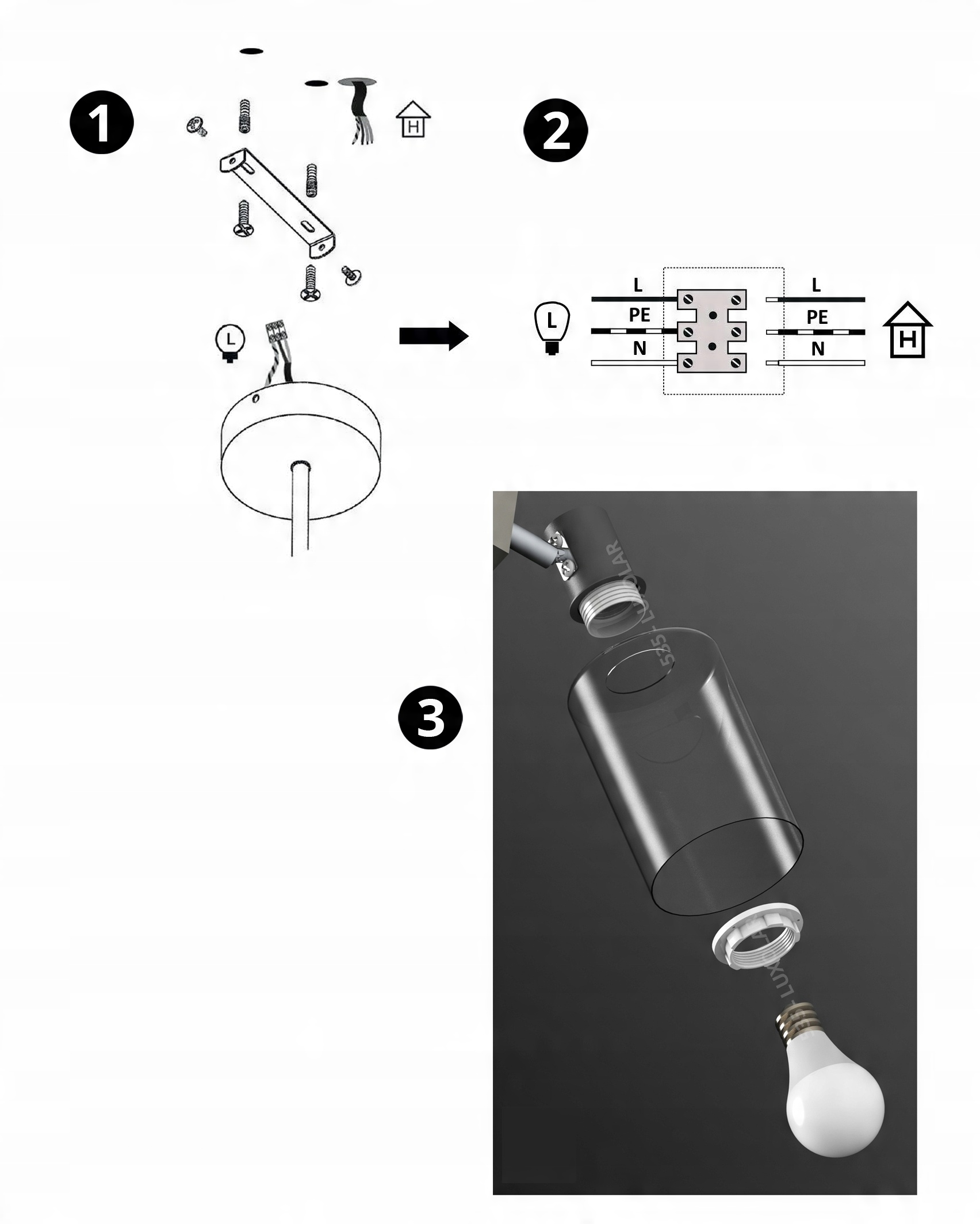 Zestaw nie zawiera żarówek , a także kołków rozporowych (należy dobrać odpowiednie do sufitu).