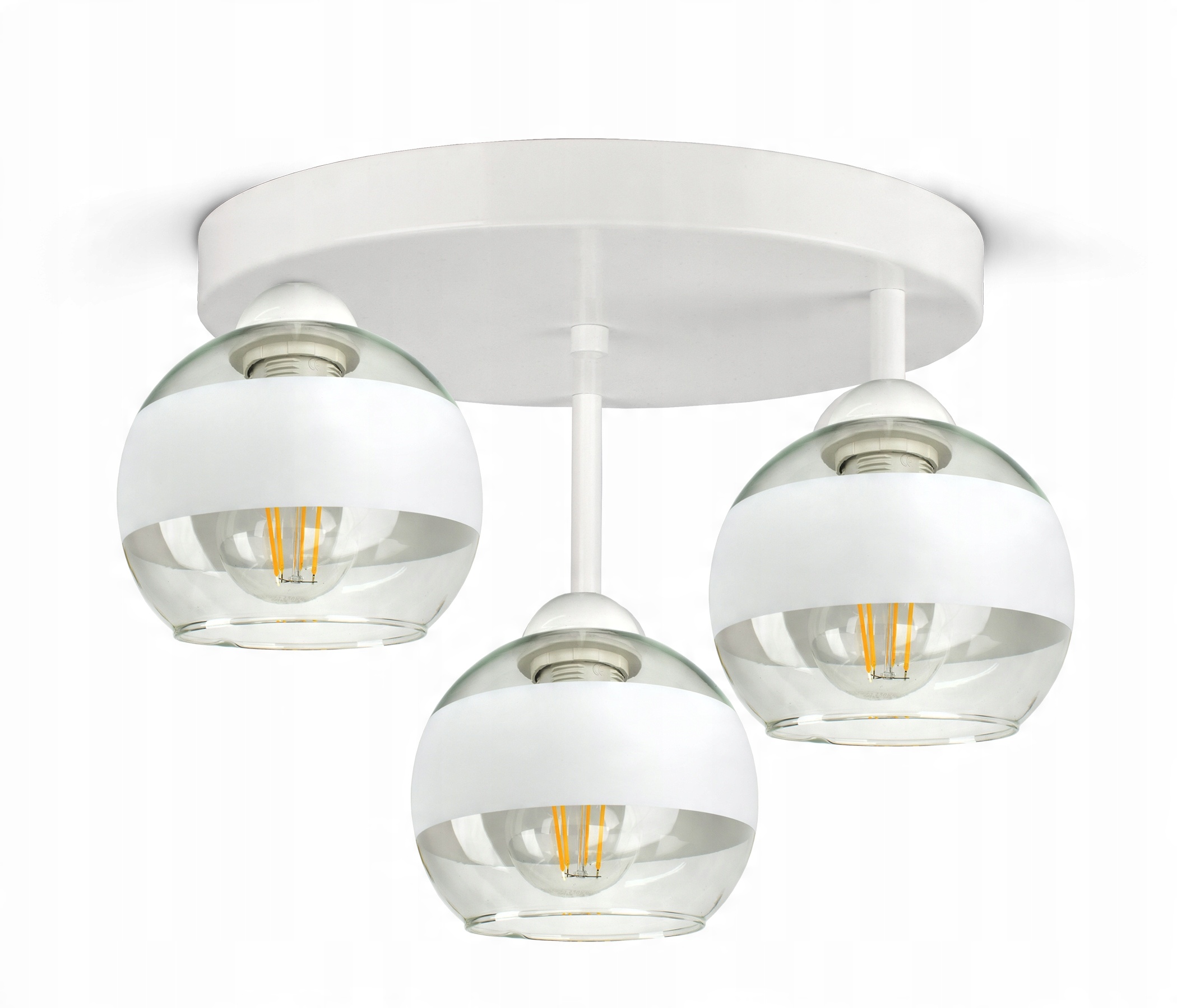 ✅ Lampa wyposażona w szklane klosze w kształcie kuli z białym pasem w części centralnej.