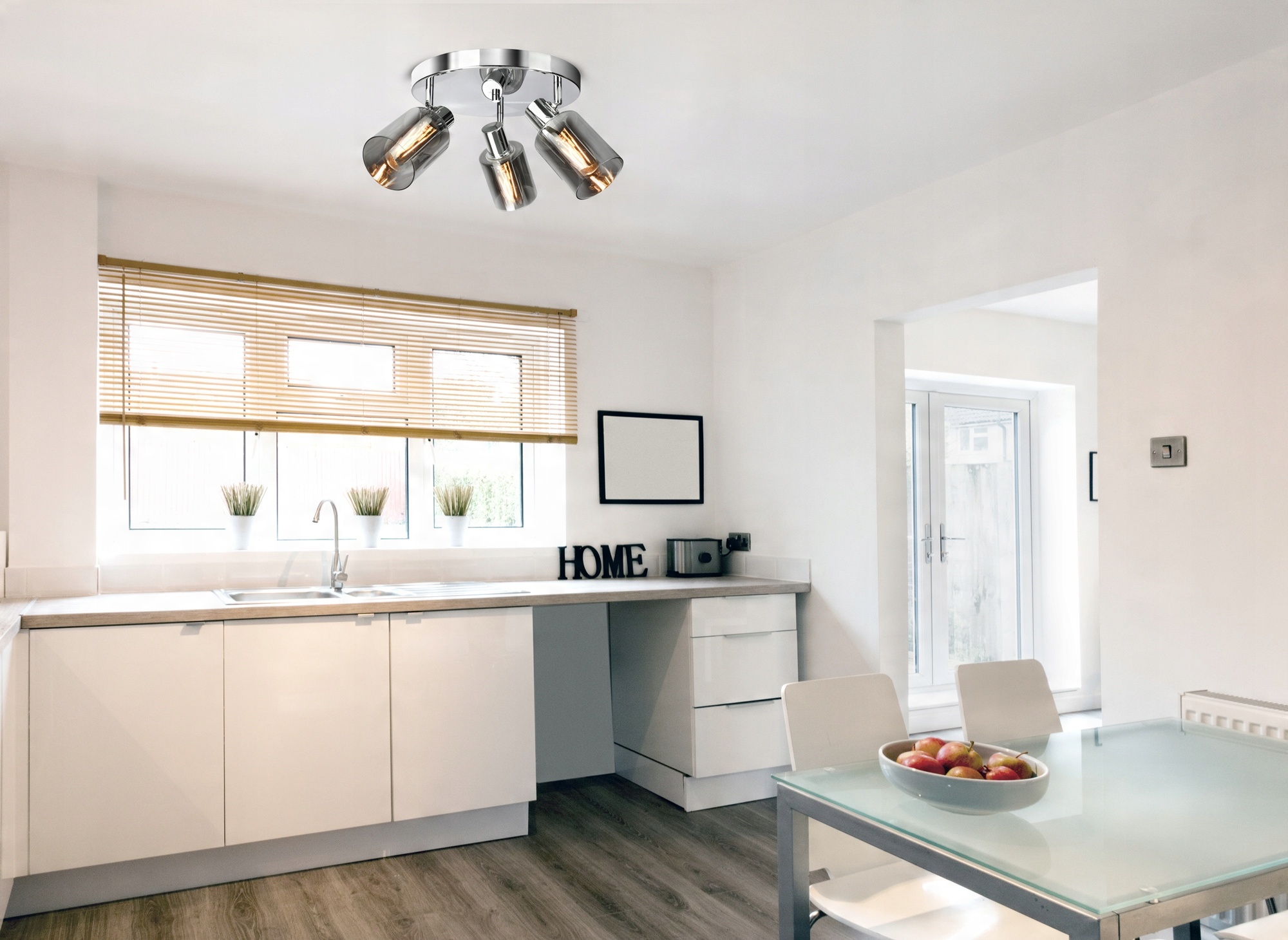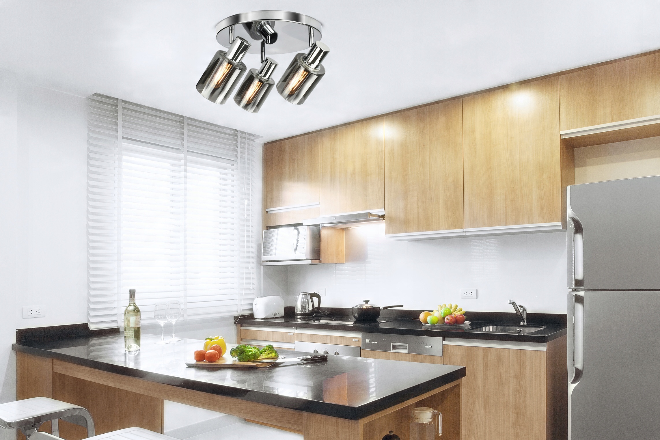 Oprawa natynkowa, metalowa ze szklanymi kloszami mająca zastosowanie jako oświetlenie wewnętrzne, z wyłączeniem miejsc o podwyższonej wilgotności.