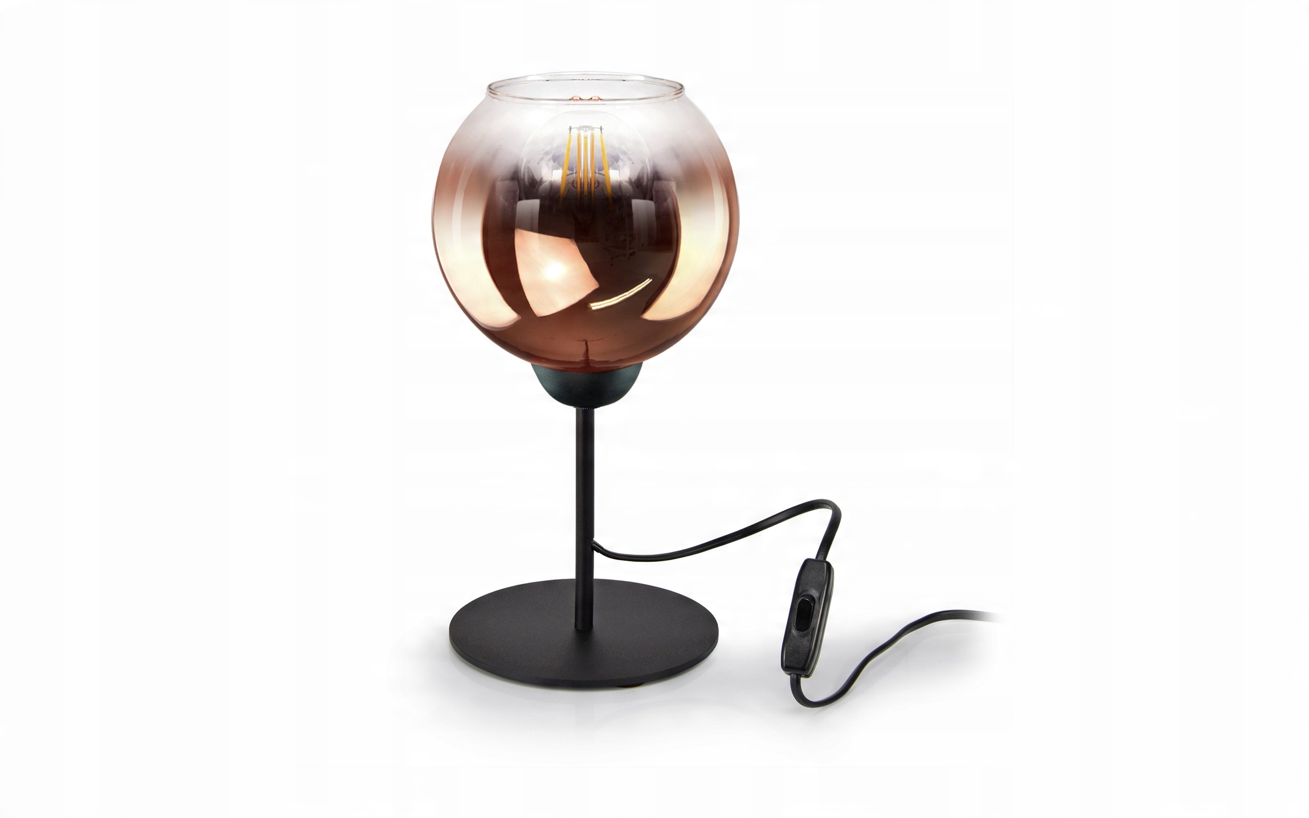 Lampka nocna stołowa dekoracyjna wyposażona w szklany klosz w kształcie kuli w kolorze Miedziano-Transparentnym.