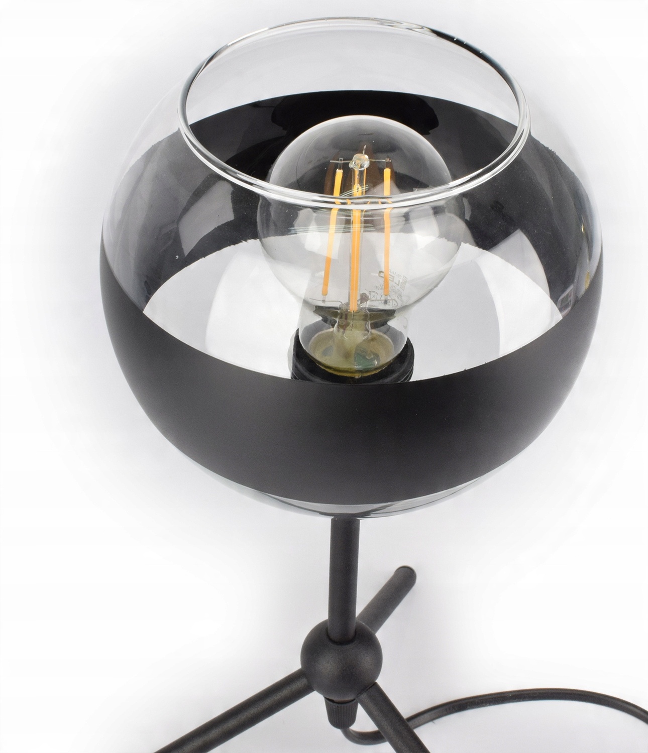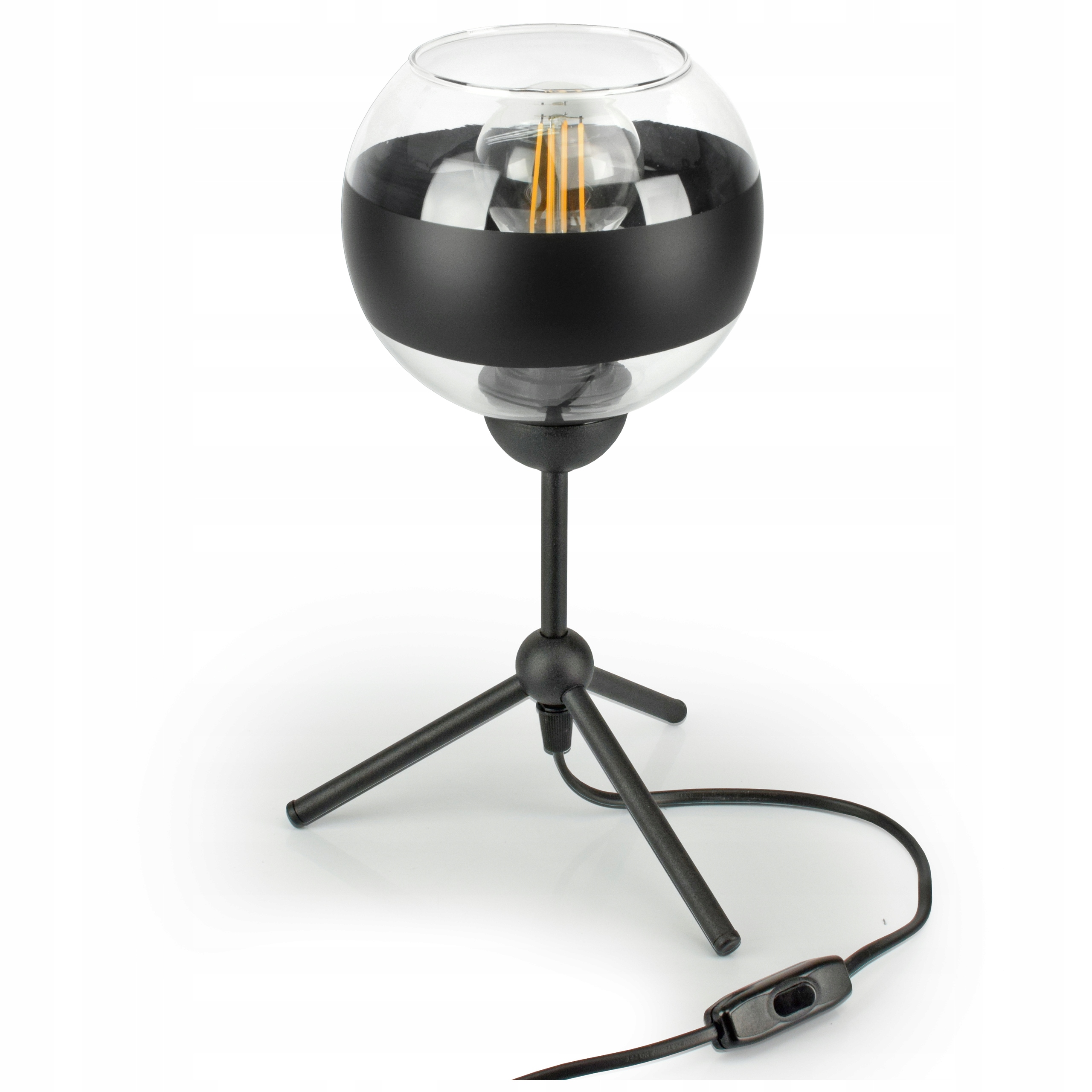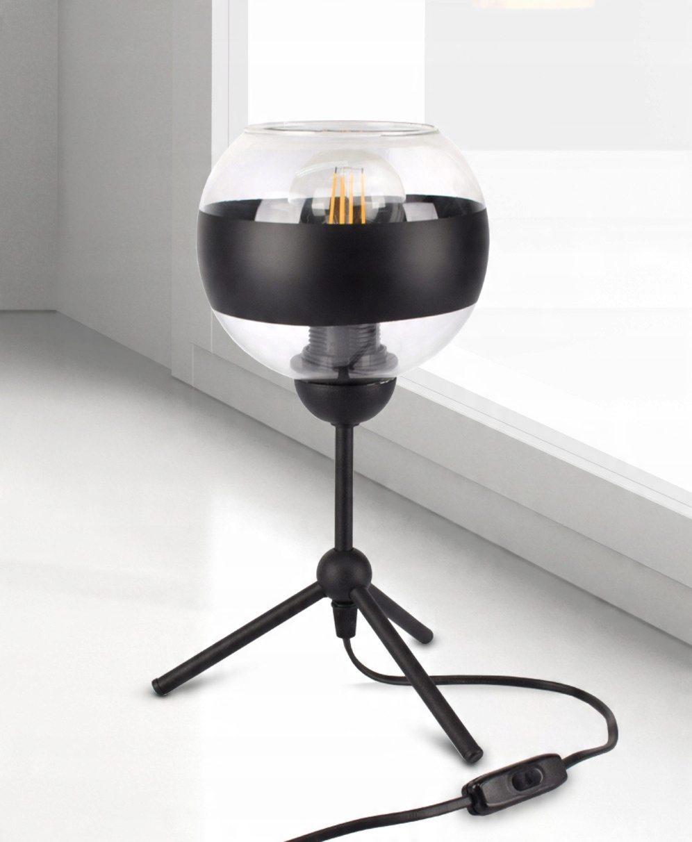 ✅ Lampa wyposażona w szklany klosz w kształcie kuli z czarnym pasem w części centralnej.