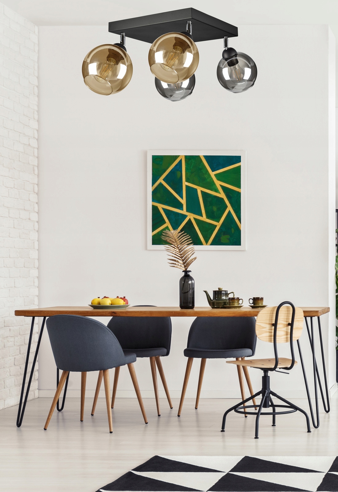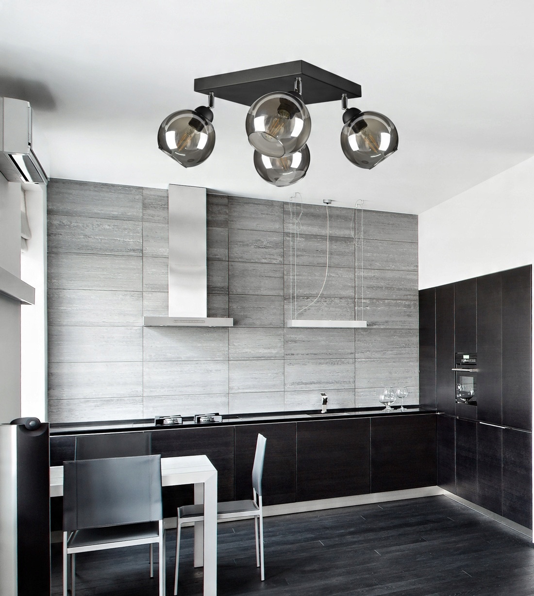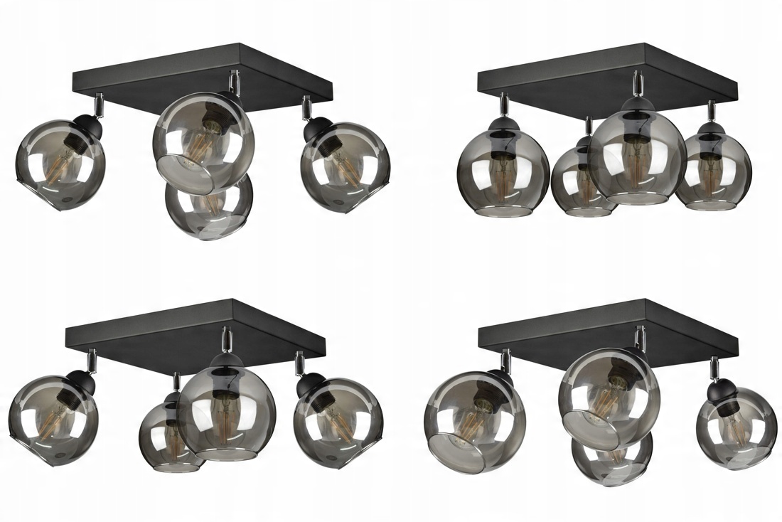Praktyczna i nowoczesna lampa wisząca wyposażona w cztery szklane klosze dostępne do wyboru w różnych odcieniach.