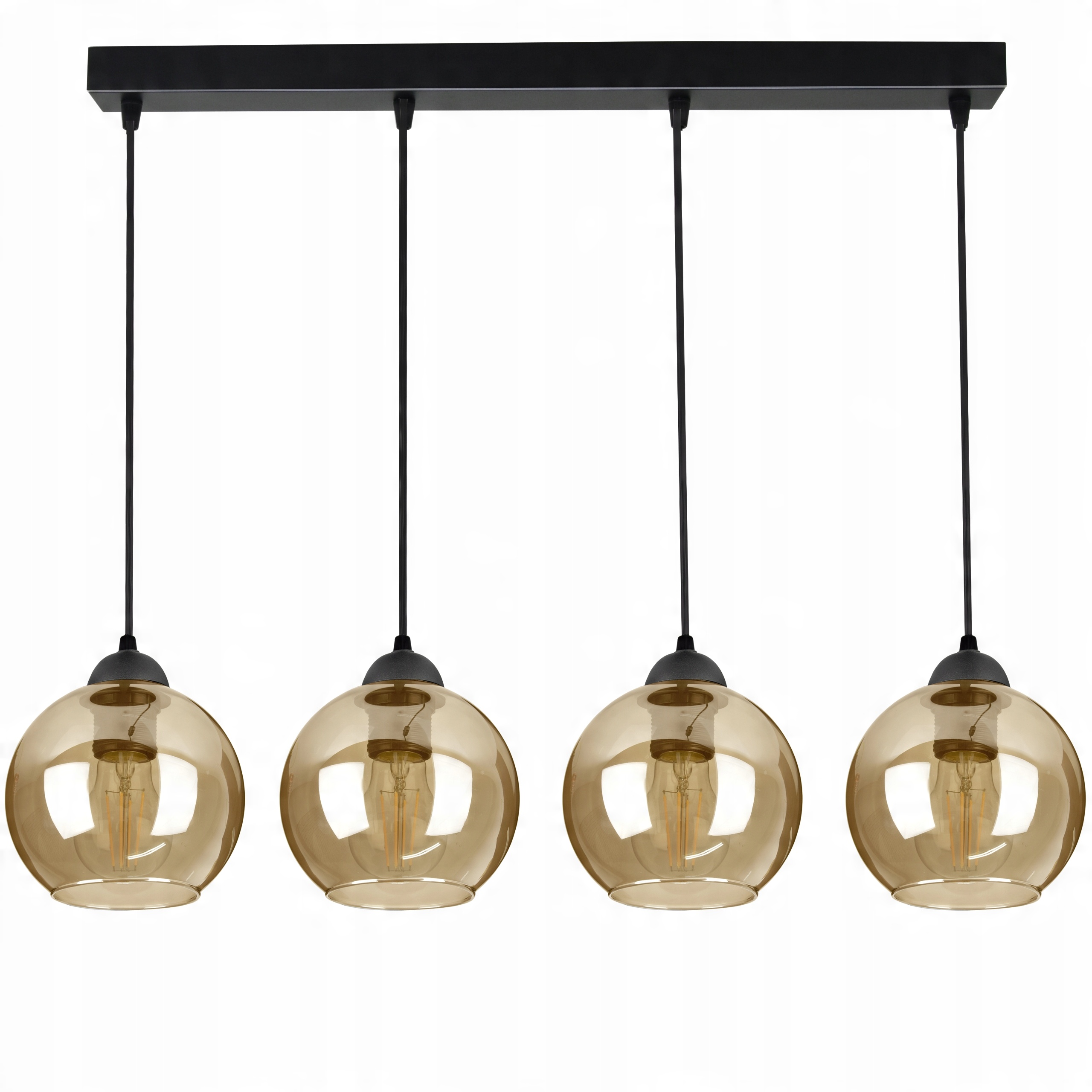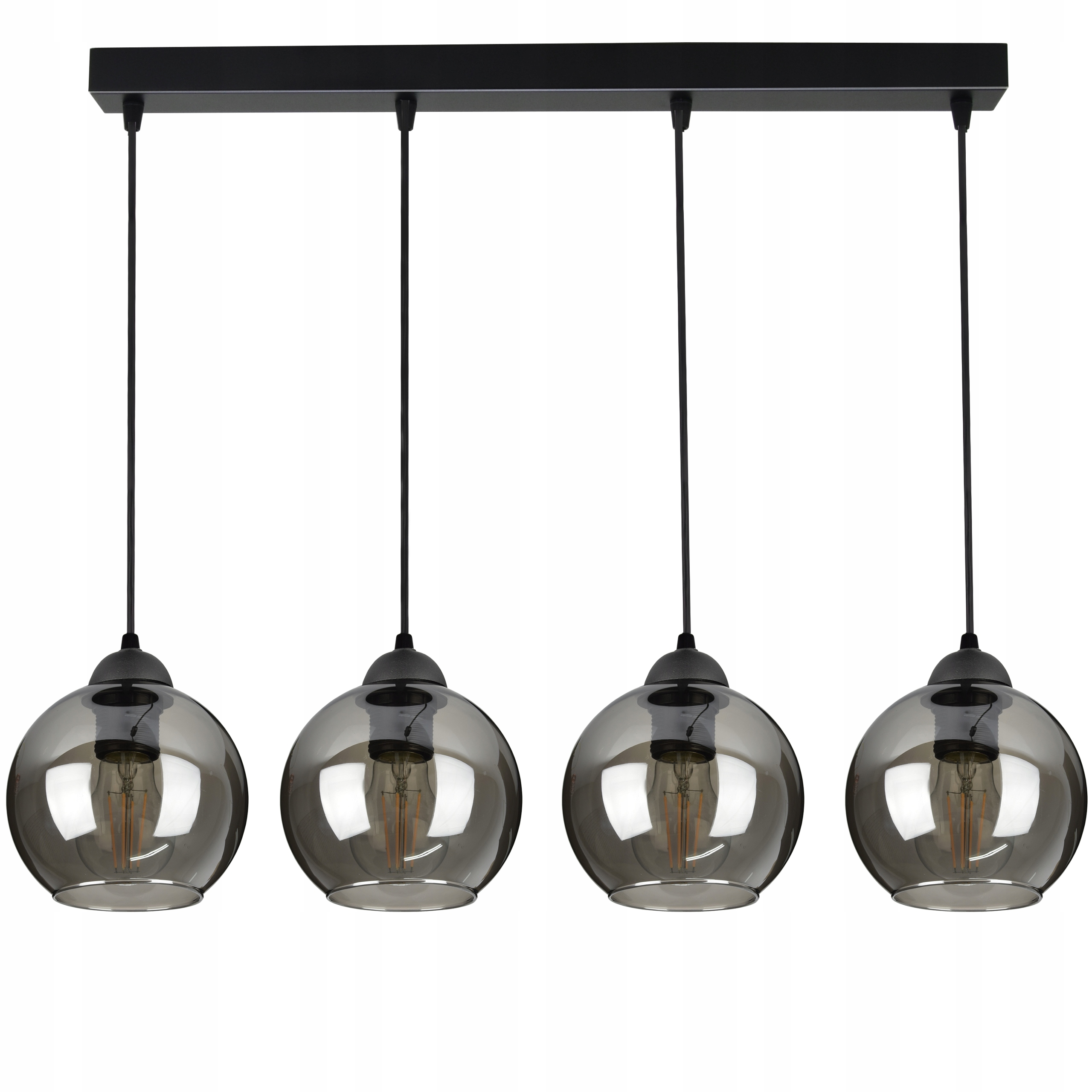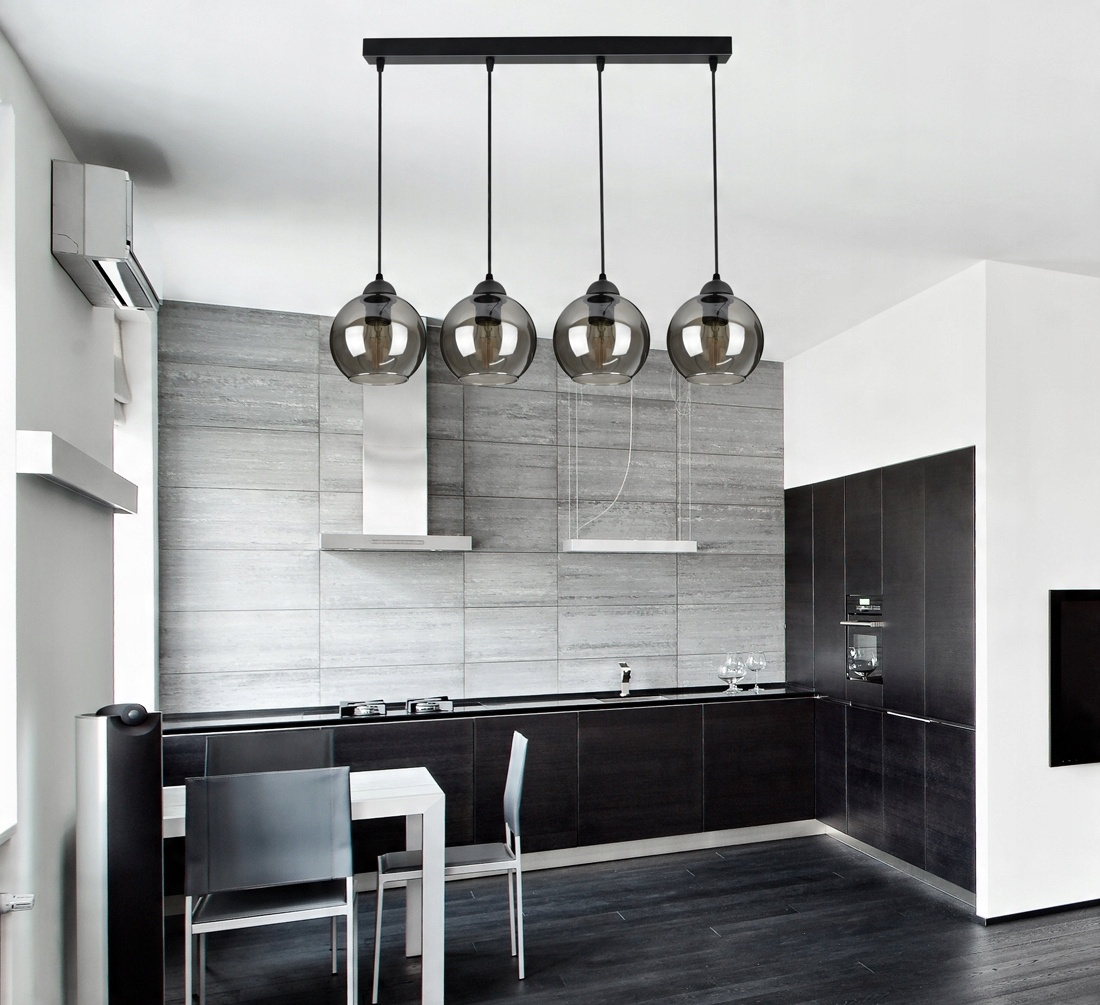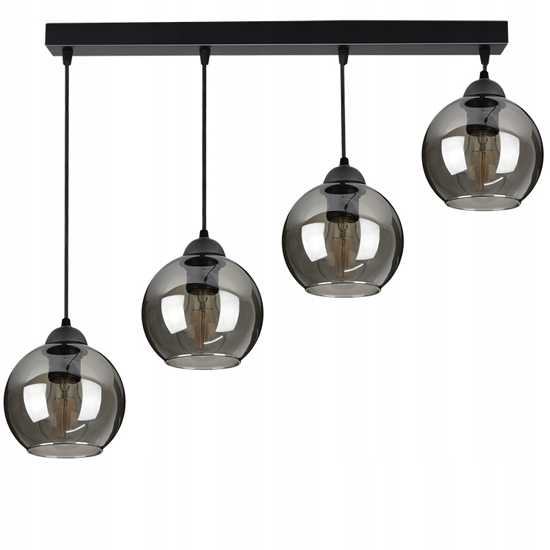 Nowoczesna lampa wisząca wyposażona w cztery szklane klosze dostępne do wyboru w różnych kolorach.