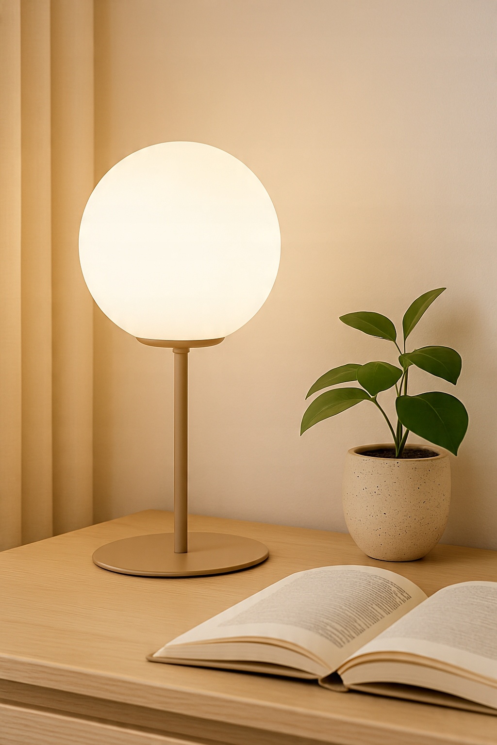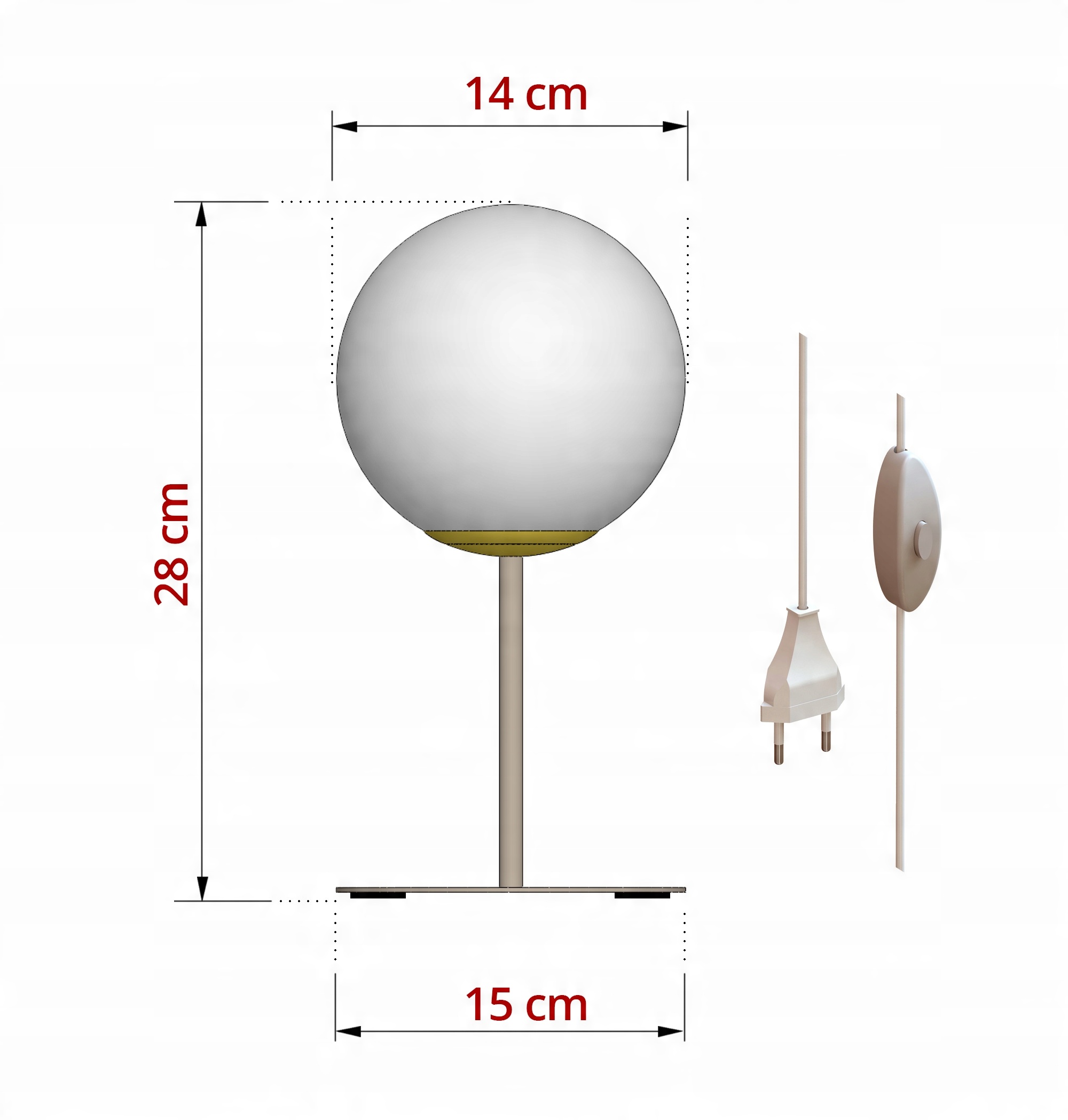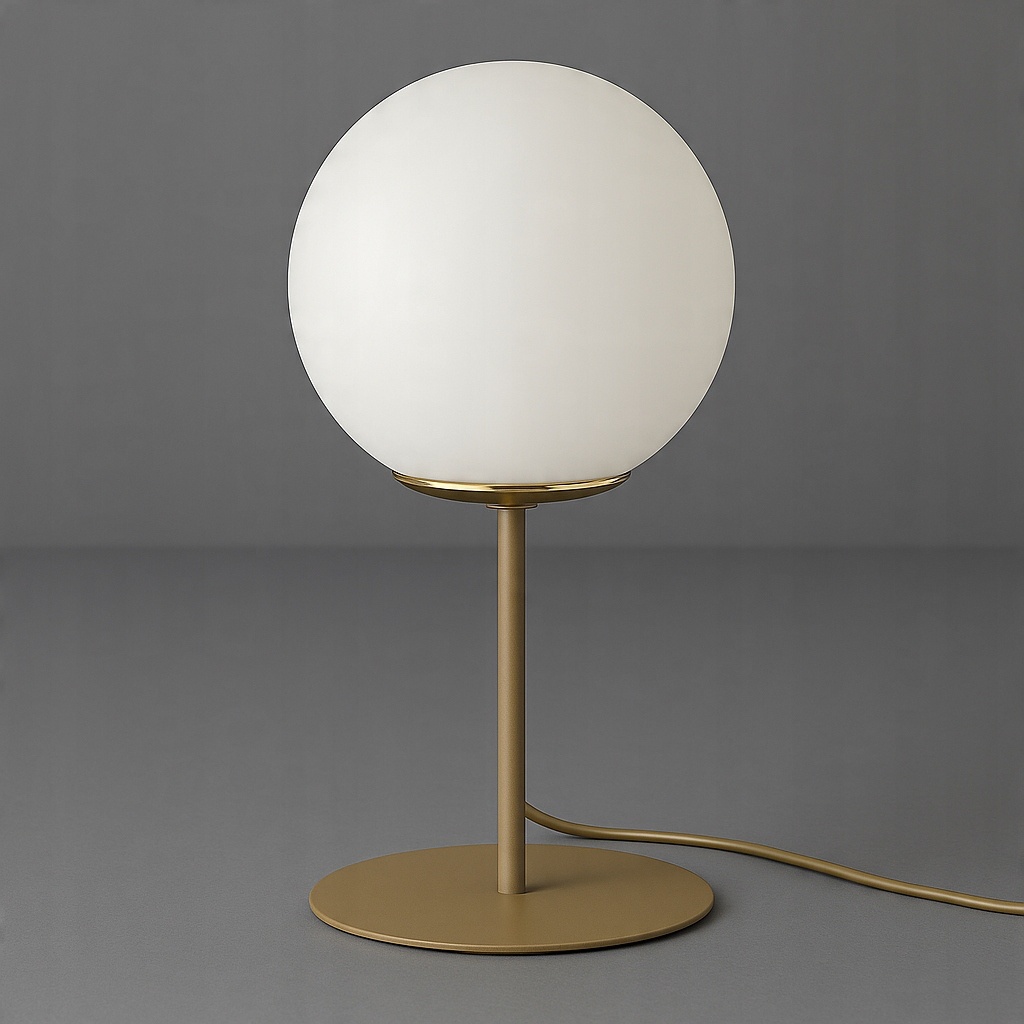 Matowa kula o średnicy 14 cm rozprasza światło w delikatny, nastrojowy sposób, tworząc wyjątkową atmosferę w sypialni, salonie czy domowym biurze. Stabilna, cienka podstawa i smukła konstrukcja o wysokości 28 cm sprawiają, że lampka prezentuje się lekko i elegancko.