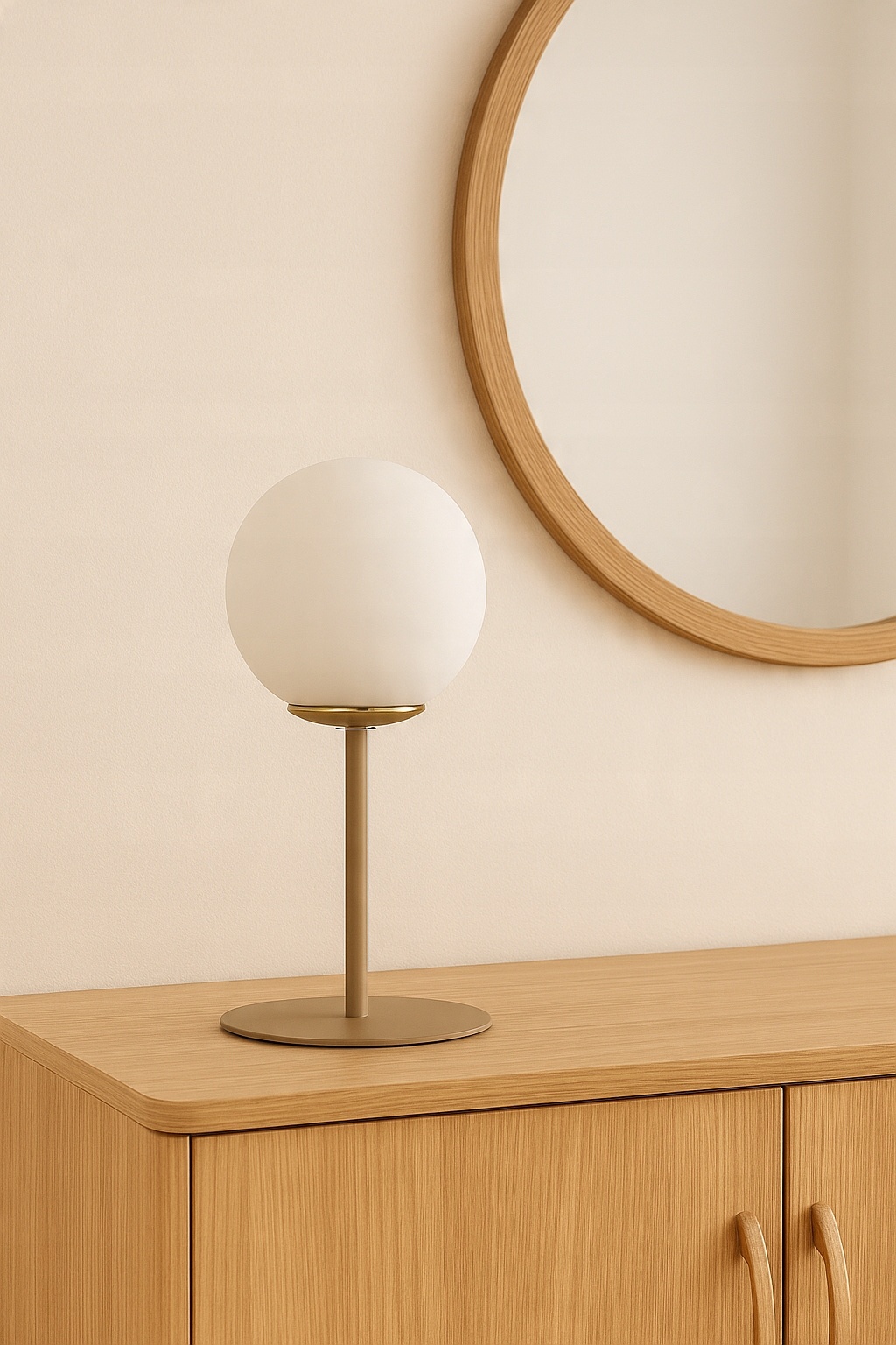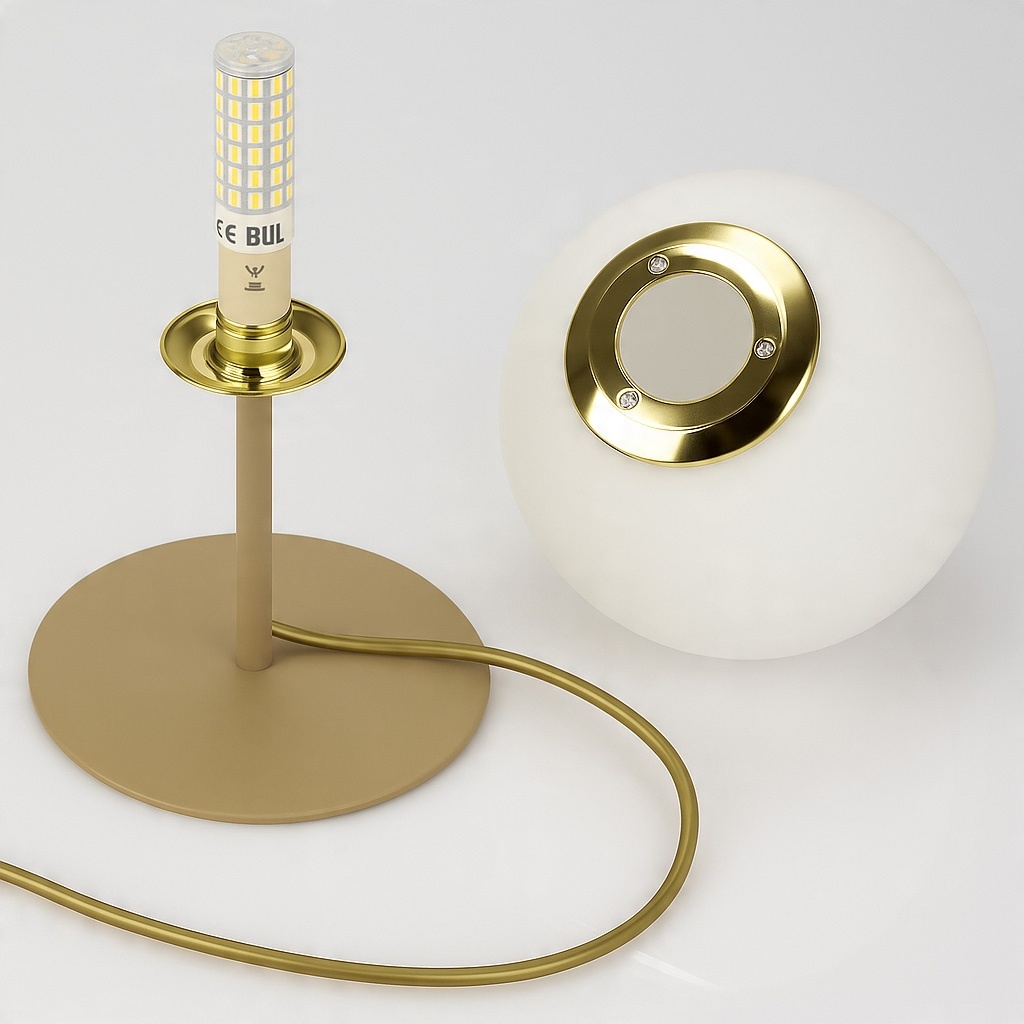 Stylowa lampka stołowa z matowym, szklanym kloszem to doskonałe połączenie nowoczesnego designu i przytulnego charakteru. Jej stonowany kolor RAL 1019 (beżowo-szary) w połączeniu ze złotymi akcentami sprawia, że doskonale wpisuje się w modne aranżacje wnętrz – od skandynawskich, przez japandi, aż po klasyczne.