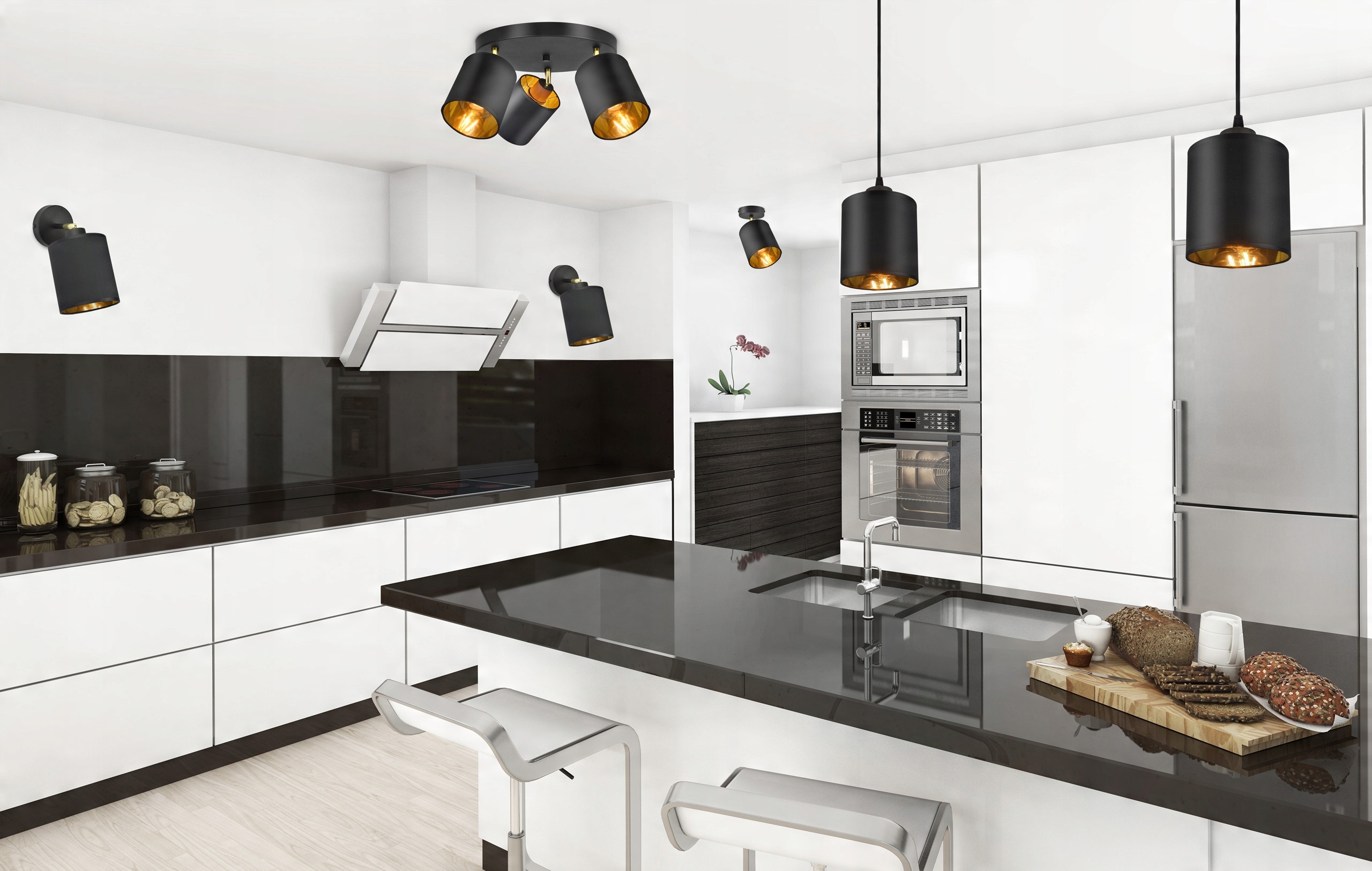 Czarna konstrukcja i abażury ze złotymi elementami to świetne połączenie w nowoczesnych wnętrzach.