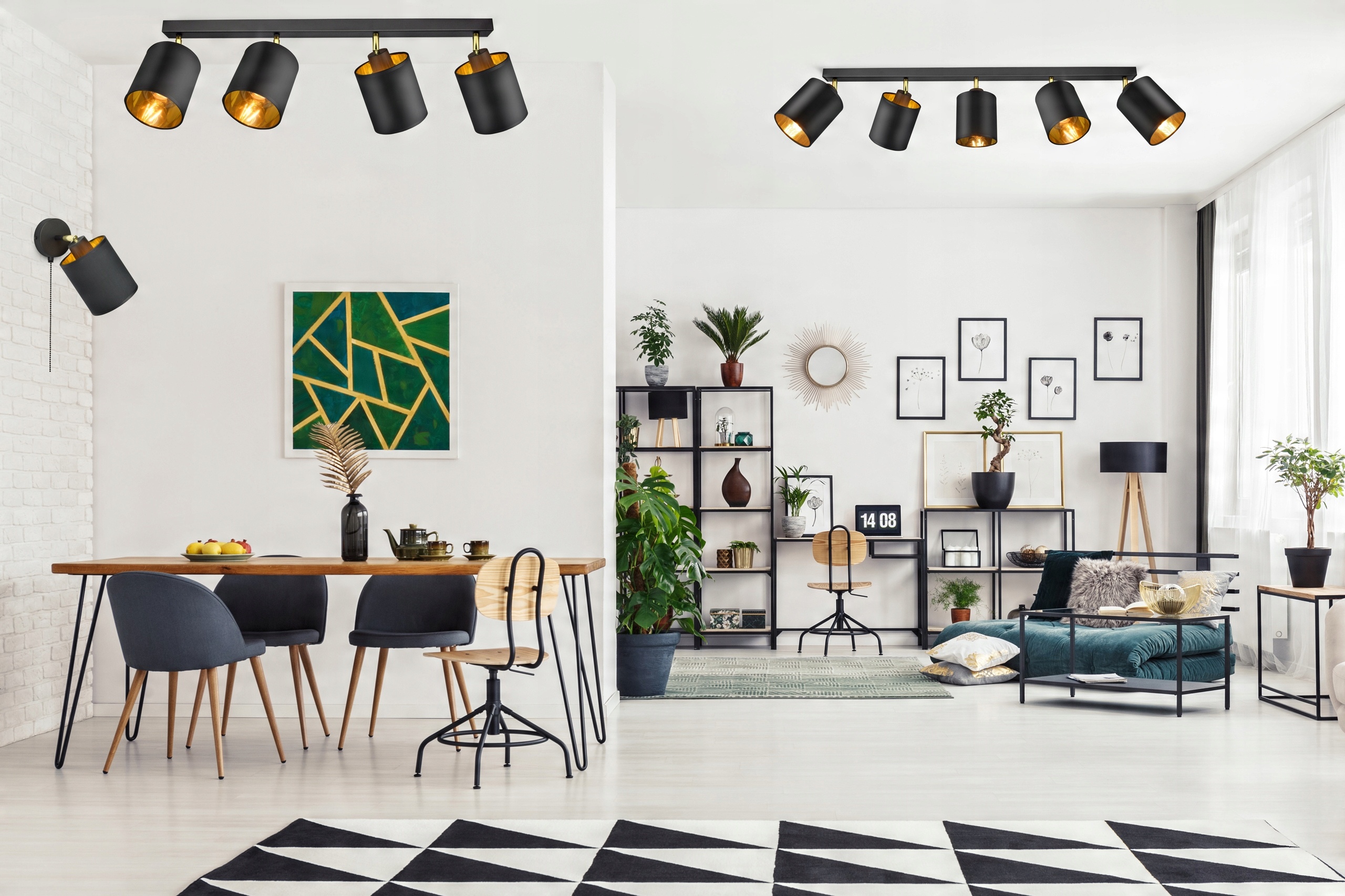 Czarna konstrukcja i abażury ze złotymi elementami to świetne połączenie w nowoczesnych wnętrzach.