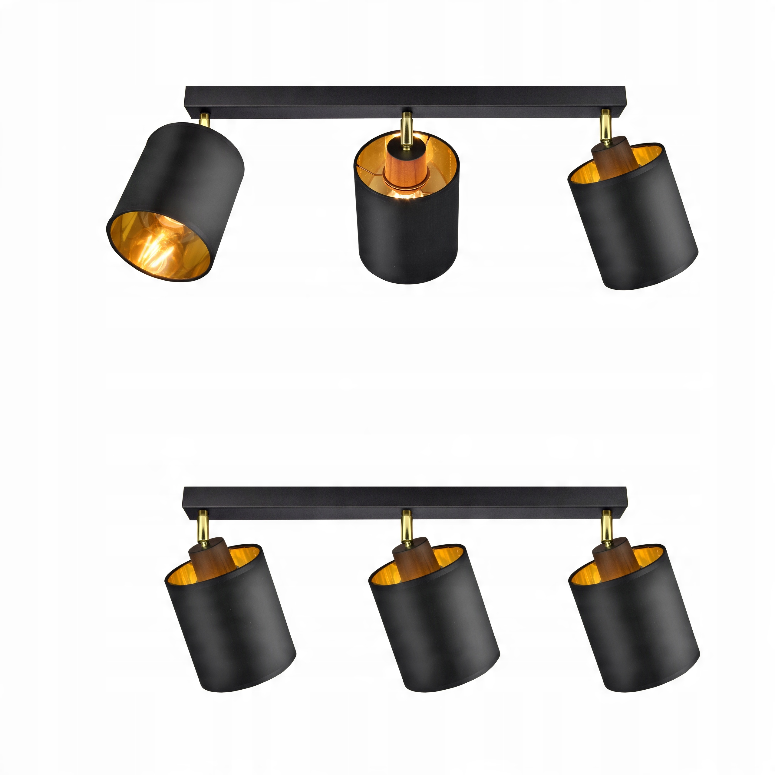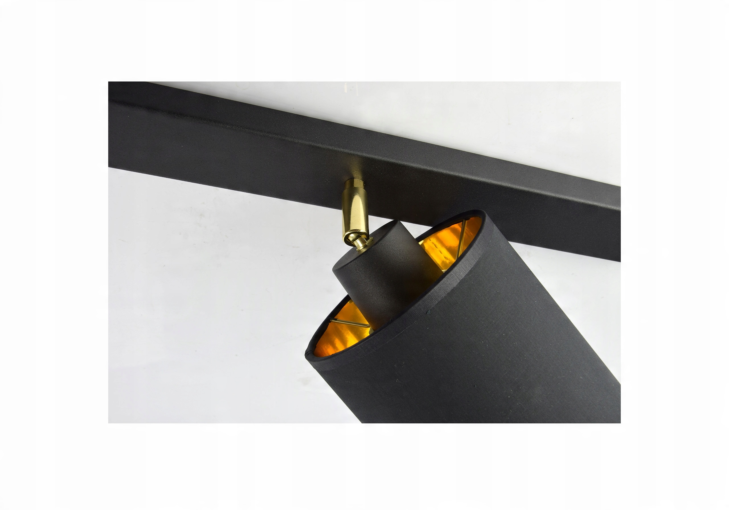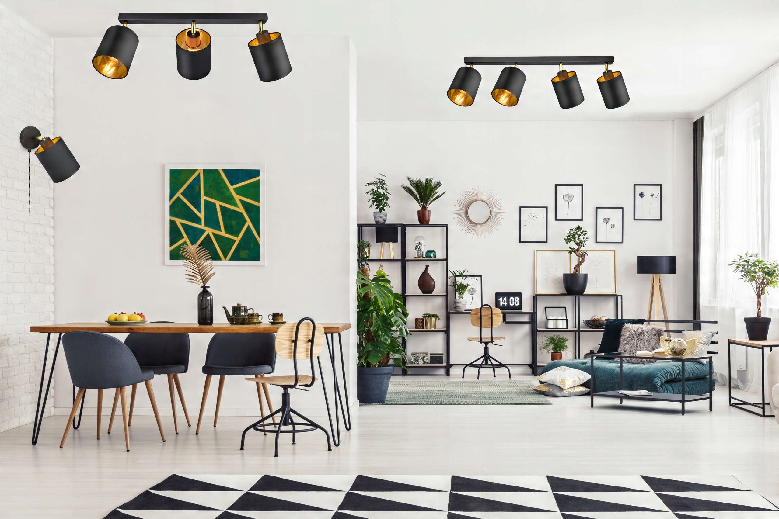 Czarna konstrukcja i abażury ze złotymi elementami to świetne połączenie w nowoczesnych wnętrzach.