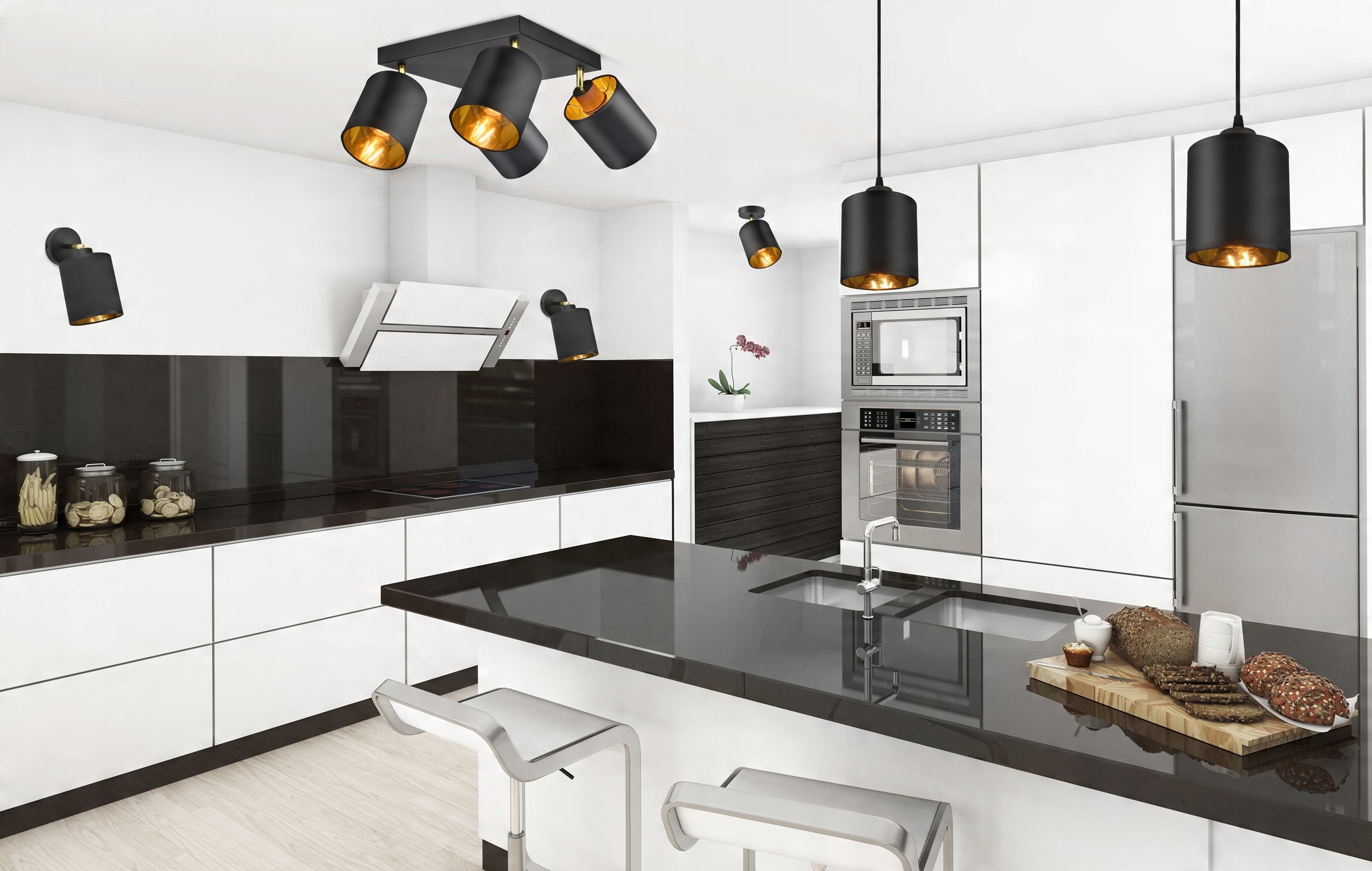 Czarna konstrukcja i abażury ze złotymi elementami to świetne połączenie w nowoczesnych wnętrzach.