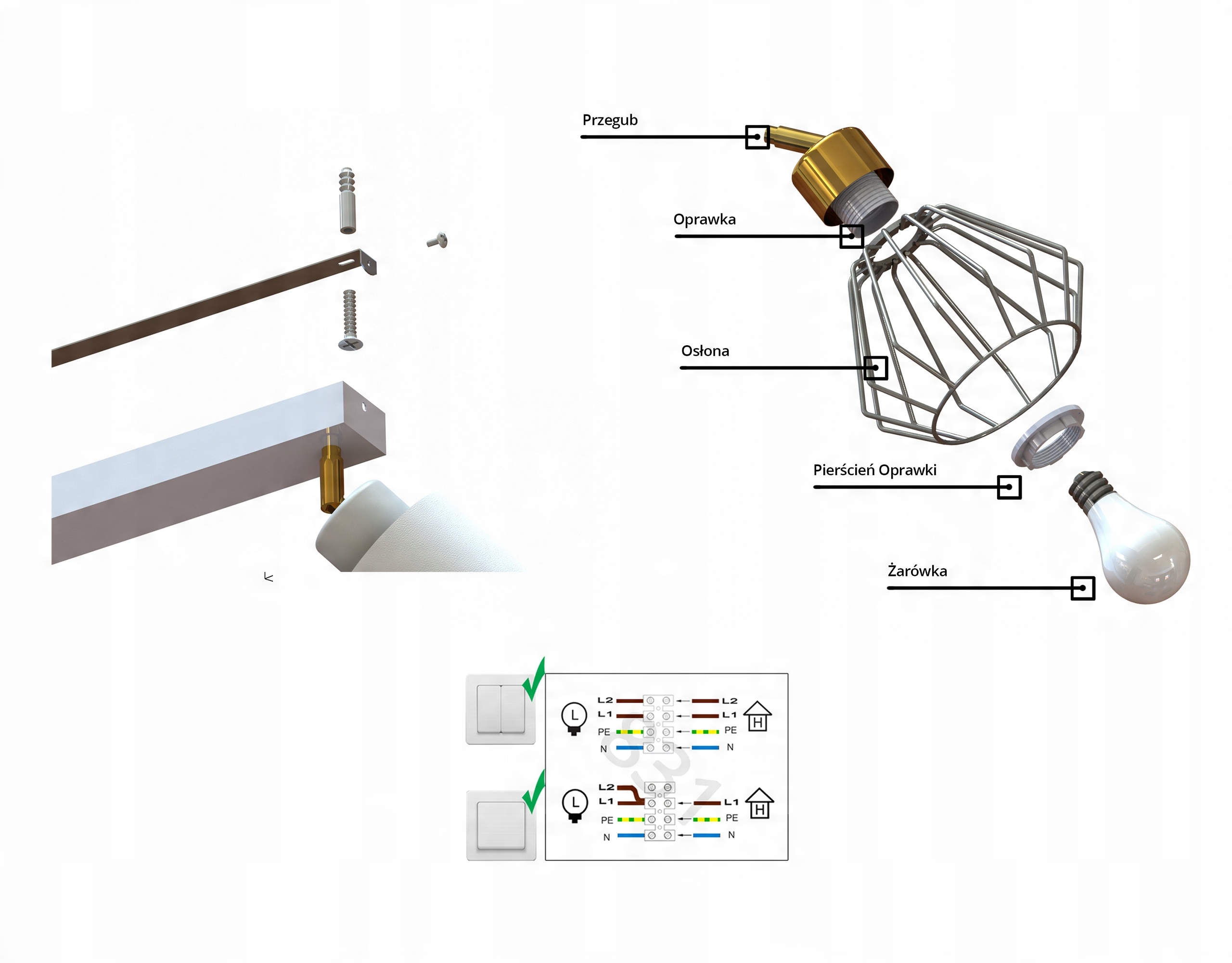 Zestaw nie zawiera żarówek ani kołków rozporowych (należy dobrać odpowiednie do sufitu)