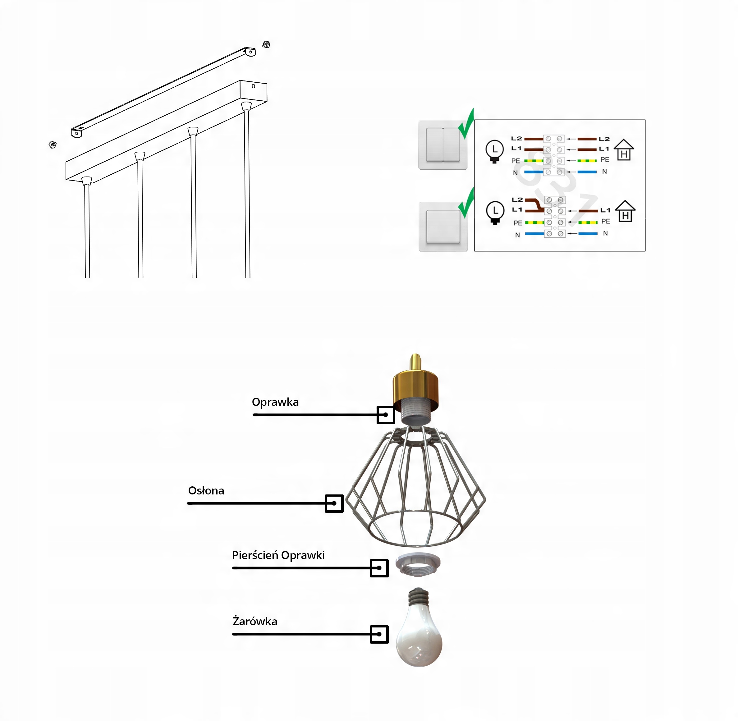 Zestaw nie zawiera żarówek ani kołków rozporowych (należy dobrać odpowiednie do sufitu)