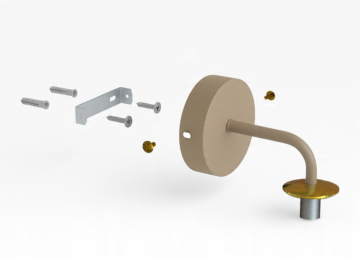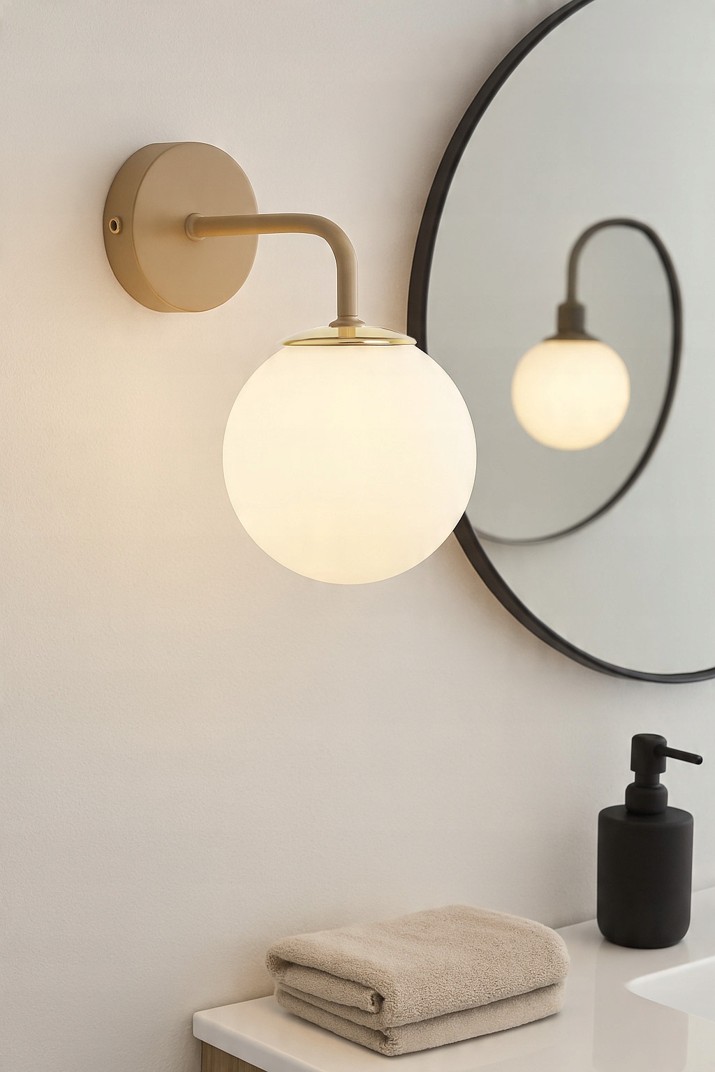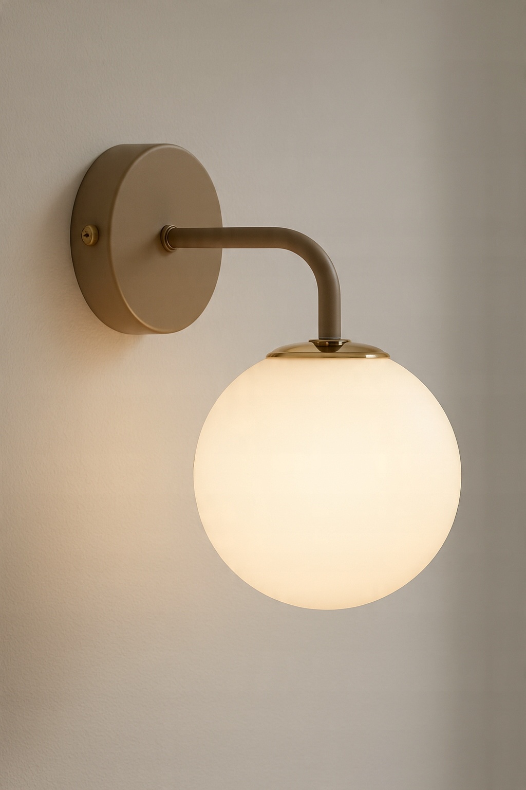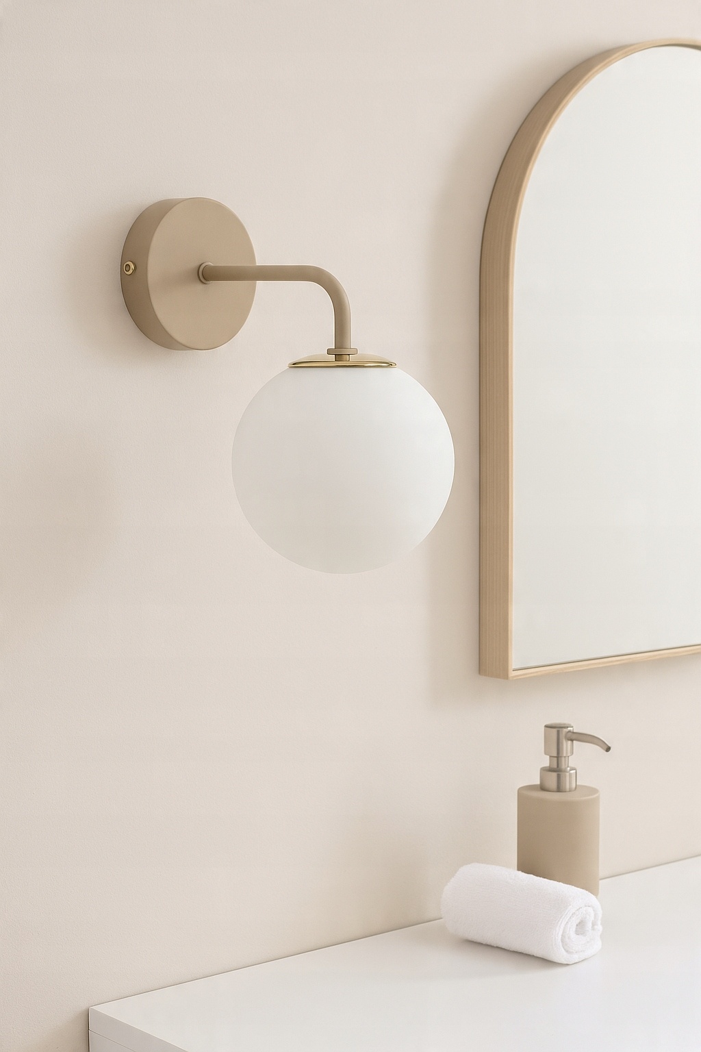 Stylowy i subtelny kinkiet, który idealnie łączy elegancję z funkcjonalnością. Nowoczesna forma, inspirowana stylem mid-century modern, sprawia, że oprawa doskonale odnajdzie się zarówno w klasycznych, jak i współczesnych aranżacjach. Matowa, beżowa konstrukcja w połączeniu z mlecznym, szklanym kloszem i złotym wykończeniem tworzy harmonijną kompozycję, która podkreśli charakter każdego wnętrza.