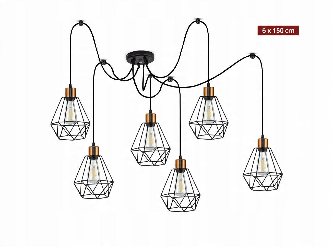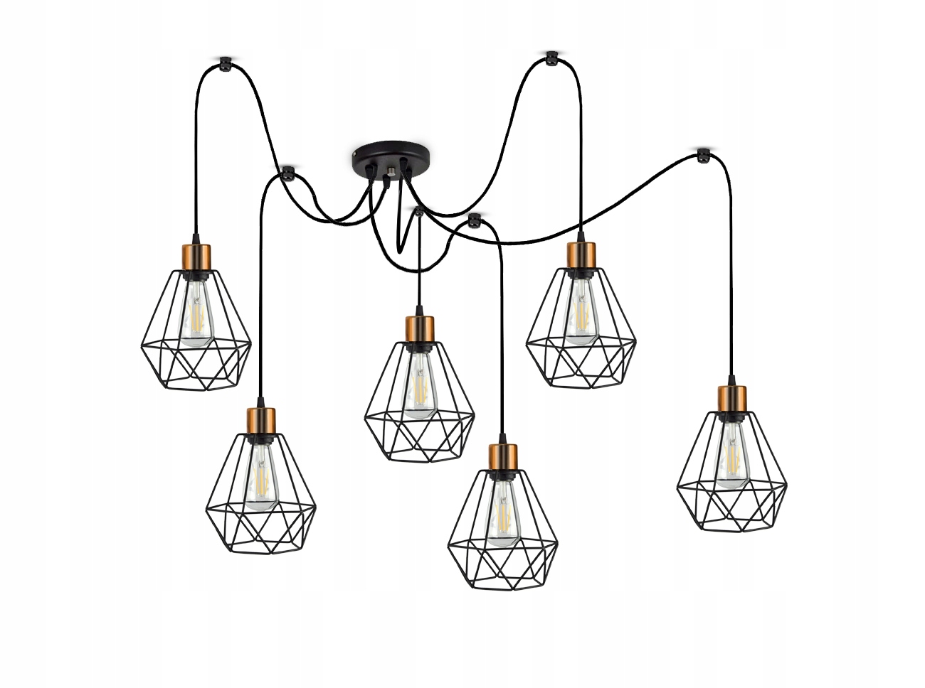Designerska lampa wisząca PAJĄK wyposażona w Sześć drucianych osłon DIAMENT - idealna do salonu, dużego pokoju czy jadalni.