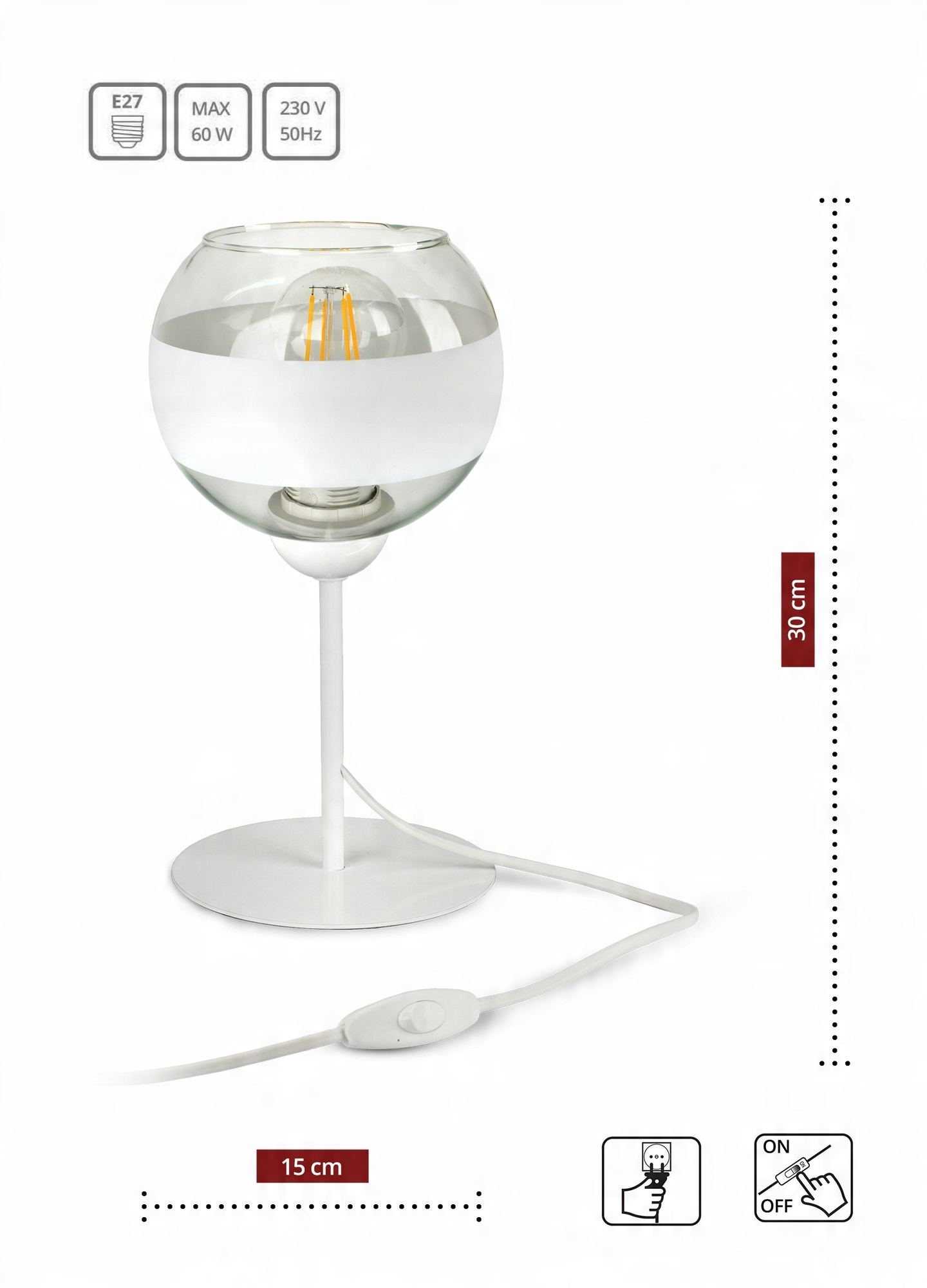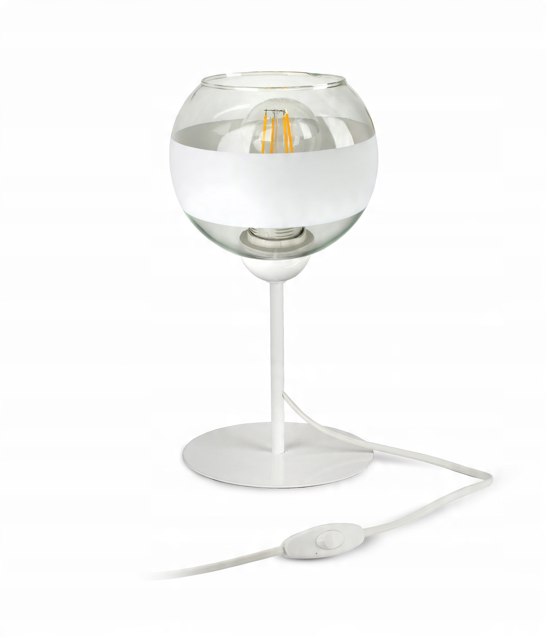 ✅ Lampa wyposażona w szklany klosz w kształcie kuli z białym pasem w części centralnej.